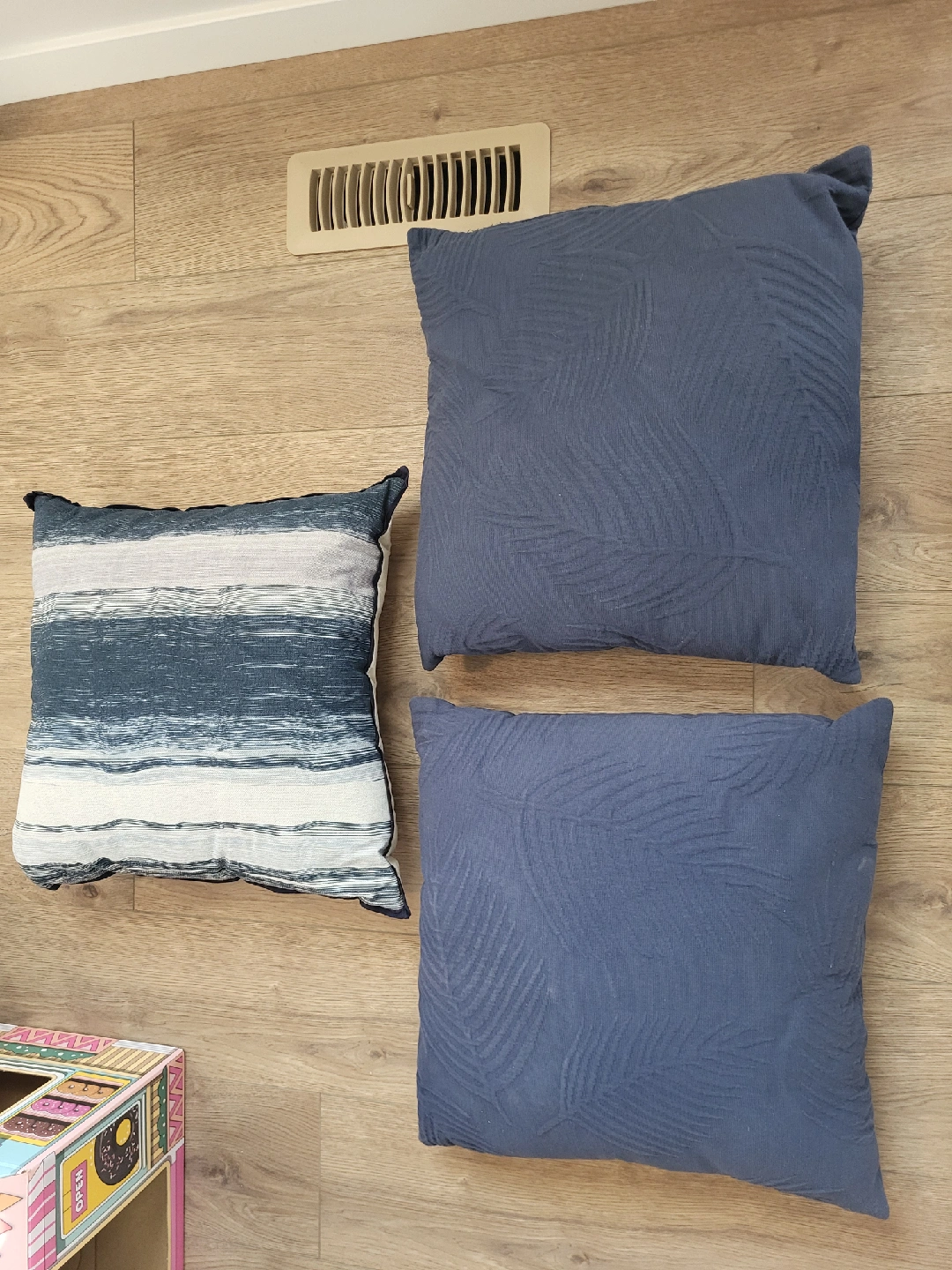 A set of assorted throw pillows, perfect for adding a touch of comfort and style to your living space! There are two blue pillows with a subtle leaf pattern and one striped pillow with various shades of blue, white & lavender.