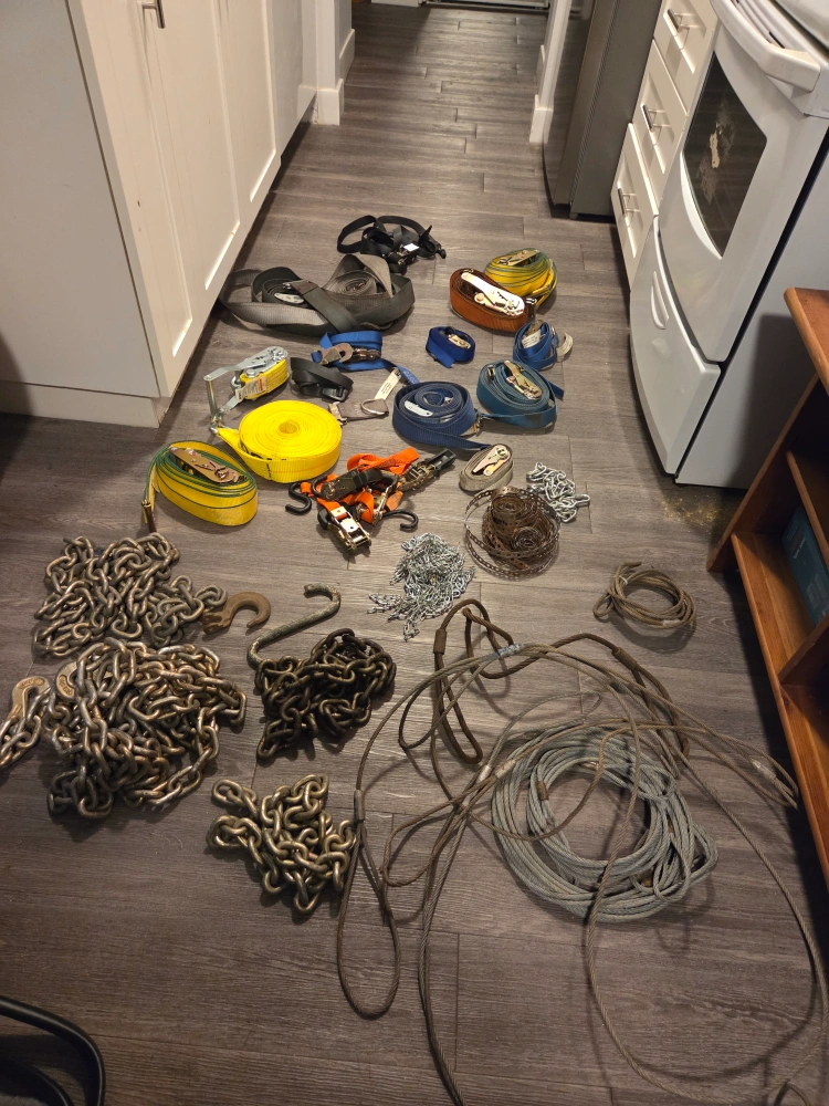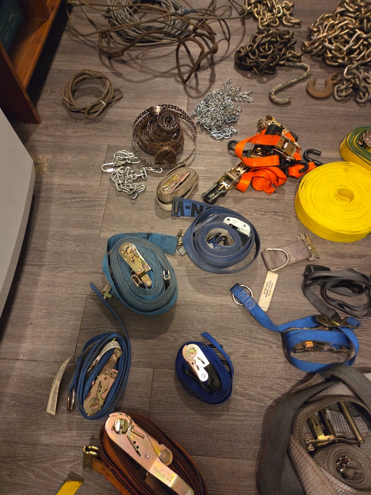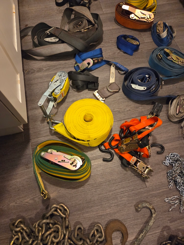 Selling a collection of tie-down straps and chains. Great for securing cargo or other heavy items. Includes various sizes and styles. My cell phone number is 604 830 6966.
