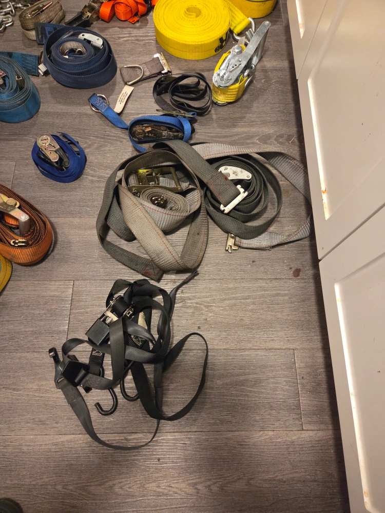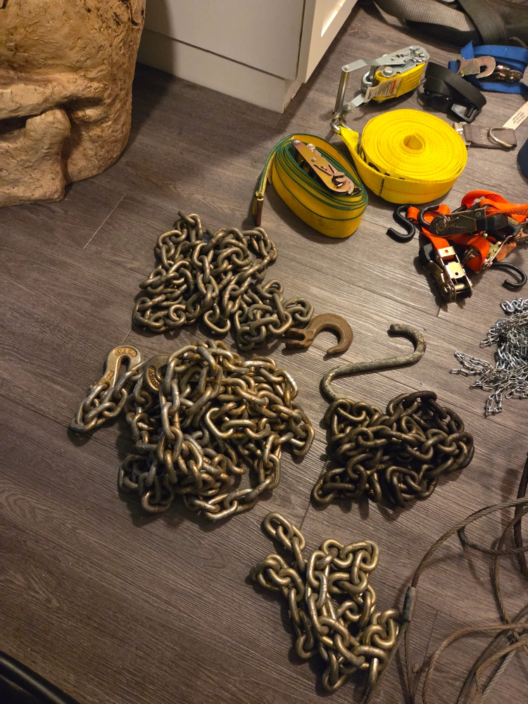 Selling a collection of tie-down straps and chains. Great for securing cargo or other heavy items. Includes various sizes and styles. My cell phone number is 604 830 6966.