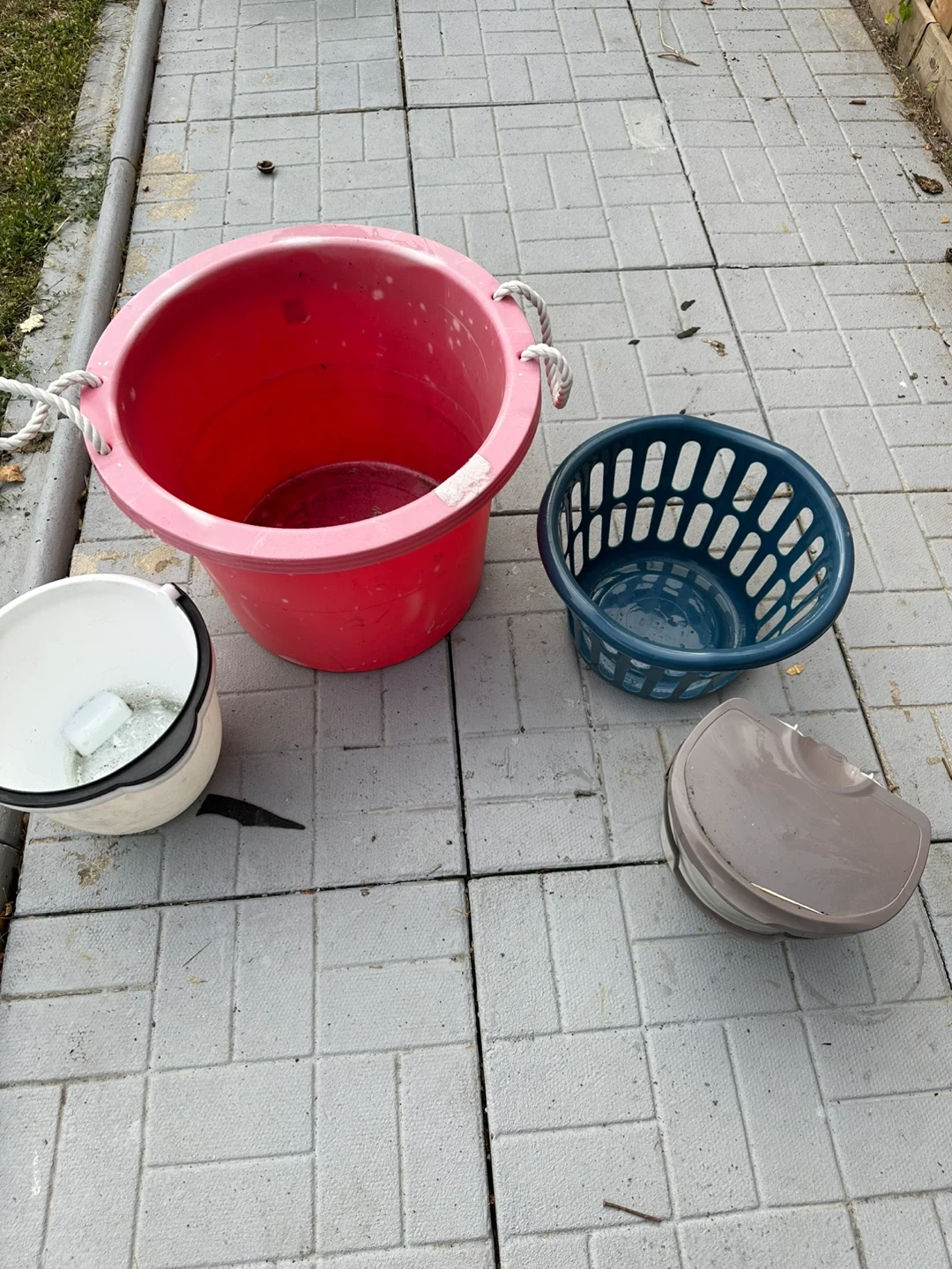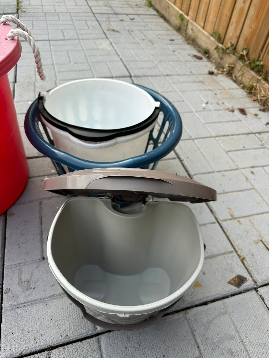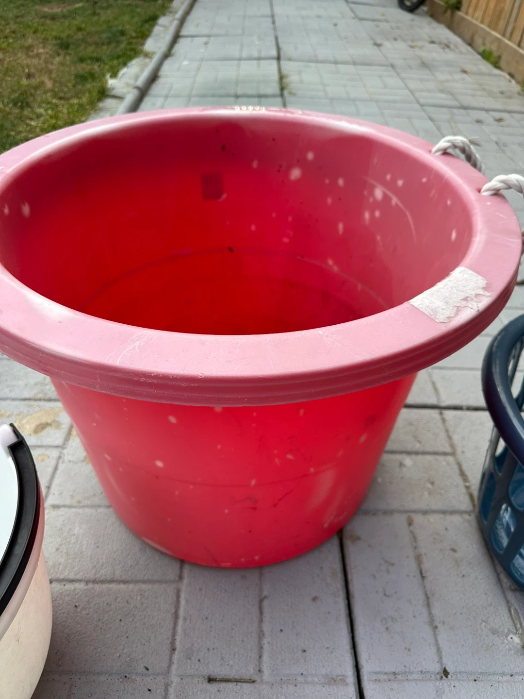 Selling an assortment of used buckets and a laundry basket. They're all different colours and sizes. Perfect for various household tasks or storage needs