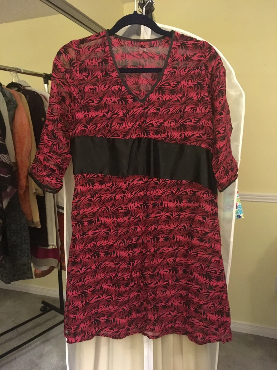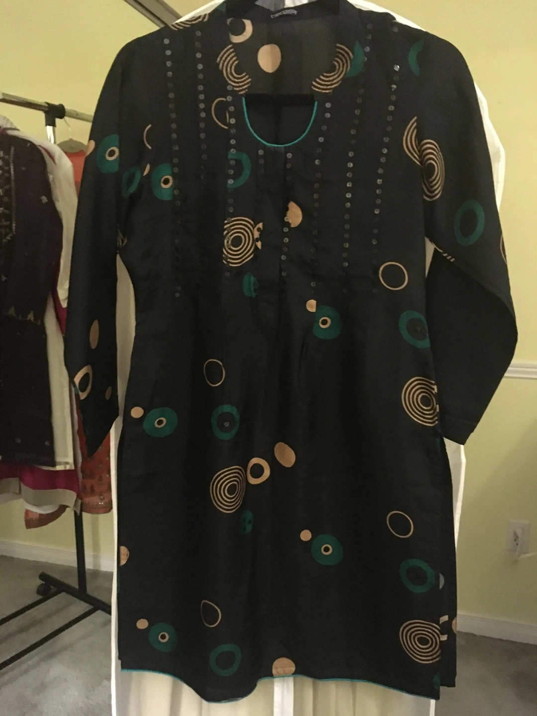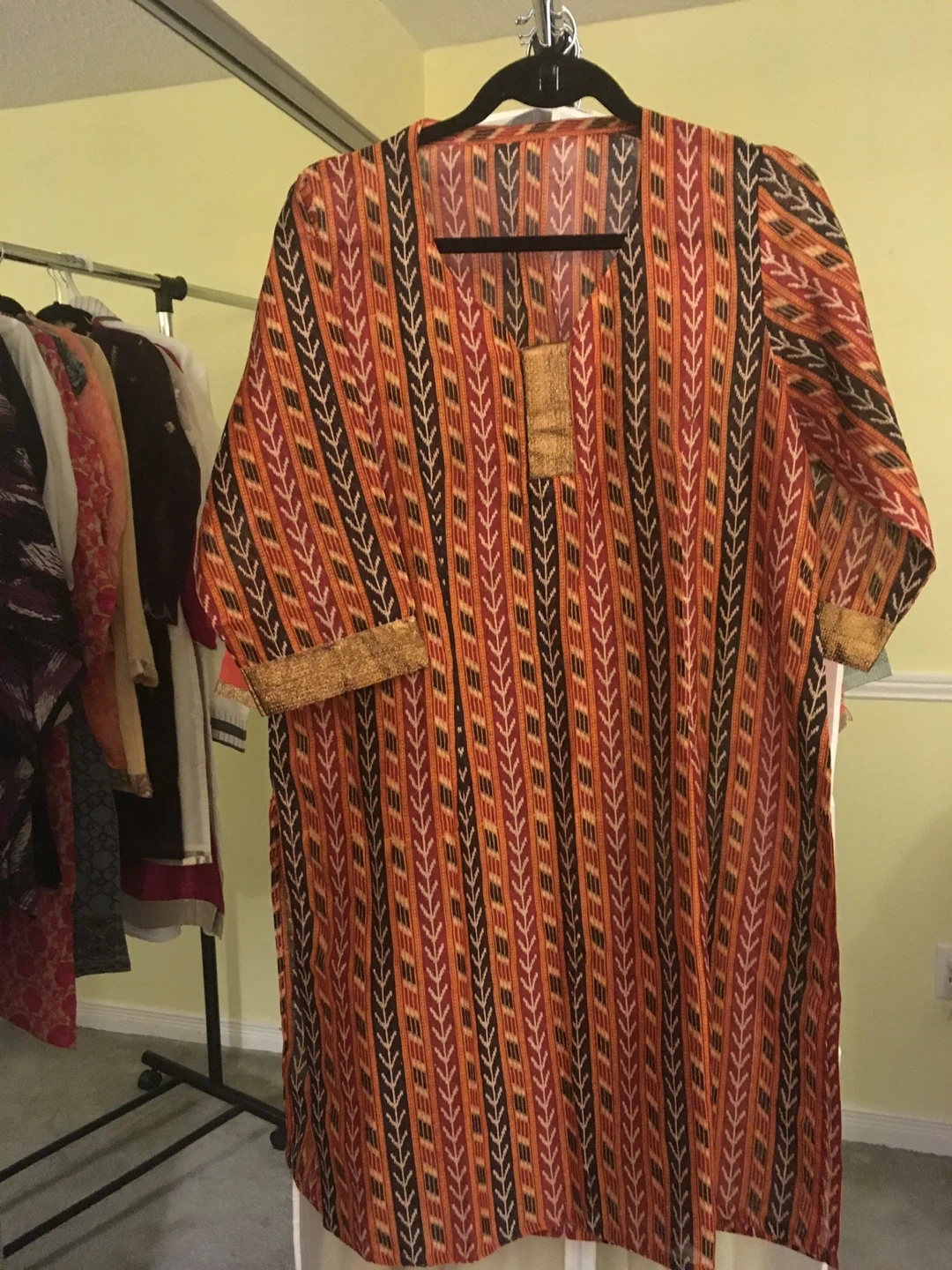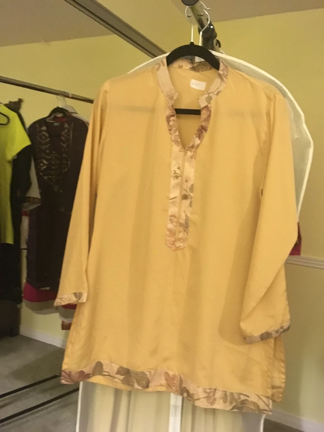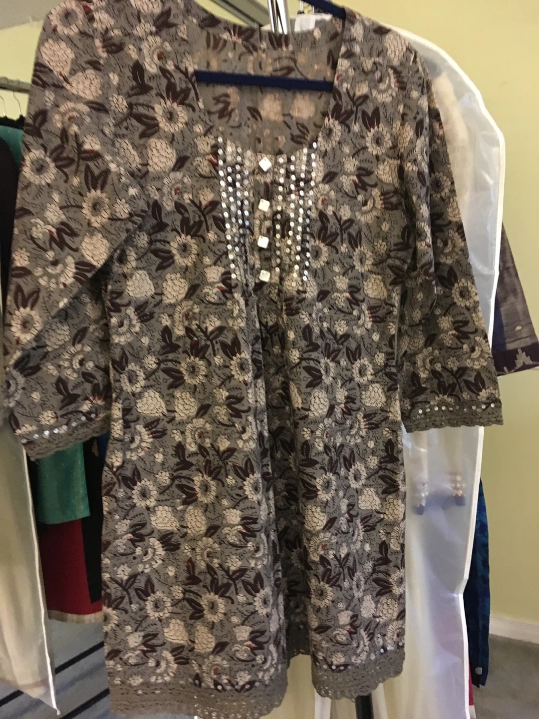 A selection of women's clothing items, including a teal blouse with gold embellishments and other dresses and tops in various colors and patterns