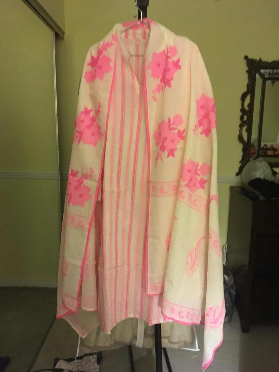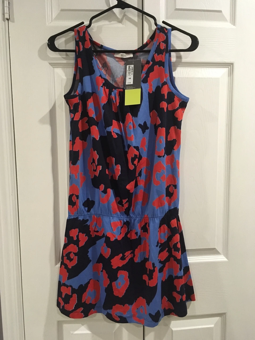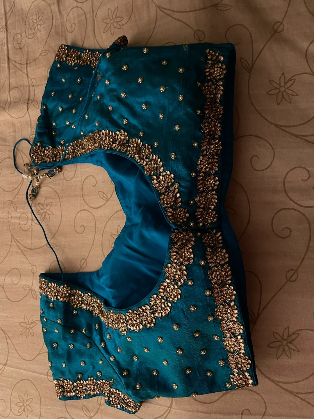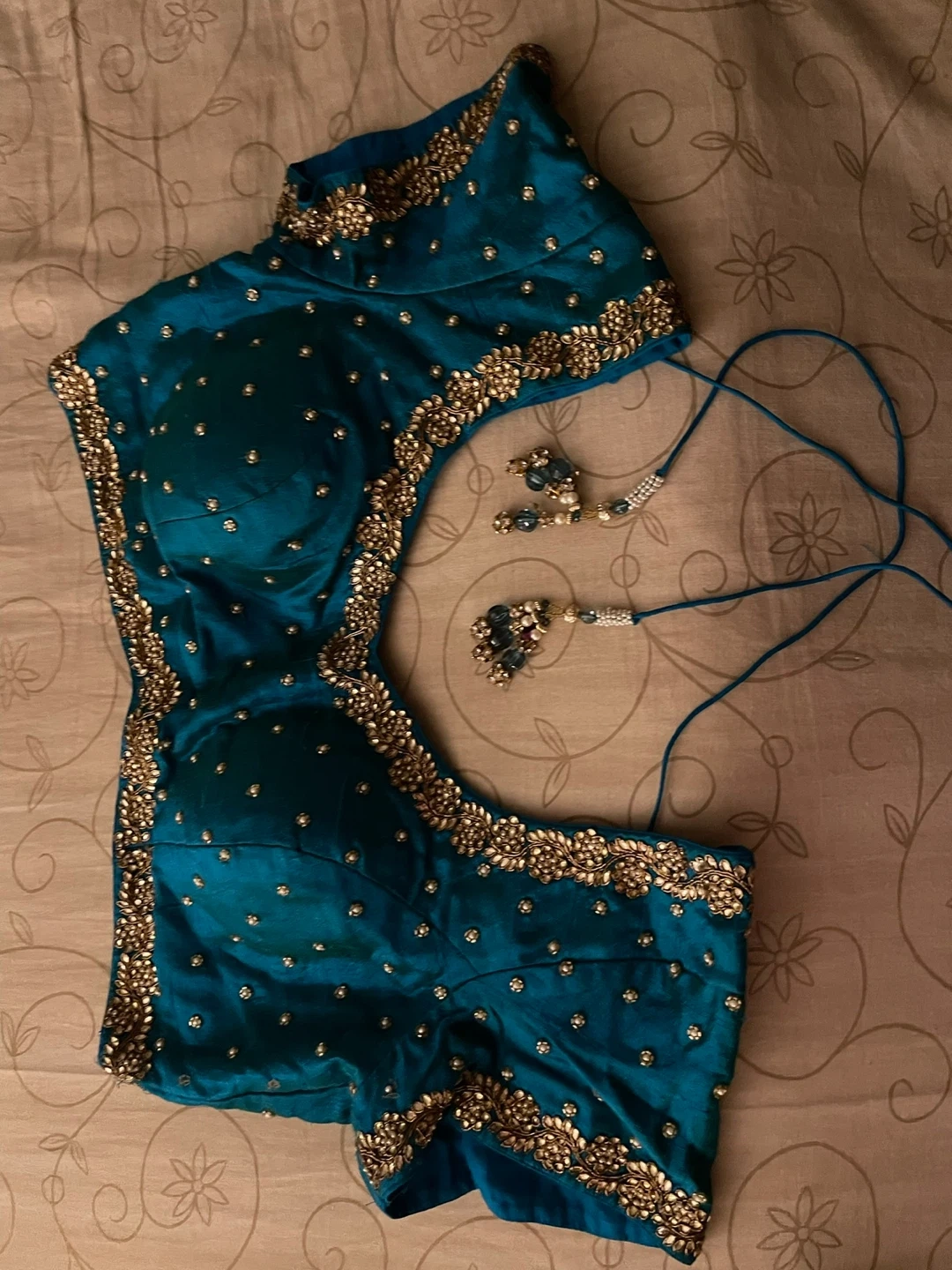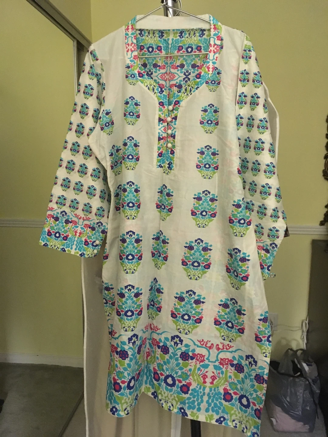 A selection of women's clothing items, including a teal blouse with gold embellishments and other dresses and tops in various colors and patterns