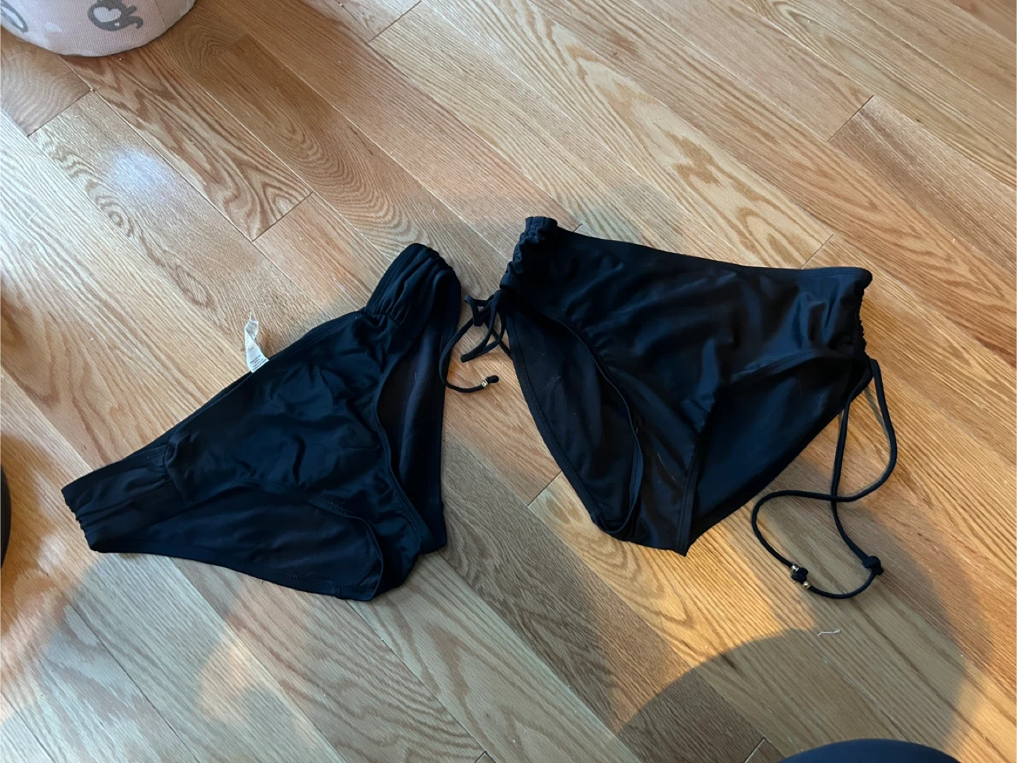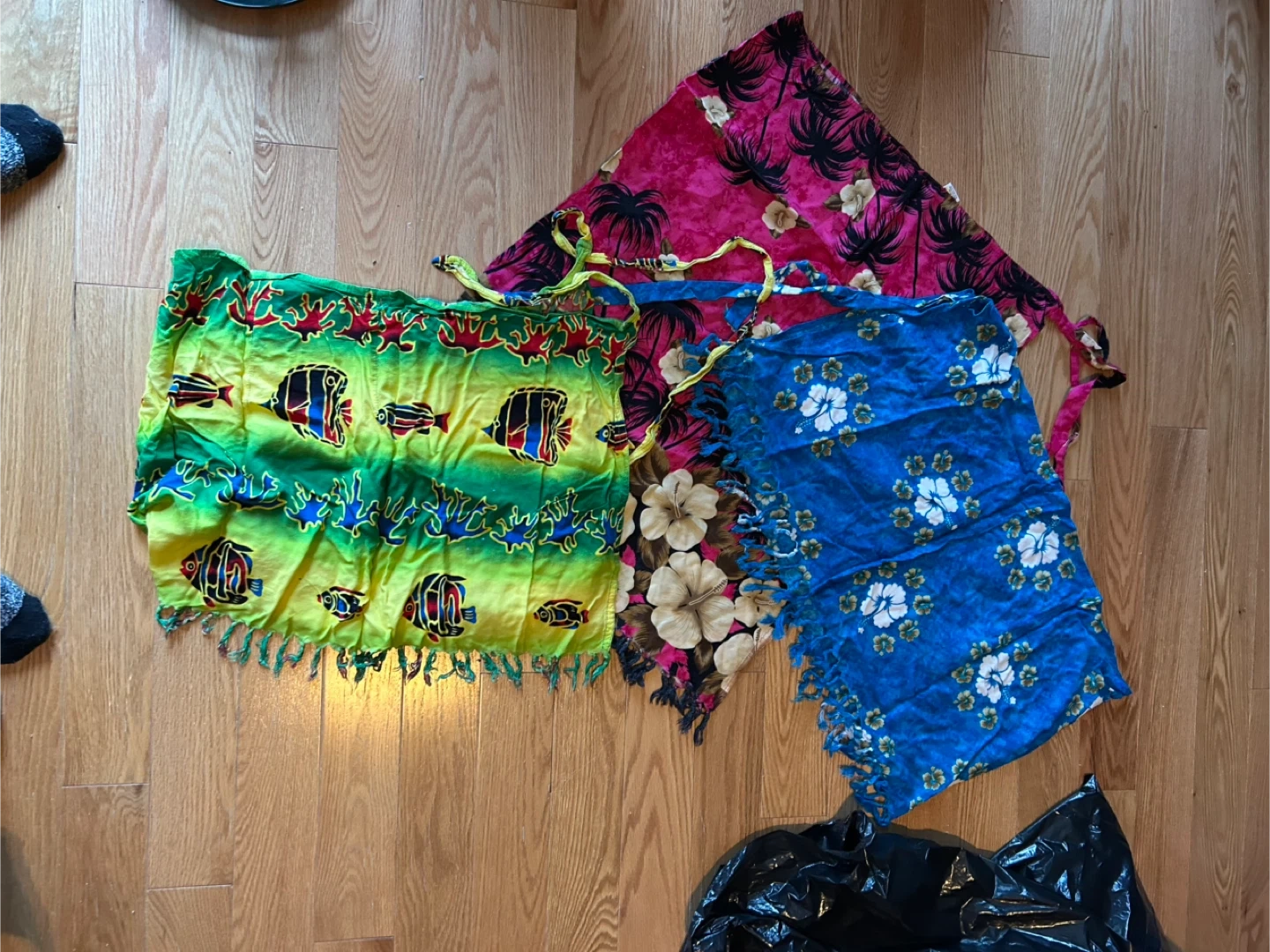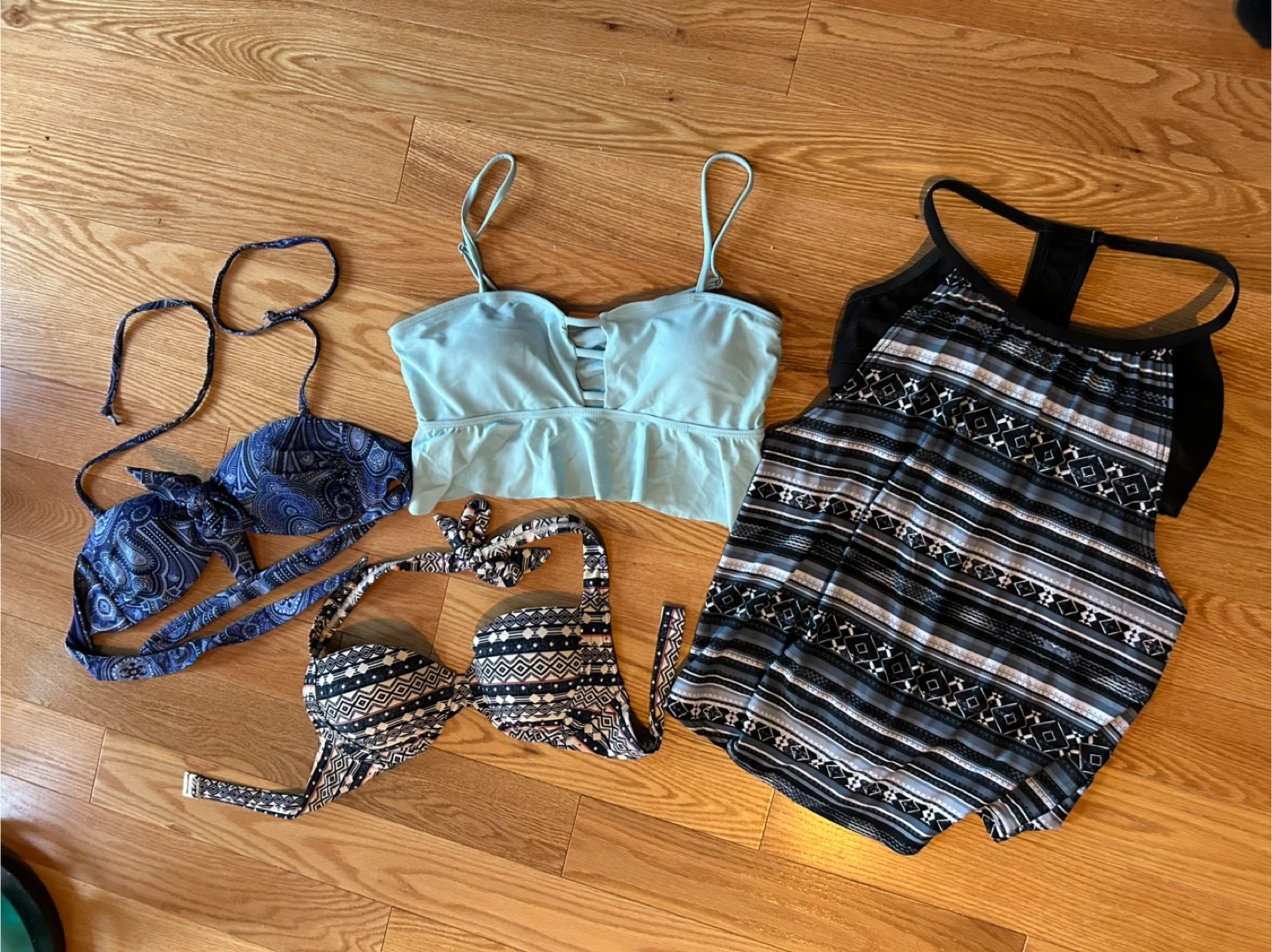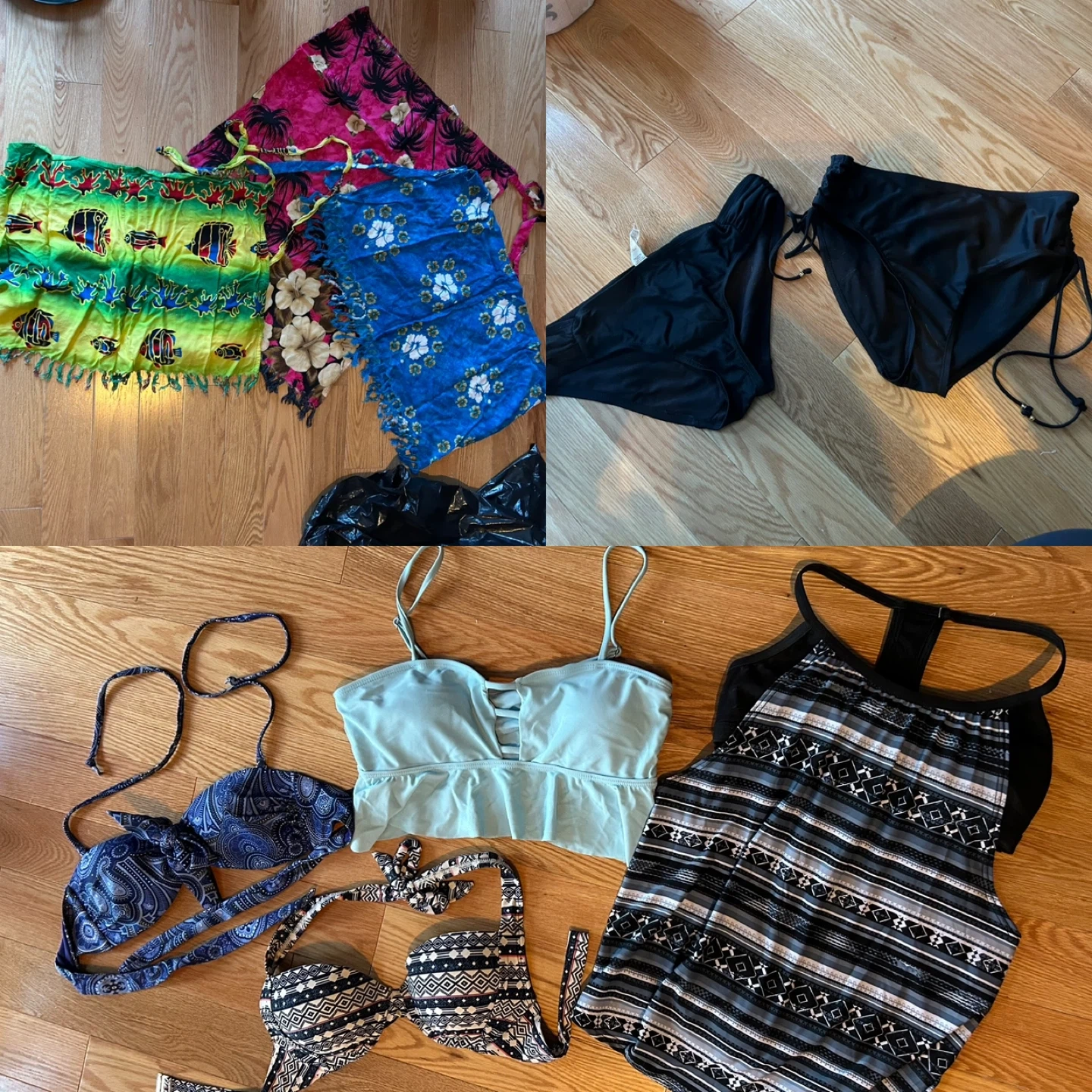 Assorted women's swimwear bundle. Includes two black bikini bottoms, three sarongs with tropical prints, a blue halter bikini top, a patterned bikini top, and a patterned tankini top. Great for summer! Swim tops- light blue medium, dark blue size 6, other 2 size small $4 each Swim bottoms medium $ 2each Swim wraps $2 each (Will sell all for $15)