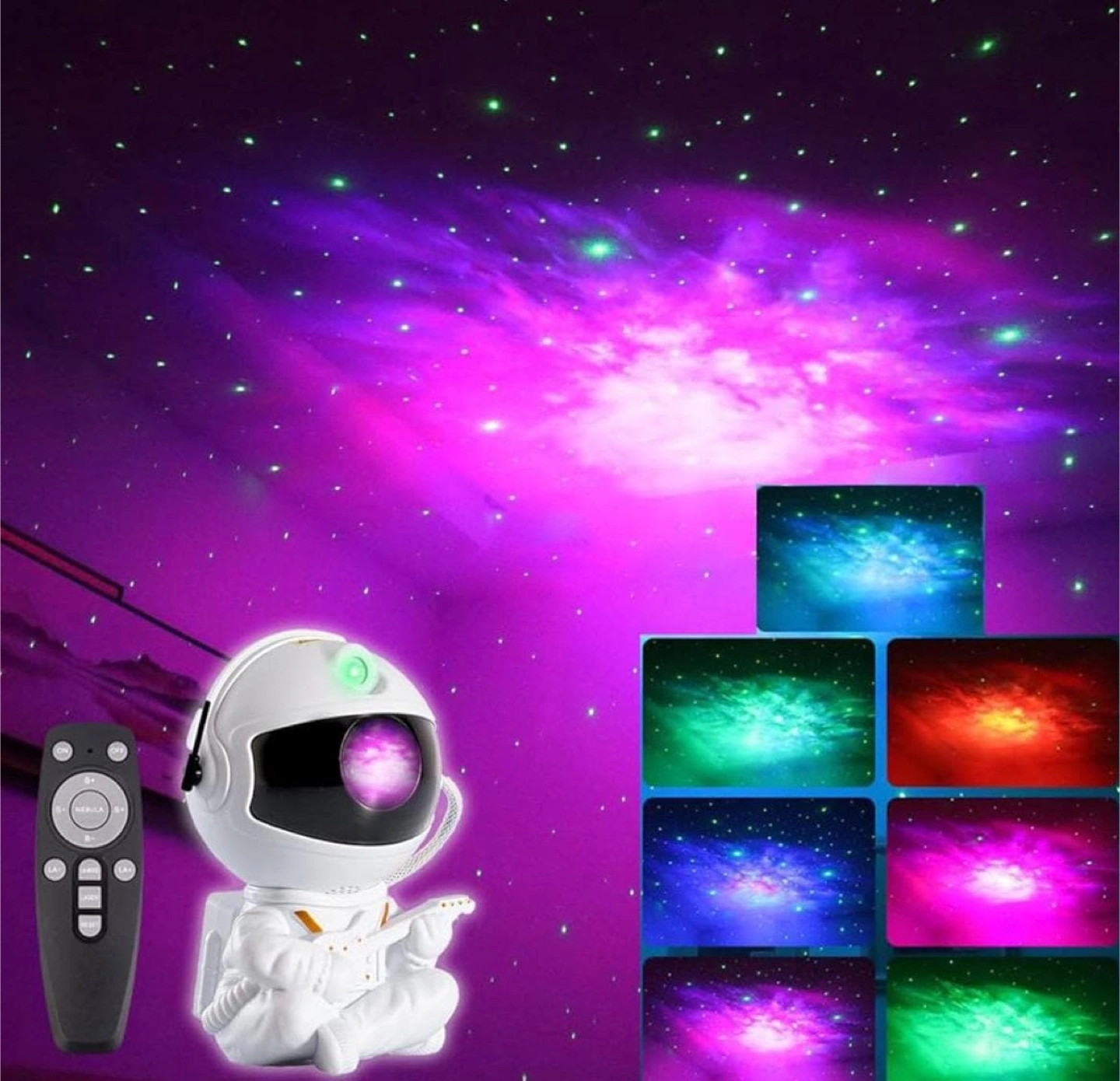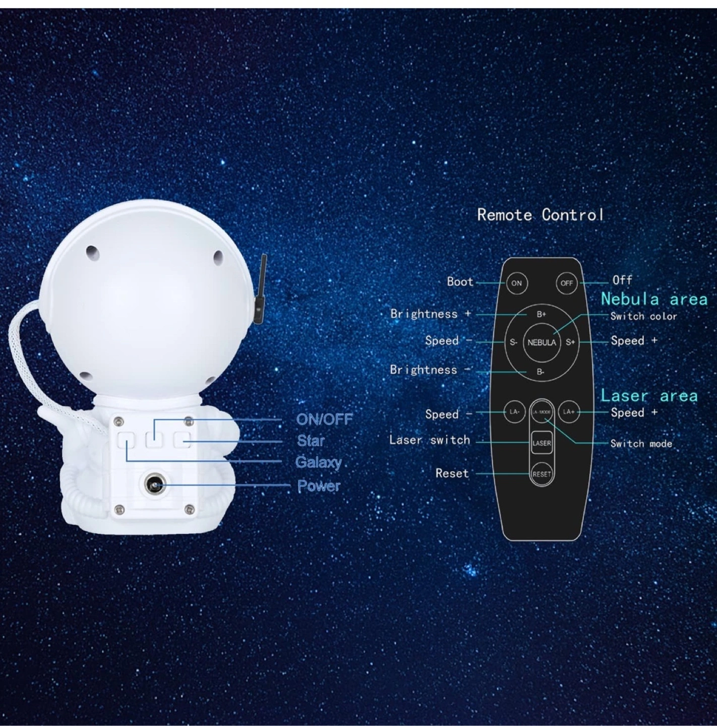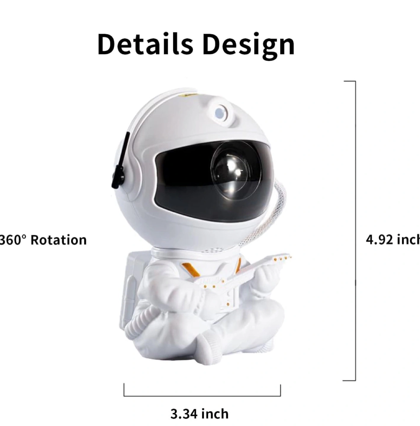 Adorable astronaut design. Projects nebula and stars onto ceilings and walls. Includes remote control for easy operation. Multiple colour options. 360-degree rotation.