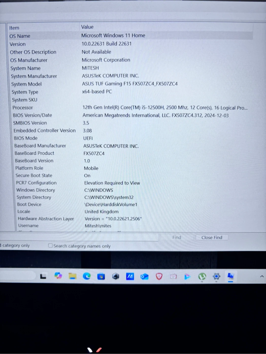 Selling an ASUS TUF Gaming F15 FX507ZC4 laptop. It has Microsoft Windows 11 Home and a 12th Gen Intel(R) Core(TM) i5-12500H processor. It also has 16 GB of installed physical memory.