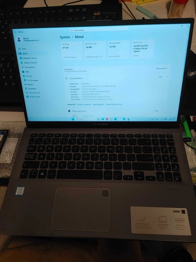 ASUS X512FA VivoBook. Processor Intel(R) Core(TM) i5-8265U CPU @ 1.60GHz 1.80 GHz, 512GB SSD - Grey, Intel UHD Graphics 620, Total Memory Slots: 2 (1 not upgradeable), Installed RAM: 12.0 GB, Windows 11 Home. Good condition. New battery. Light weight. Got too many computers, so I don't have time to use it. Sometimes can meet in 404 area. Screen Size: 15"