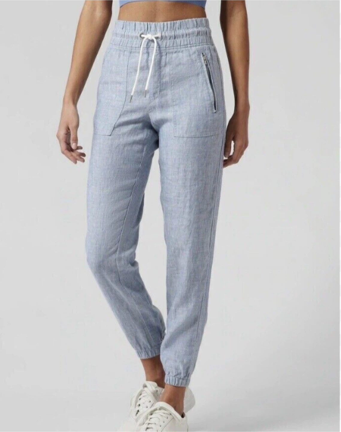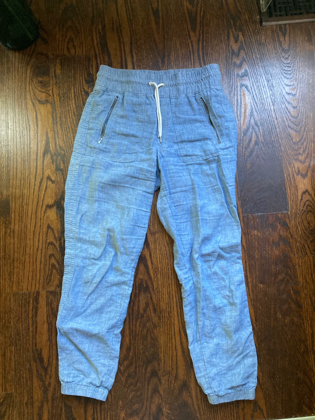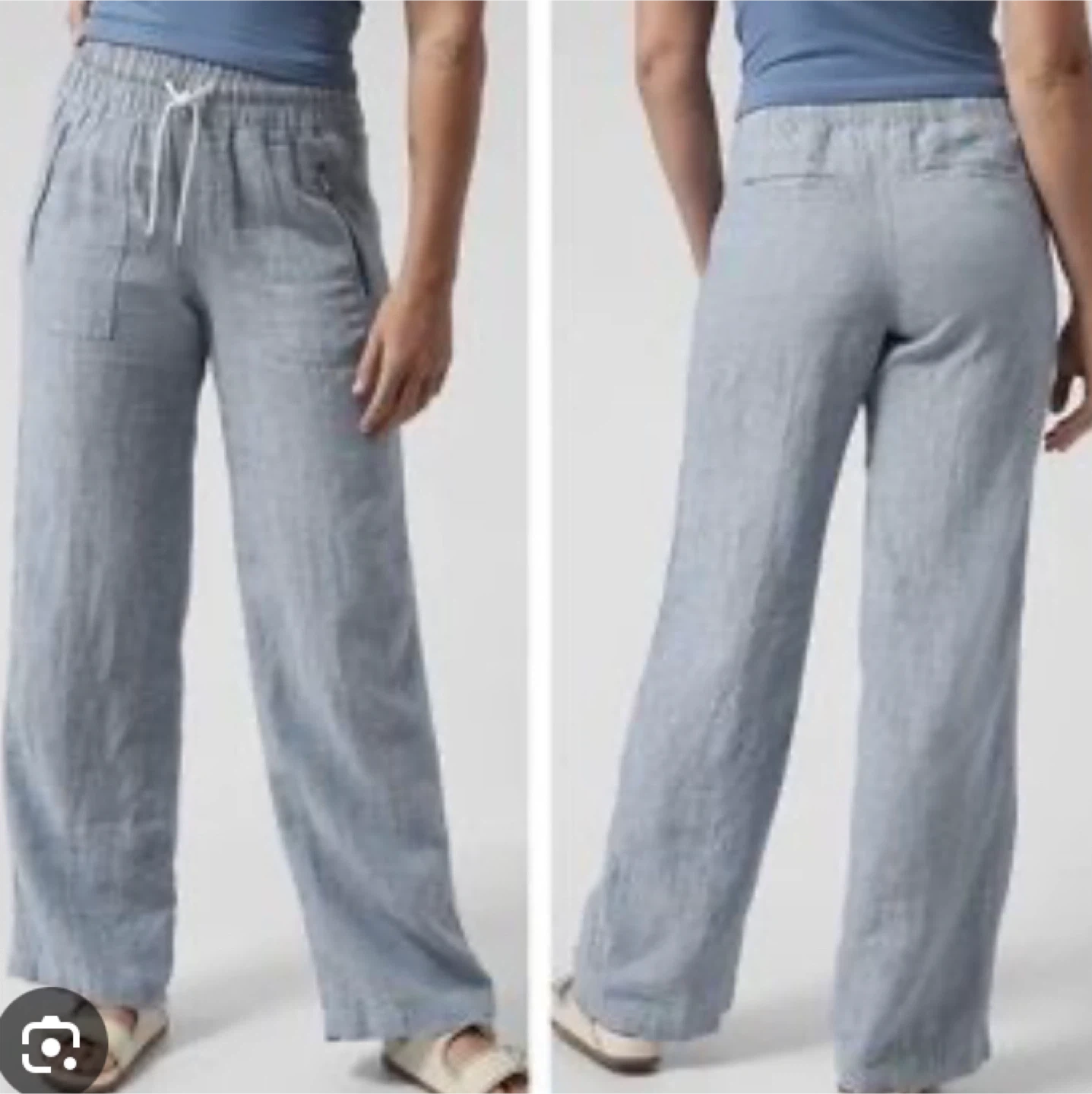 Athleta brand 100% linen pants. In great shape, no flaws. Light blue colour. Has pockets and a drawstring. Very comfy, great for warmer weather. Size 4. Sold out online. Retails for $40 USD +tax Cash only please. Pickup at Lululemon store at 2558 Yonge Street.
