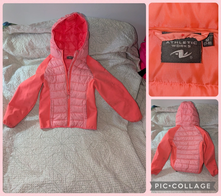 Selling a cute coral jacket from Athletic Works! It's a size M (7-8) and has a hood. Perfect for keeping your little one warm and stylish during cooler weather. There are some signs of wear, as shown in the photos