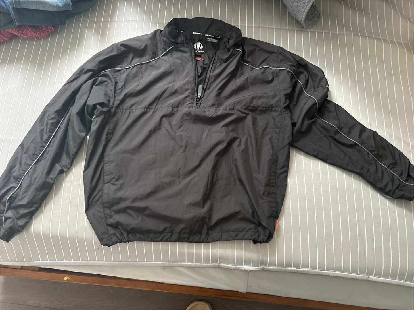 Selling a black Aurisco pullover jacket! It's in great condition and perfect for layering. The jacket features a quarter-zip design and reflective detailing.