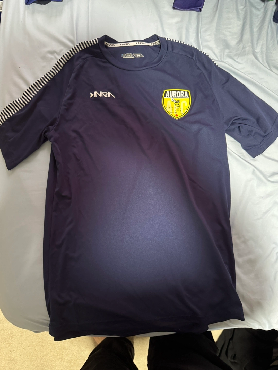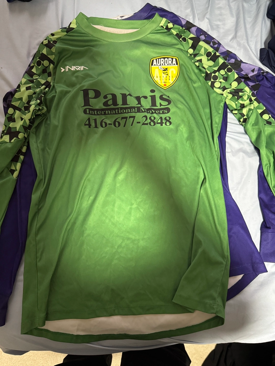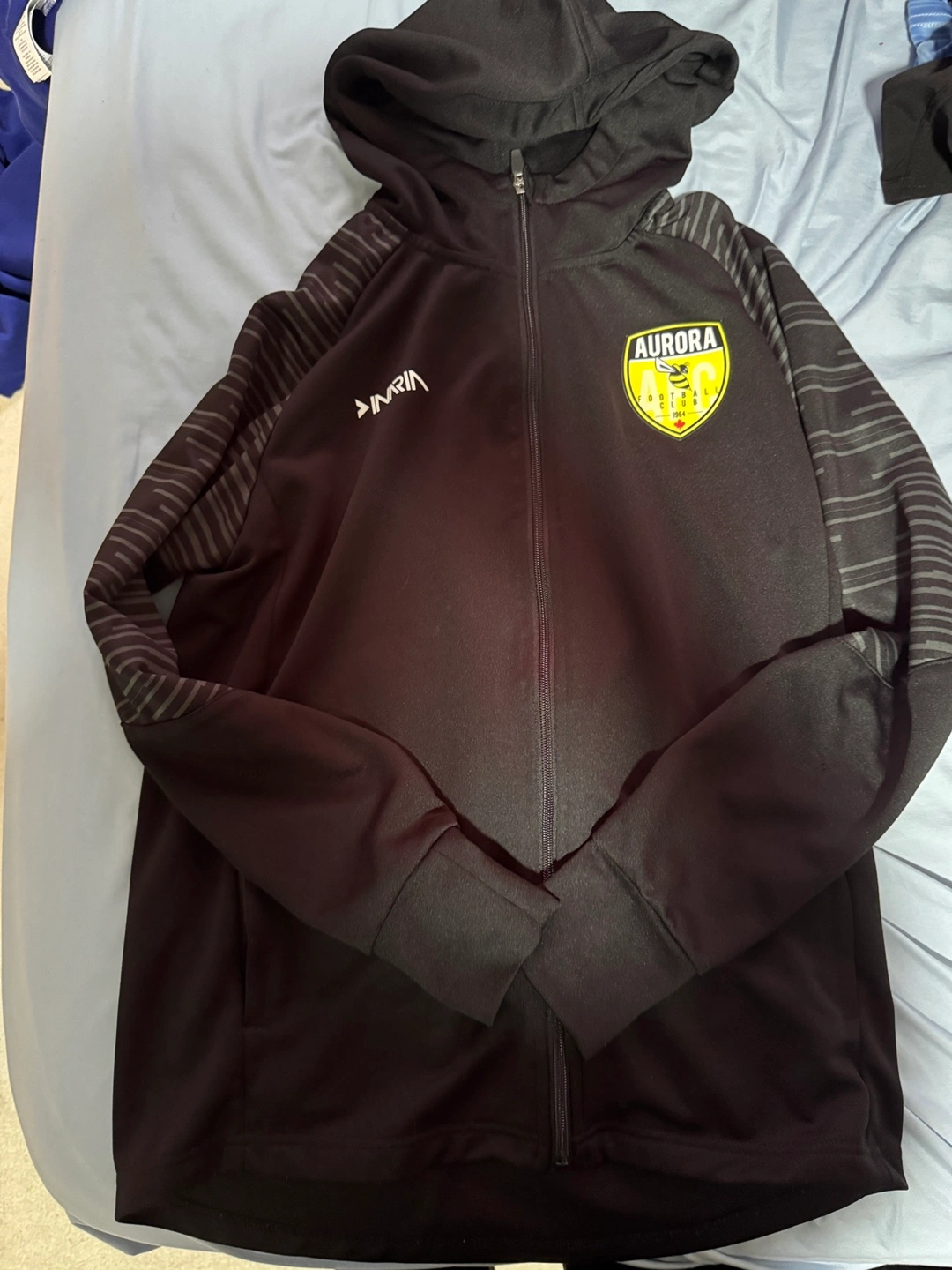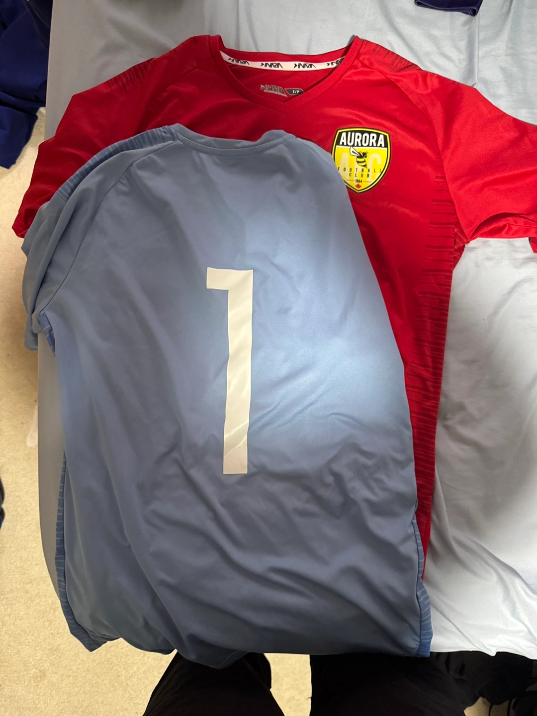 Assortment of Aurora Football Club apparel. Includes hoodie, short sleeve shirts, long sleeve goalkeeper jersey, and goalkeeper gloves. Various sizes and colours. Brands include Inaria and Adidas. 100 FOR EVERTHING This is well over 300+ dollars worth of stuff