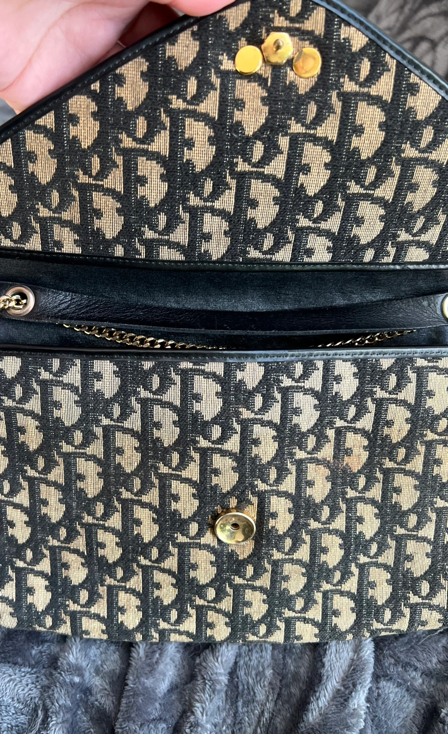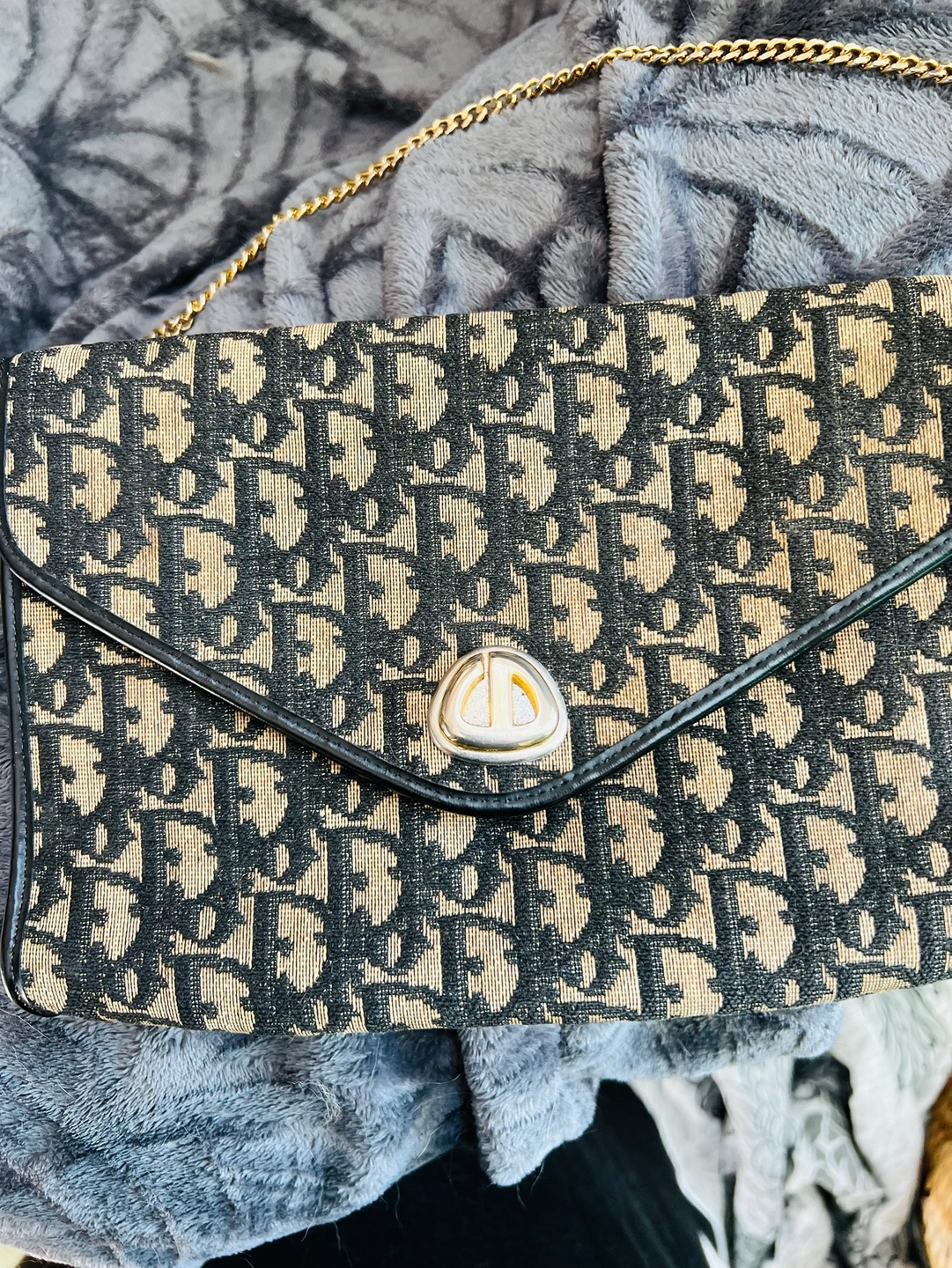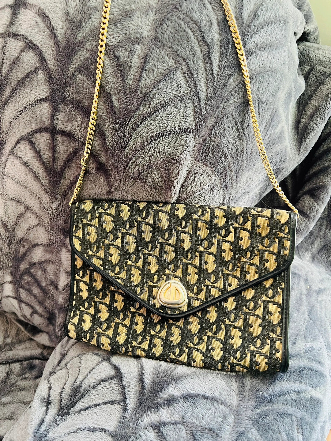 This vintage Christian Dior clutch handbag is a must-have for any fashion enthusiast. The monogrammed exterior and black lining give it a unique flair, while the gold hardware adds a touch of luxury. This clutch is perfect for any occasion and can hold all of your essentials. The snap closure keeps your belongings safe and secure. This clutch is pre-owned and has a few signs of wear, but it only adds to the vintage charm. It's a rare find from the 1970s and will make a great addition to your collection. The snap enclosure is finicky due to age and a dry cleaning will have it looking new. * smoke free home