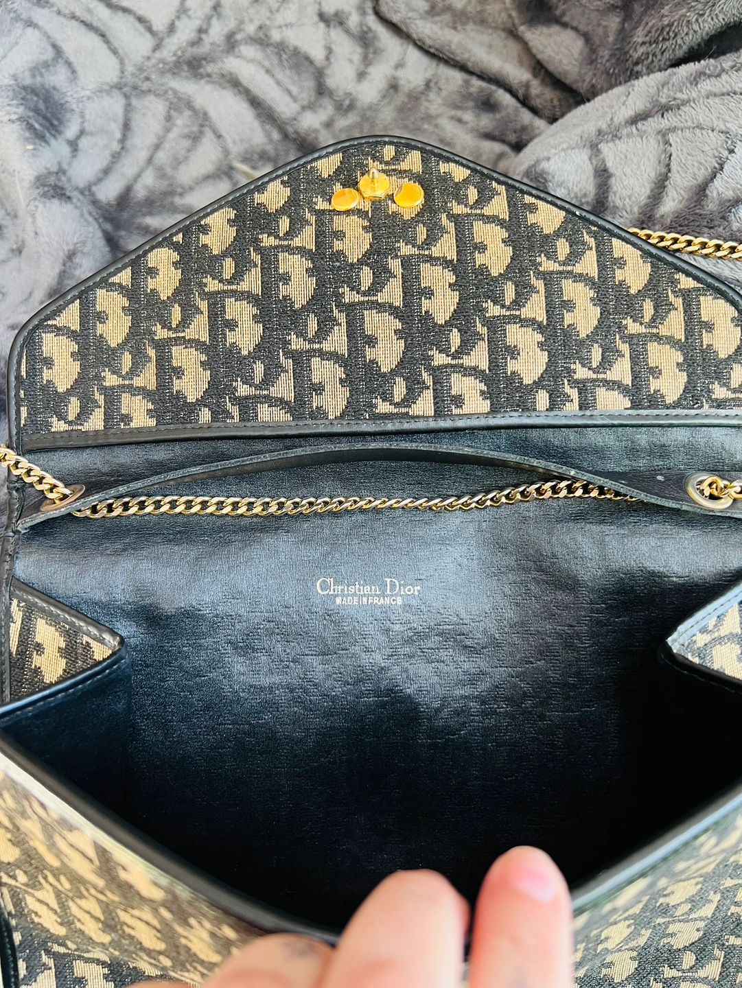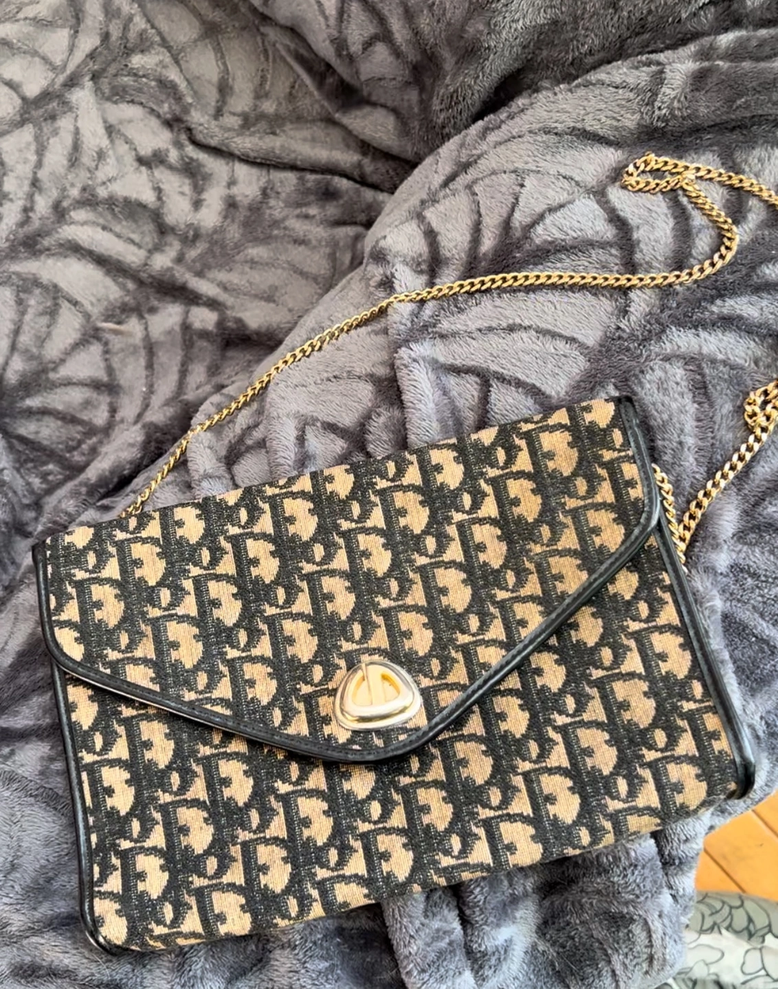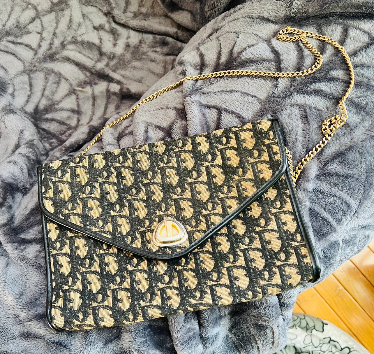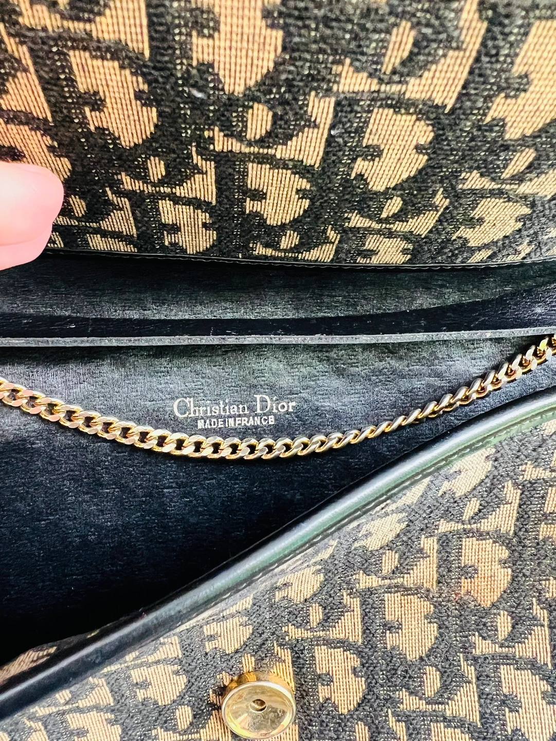 This vintage Christian Dior clutch handbag is a must-have for any fashion enthusiast. The monogrammed exterior and black lining give it a unique flair, while the gold hardware adds a touch of luxury. This clutch is perfect for any occasion and can hold all of your essentials. The snap closure keeps your belongings safe and secure. This clutch is pre-owned and has a few signs of wear, but it only adds to the vintage charm. It's a rare find from the 1970s and will make a great addition to your collection. The snap enclosure is finicky due to age and a dry cleaning will have it looking new. * smoke free home
