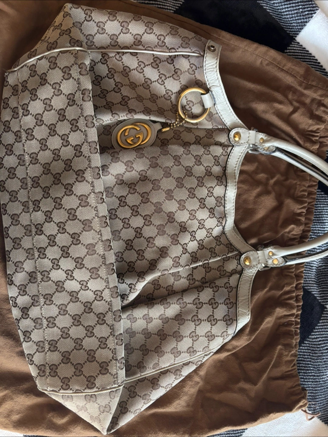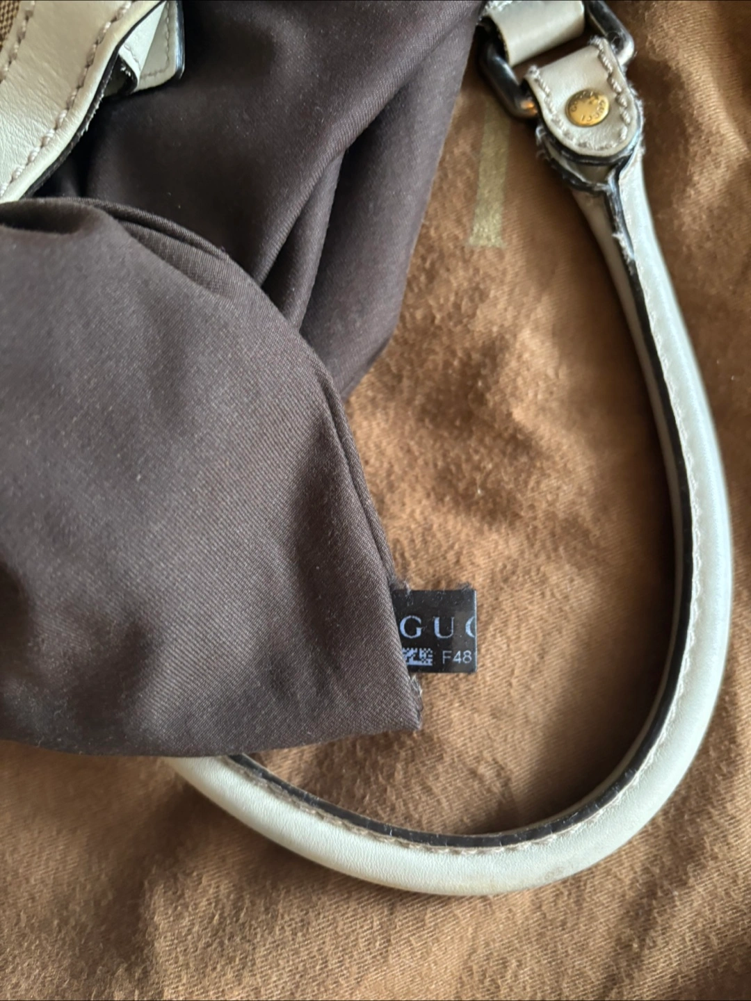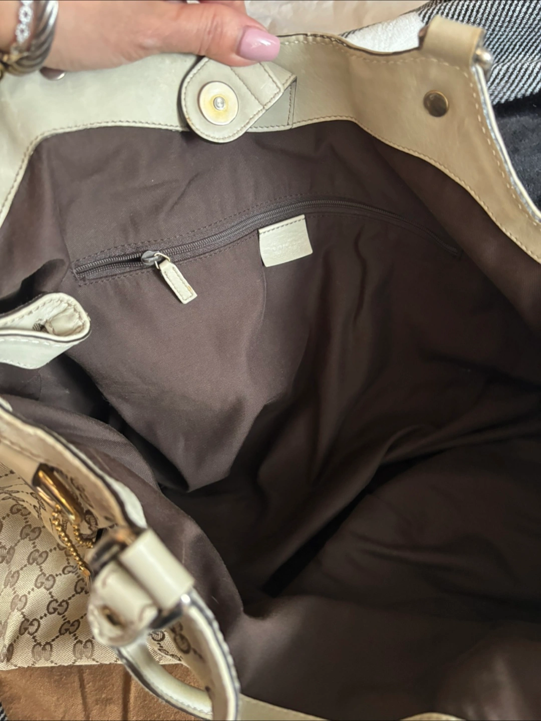 Pre-owned Gucci tote bag. Beige GG canvas exterior. Off-white leather trim. Double handles. Interior features a zip pocket. Comes with dust bag.