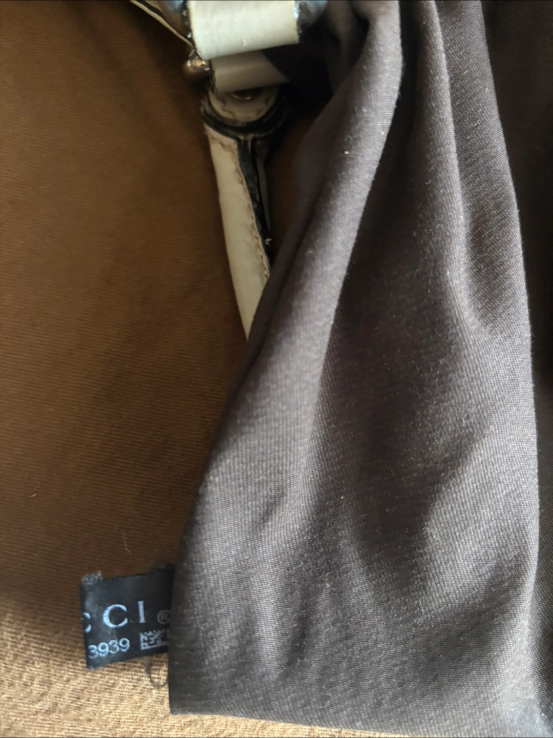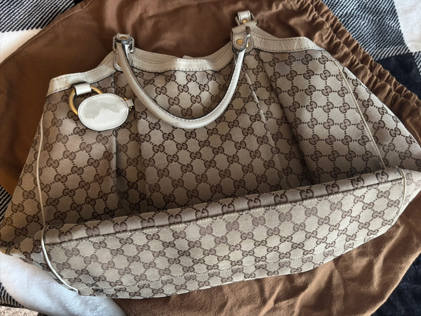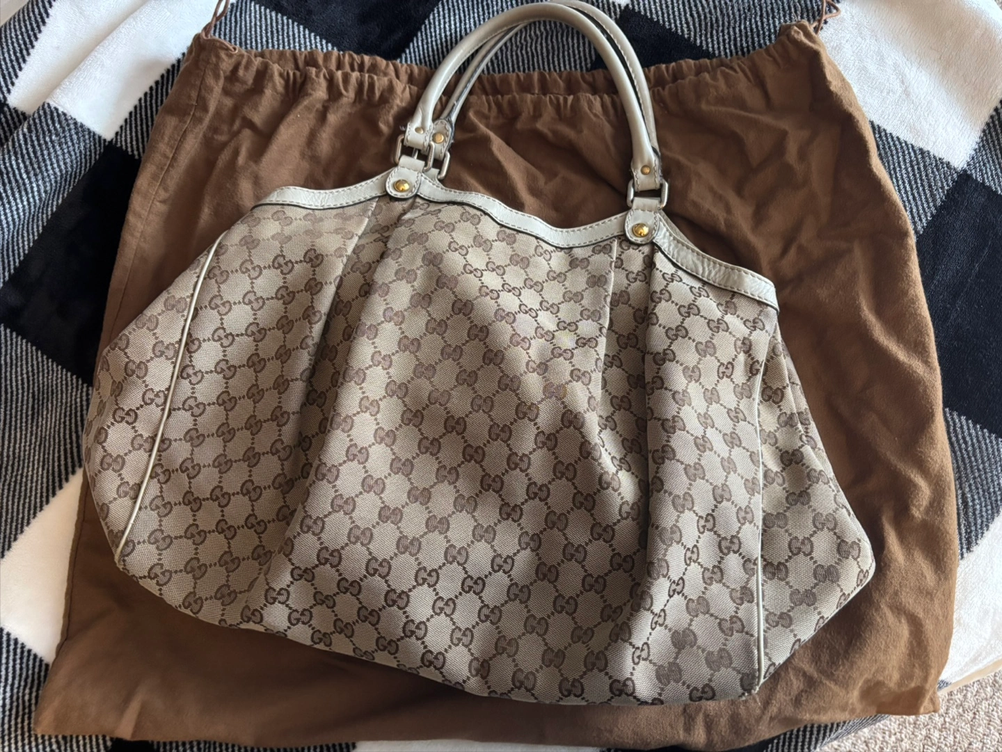 Pre-owned Gucci tote bag. Beige GG canvas exterior. Off-white leather trim. Double handles. Interior features a zip pocket. Comes with dust bag.