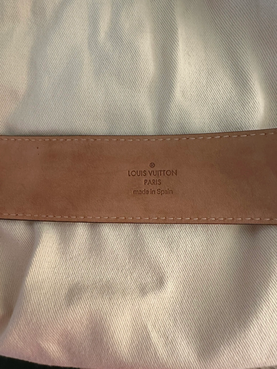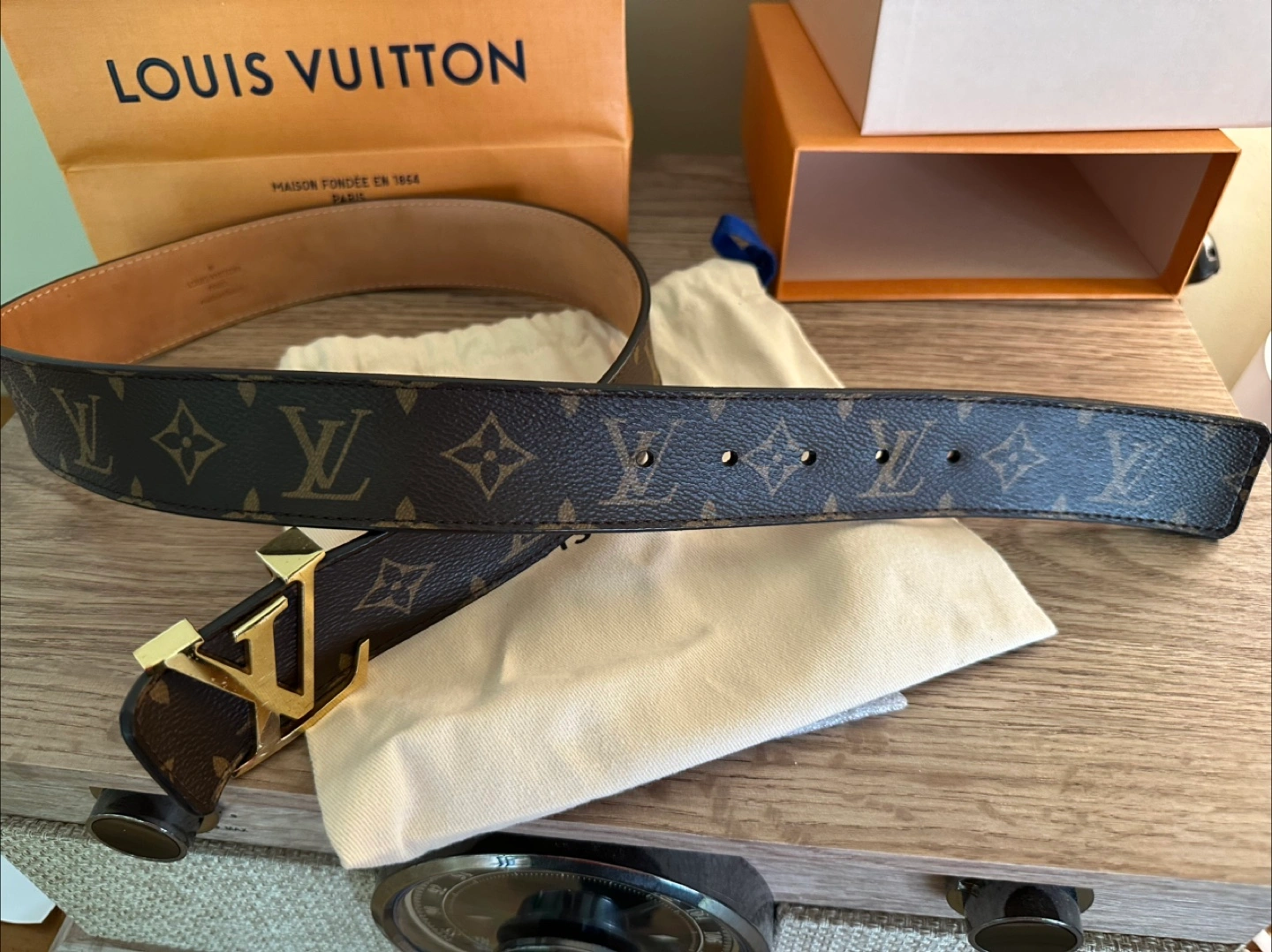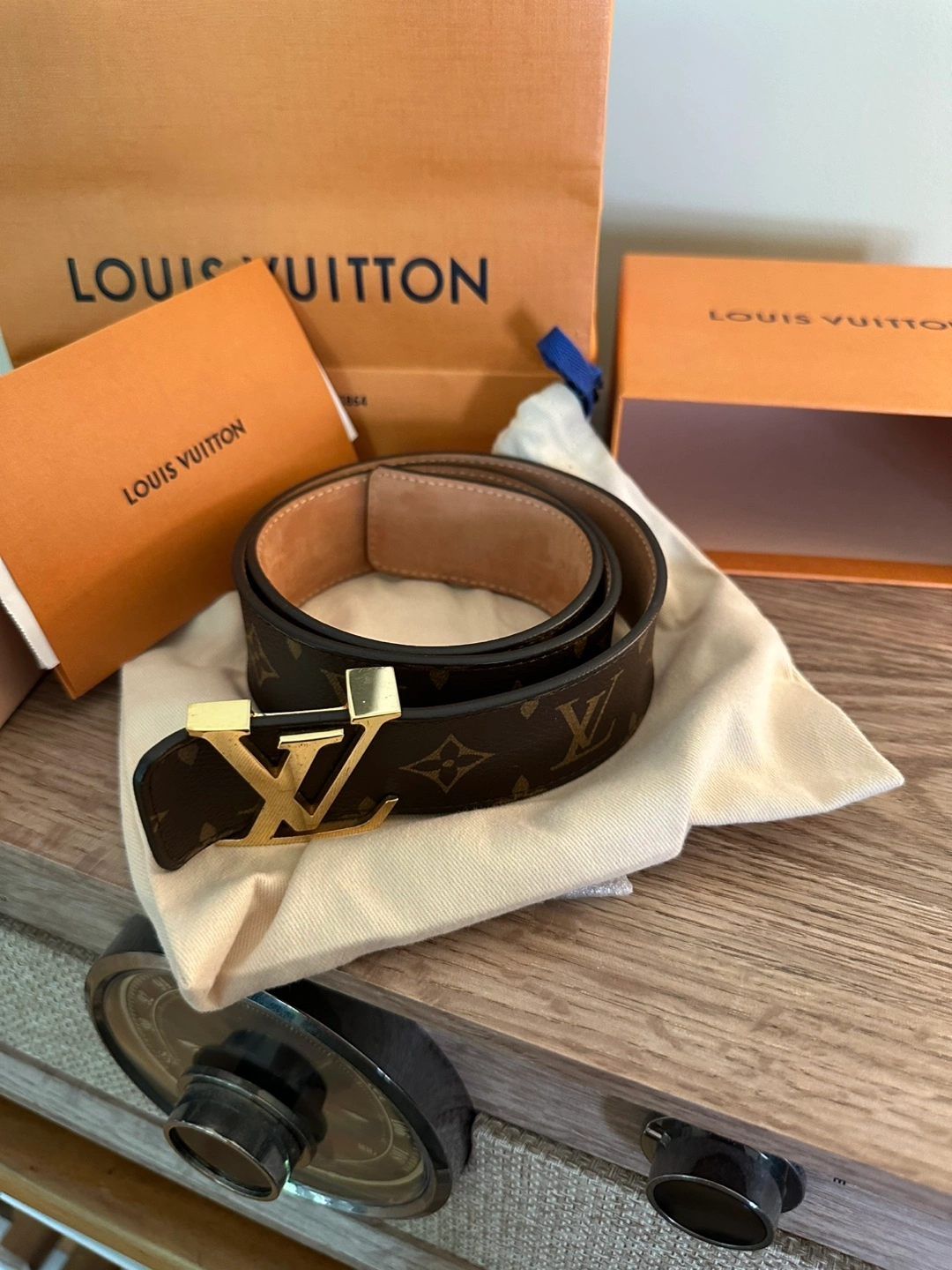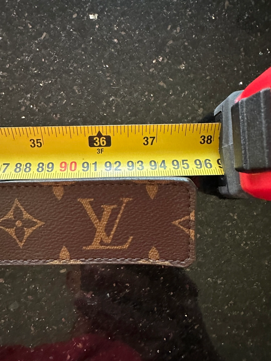 A beautiful belt, with a signature buckle. Monogram pattern. Comes with box and paperwork. A versatile accessory that goes with a variety of styles.