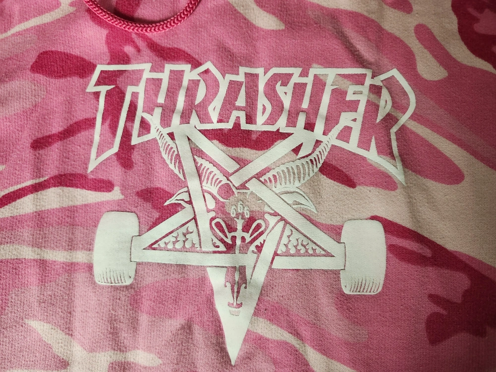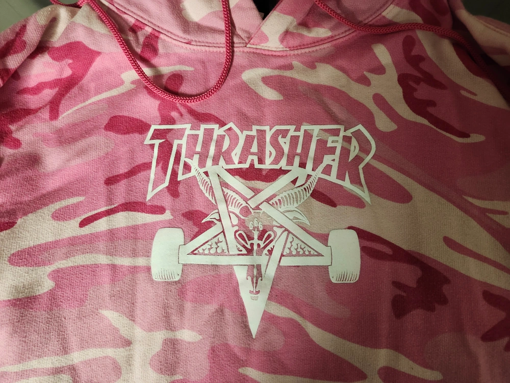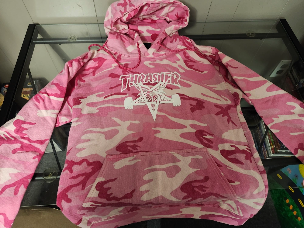 Pink camo Thrasher hoodie. Size small. Features pentagram graphic. 60% cotton 40% polyester. Authentic