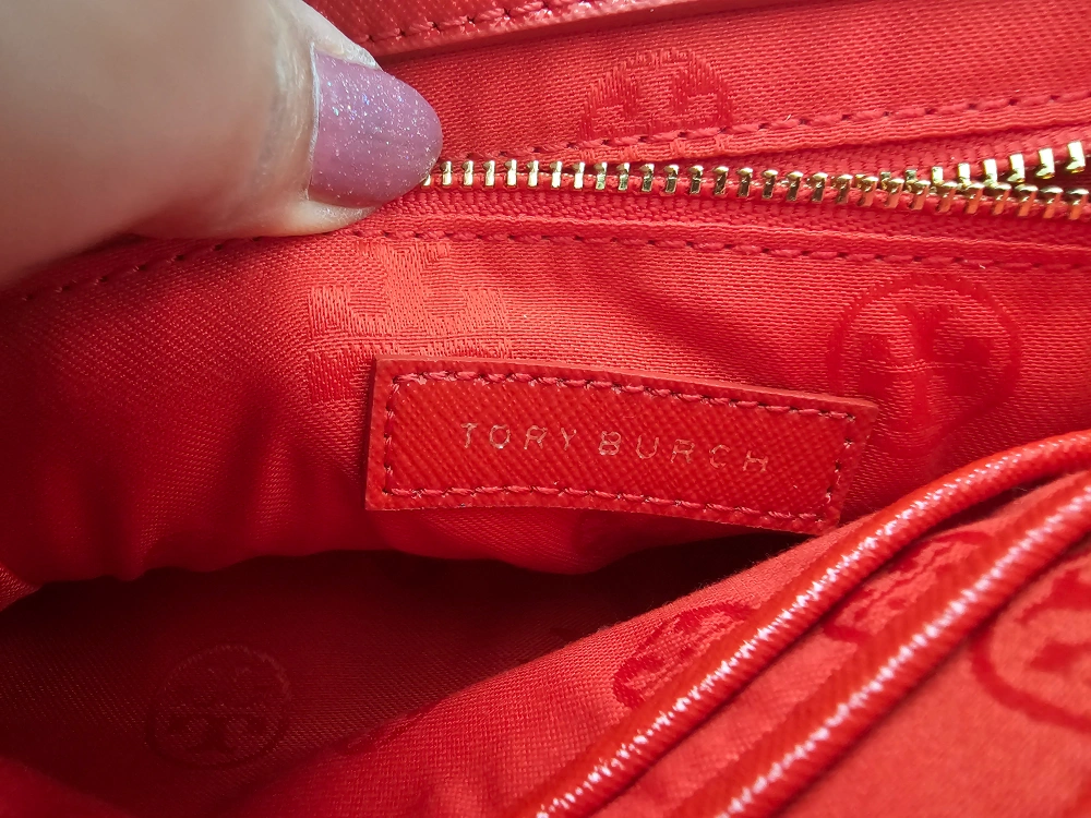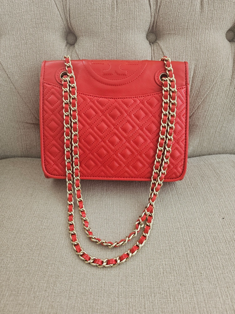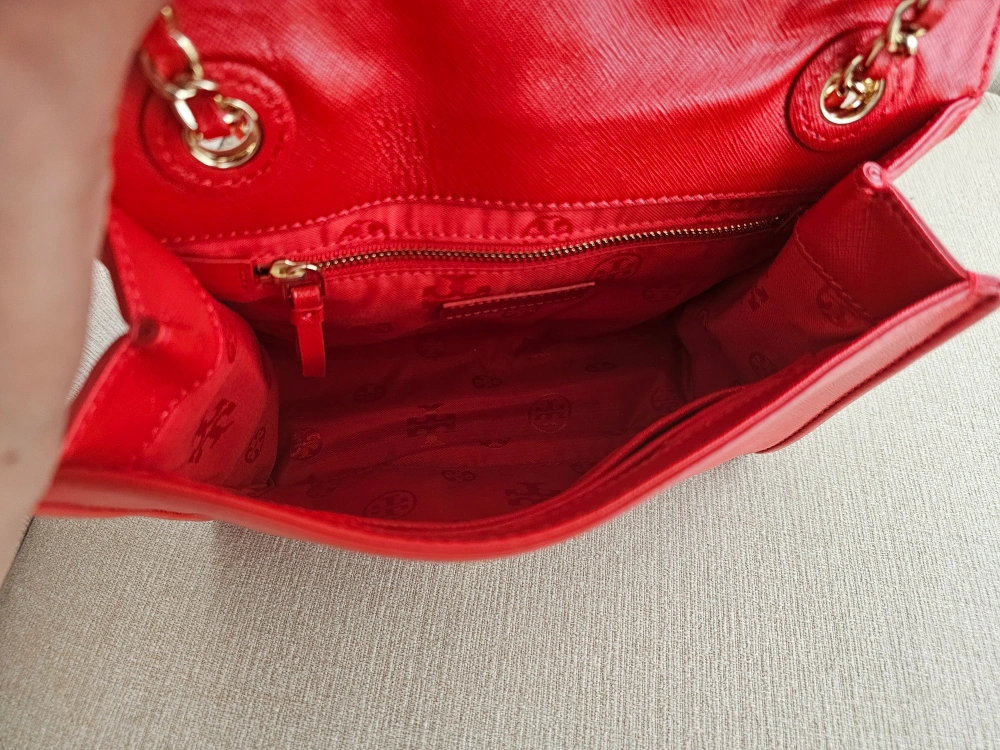 Selling a vibrant red Tory Burch crossbody bag! It's in great condition and perfect for adding a pop of colour to any outfit. The bag features a quilted design and a gold chain strap. It's a stylish and practical accessory for everyday use