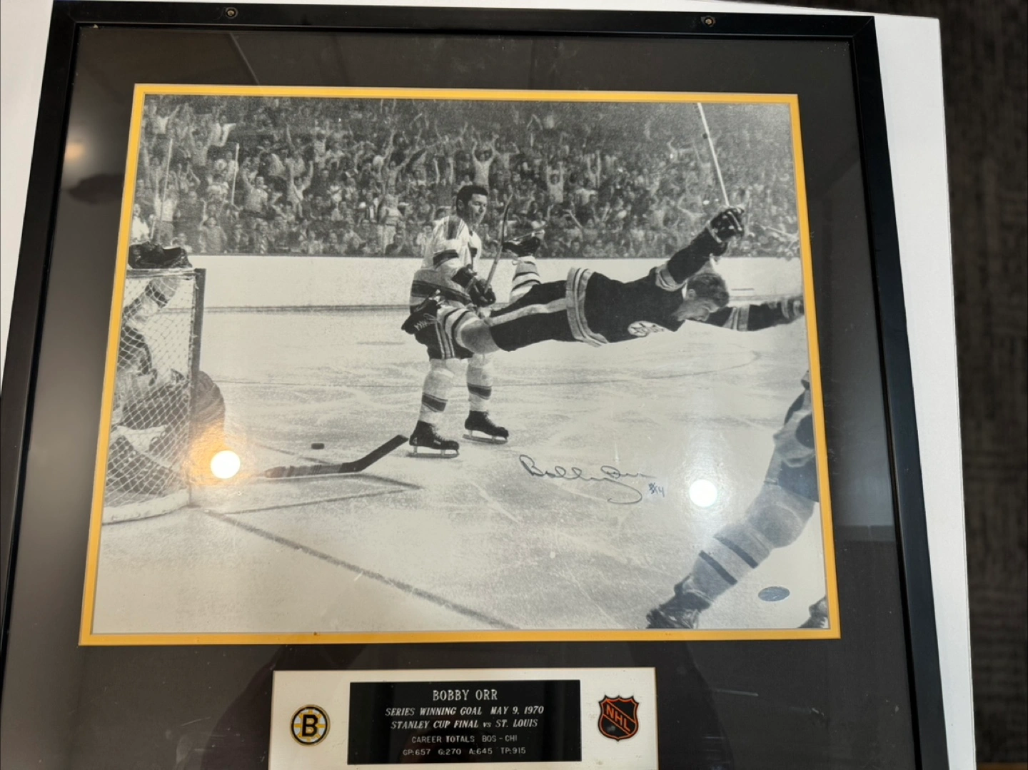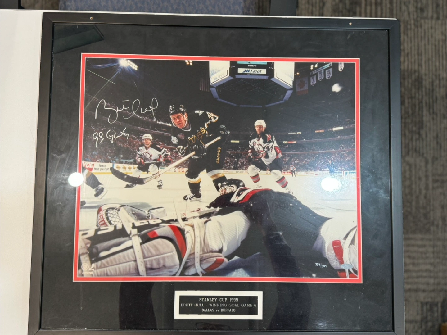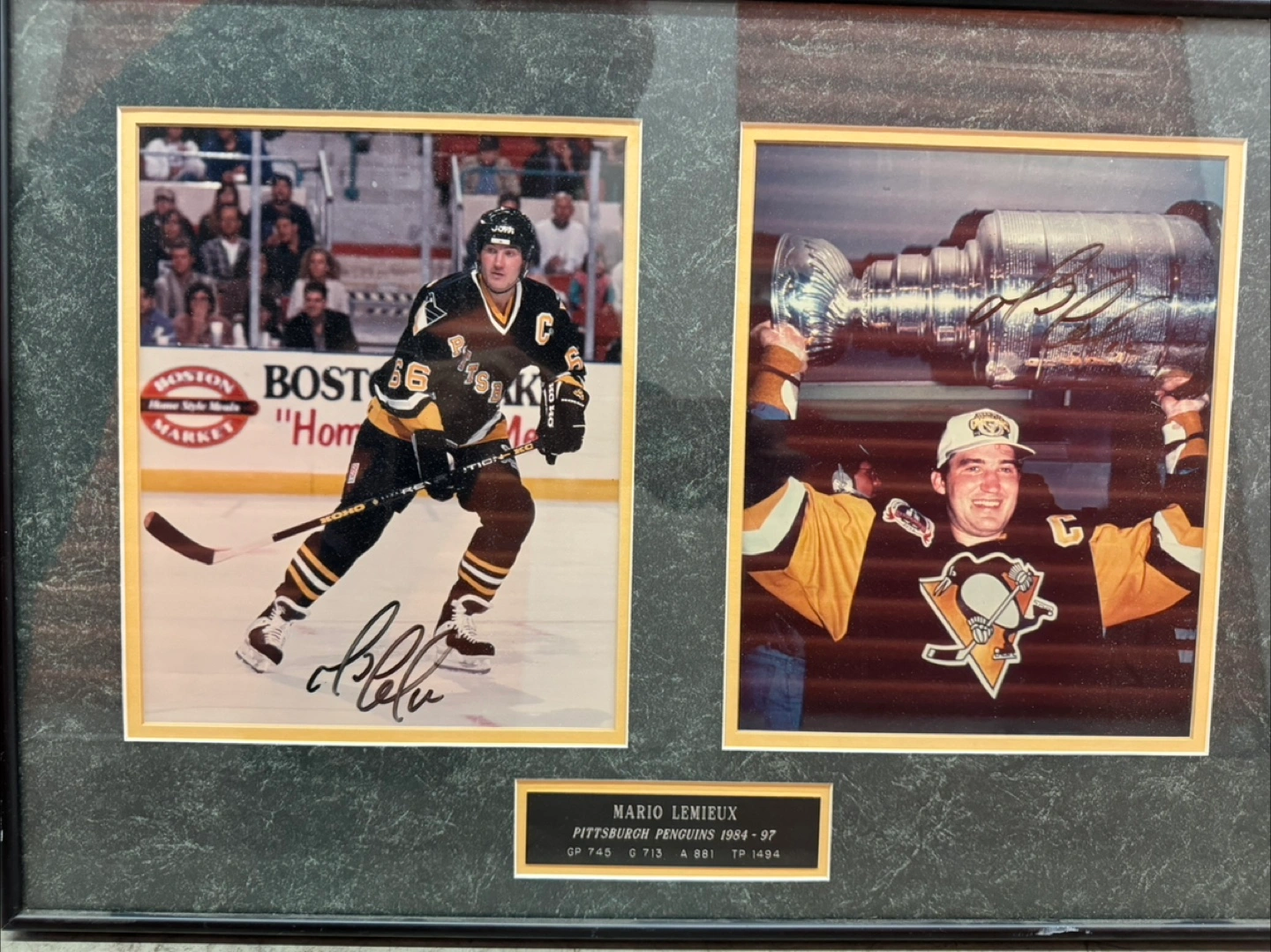 Autographed and framed Mario Lemieux dual photo and dual autograph Bobby Orr “ the flying goal” Patrick Lalime Brett Hull winning goal 1999 Stanley cup game 6 if interested make me a reasonable offer