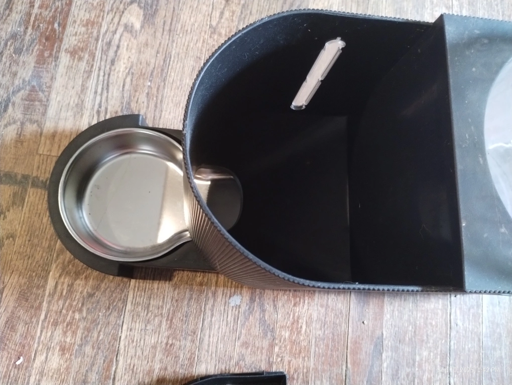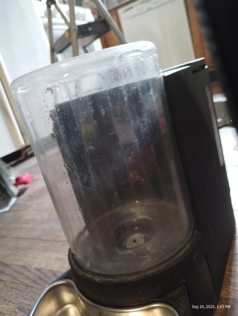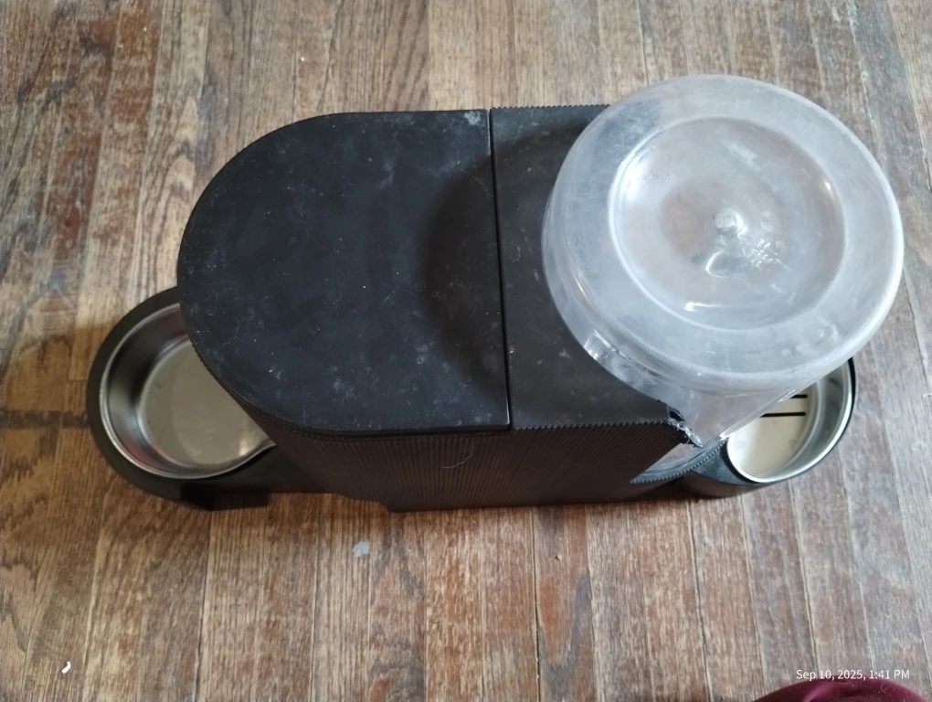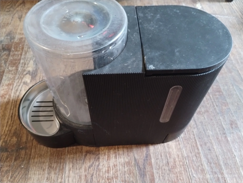 Selling an automatic pet feeder. It features a water dispenser and a food bowl. There appears to be some damage on the side of the water dispenser but doesn't effect how it works.