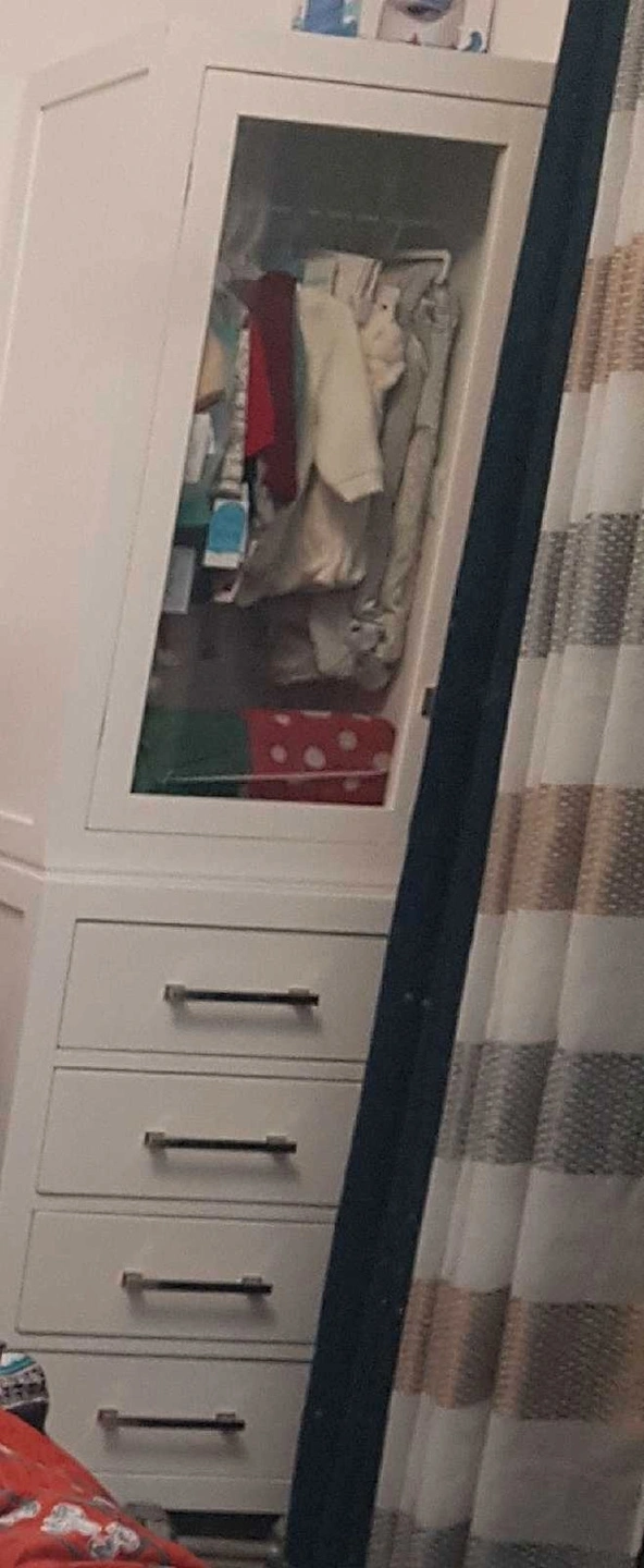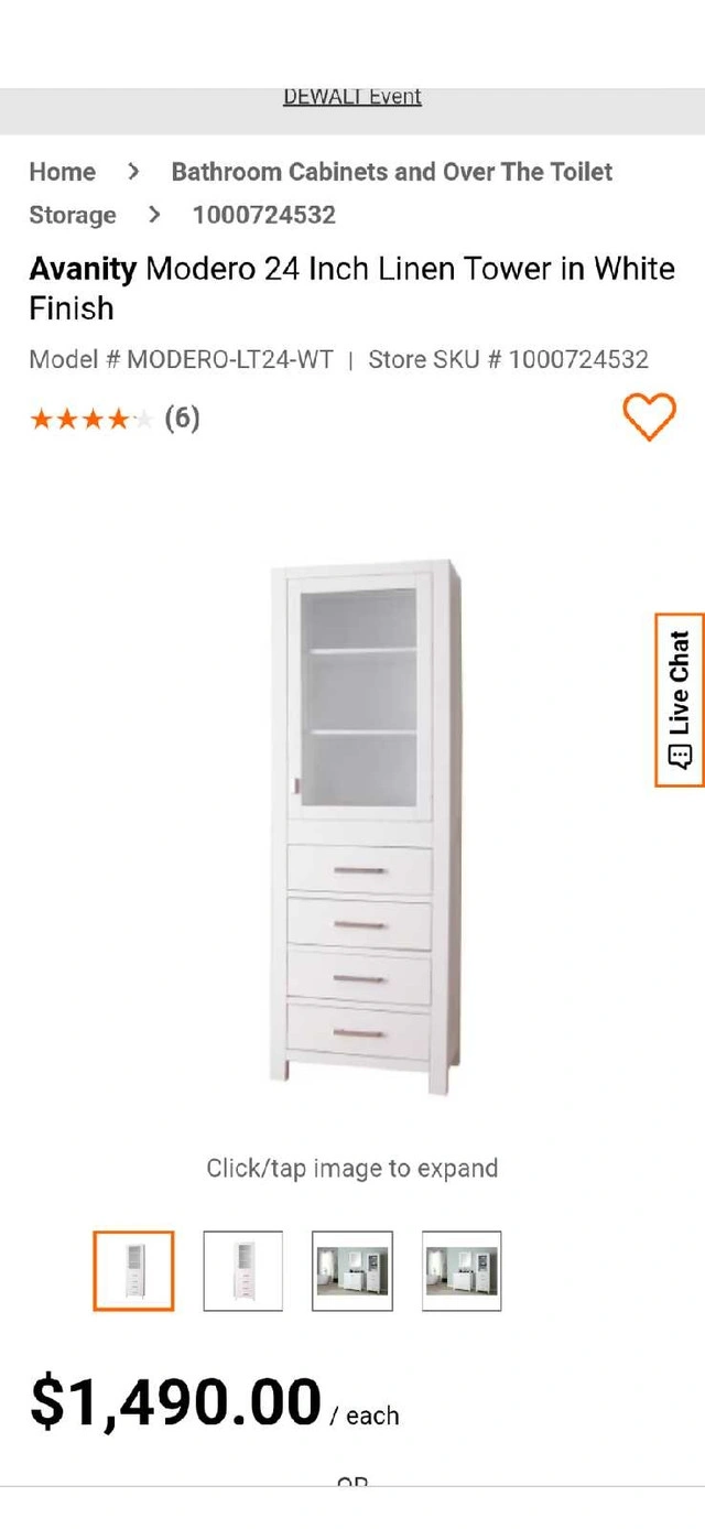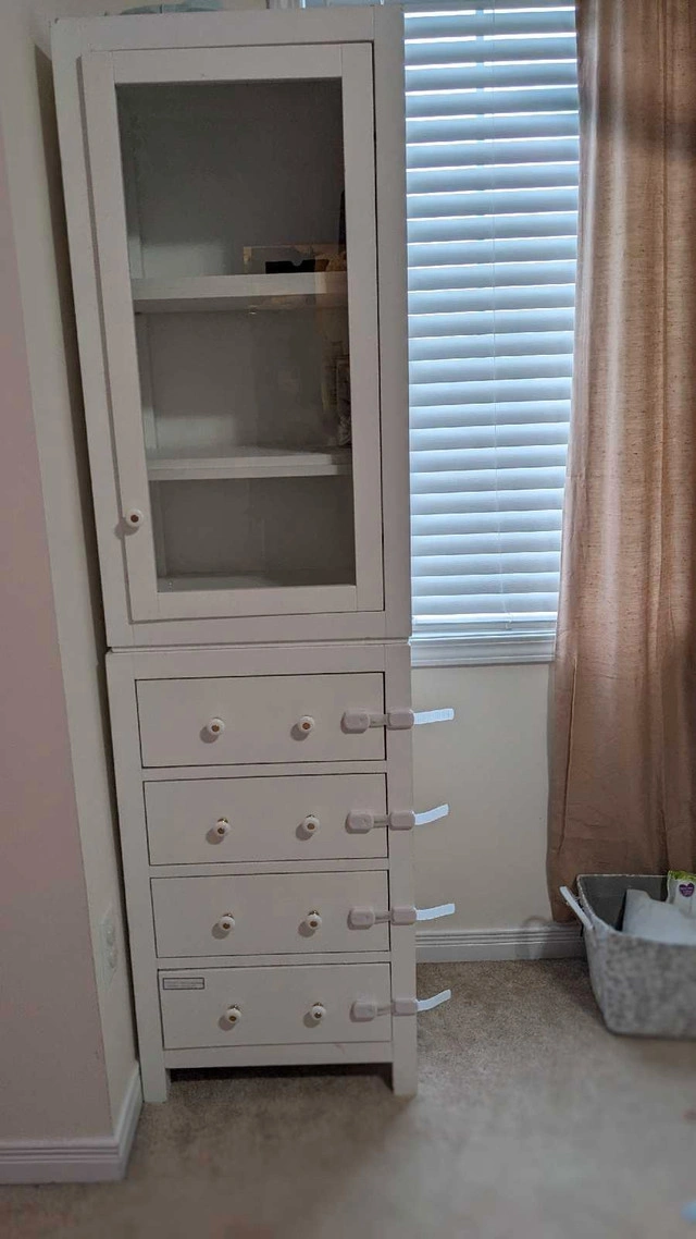 This is Avanity Moderno tower in a white finish . This tower offers ample space while maintaining a sleek and modern appearance.We changed its handles. We also have original handles and will give to the buyer. It has some wears but overall is in good condition. Retail $1900+