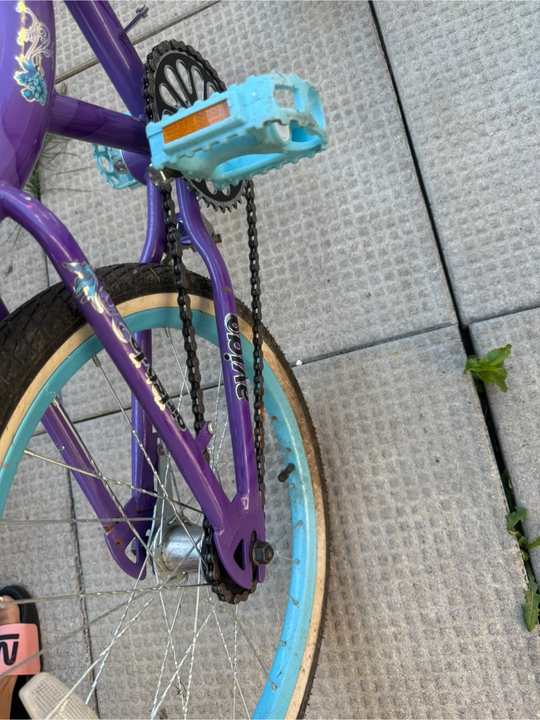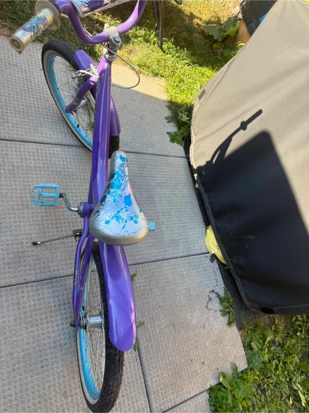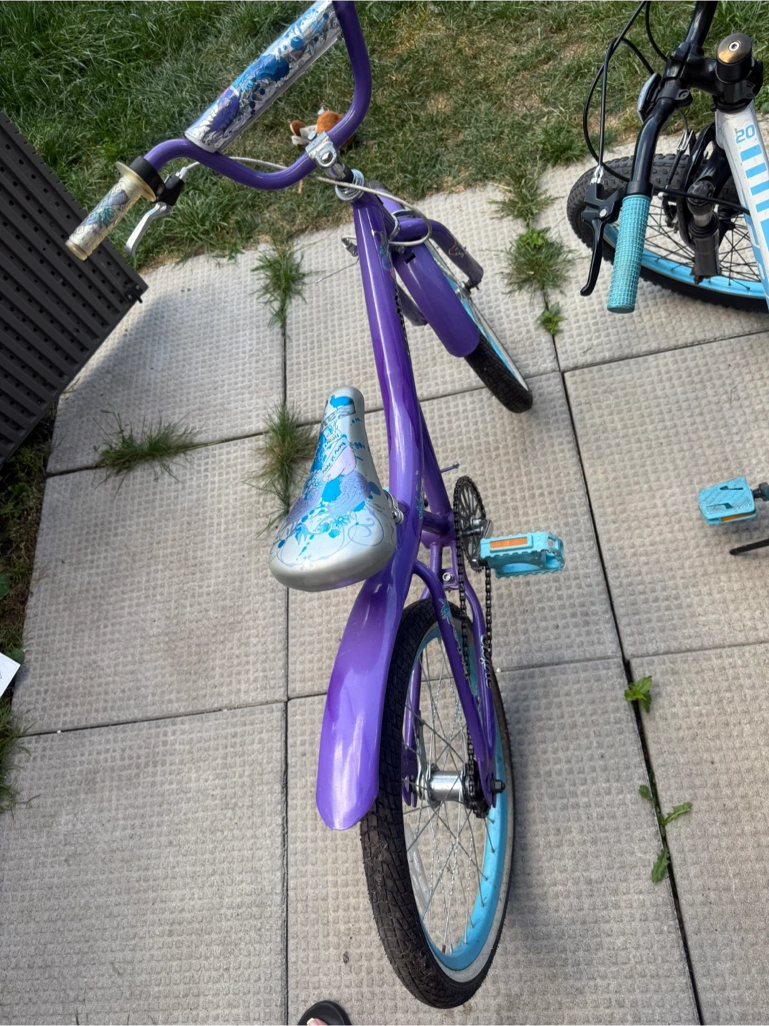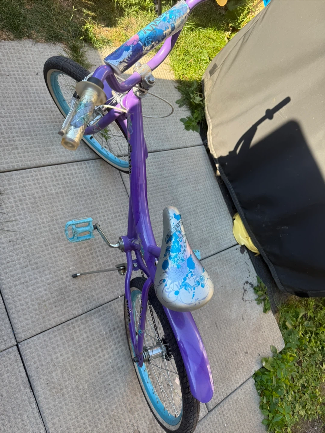 Selling a cute Avigo kids bike! It's purple with blue accents and would be perfect for a child learning to ride. The seat has a fun design too!