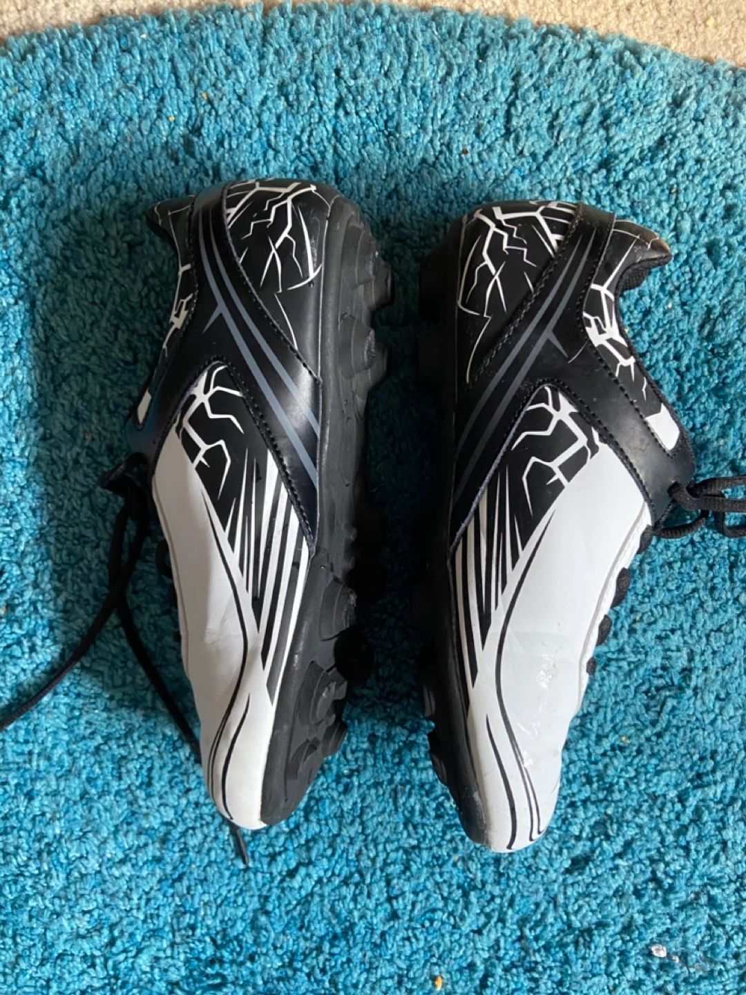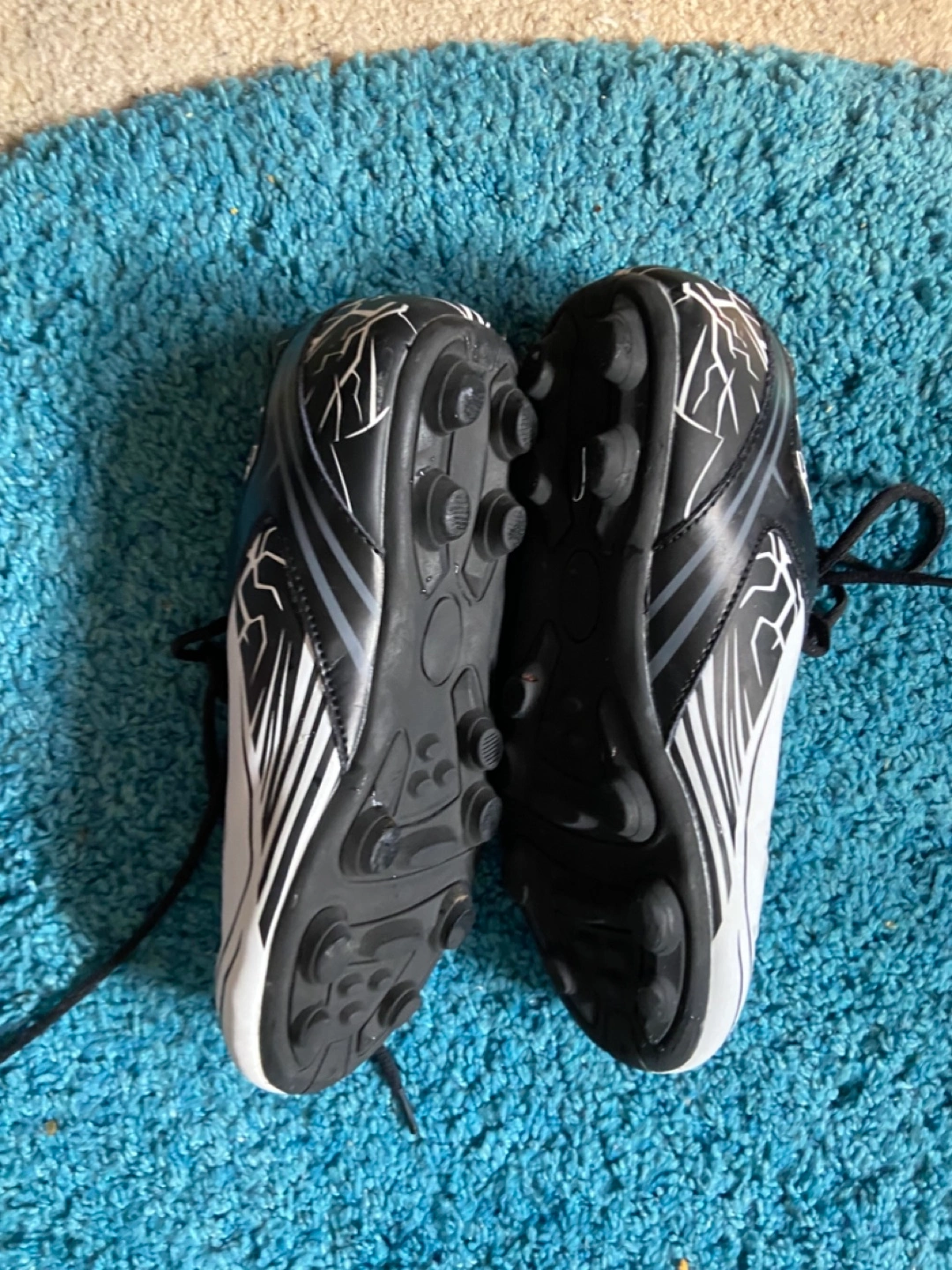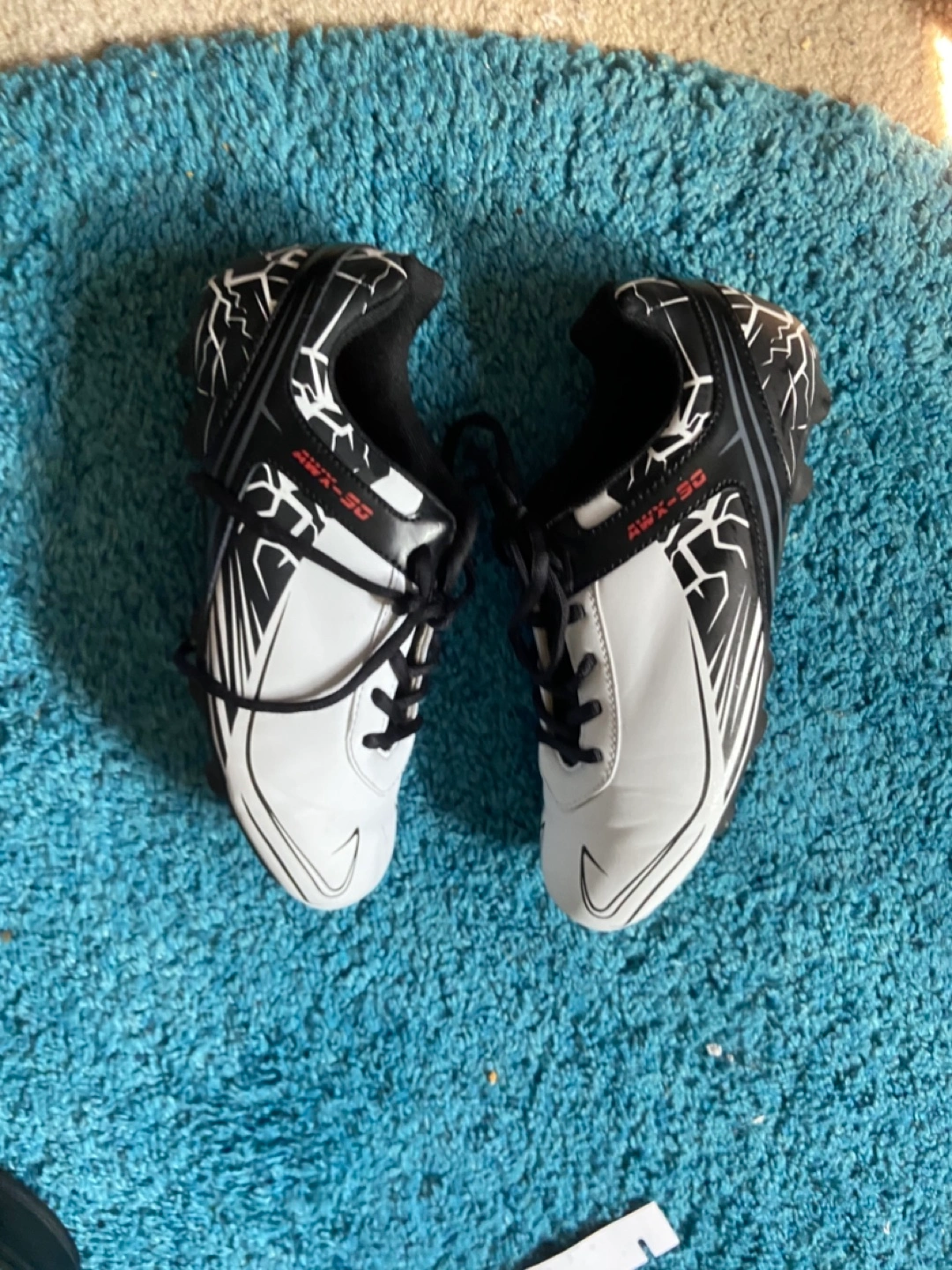 Youth sized soccer cleats in good condition. The brand is AWX-SC and they feature a black and white design. Perfect for the young soccer player! Size 7