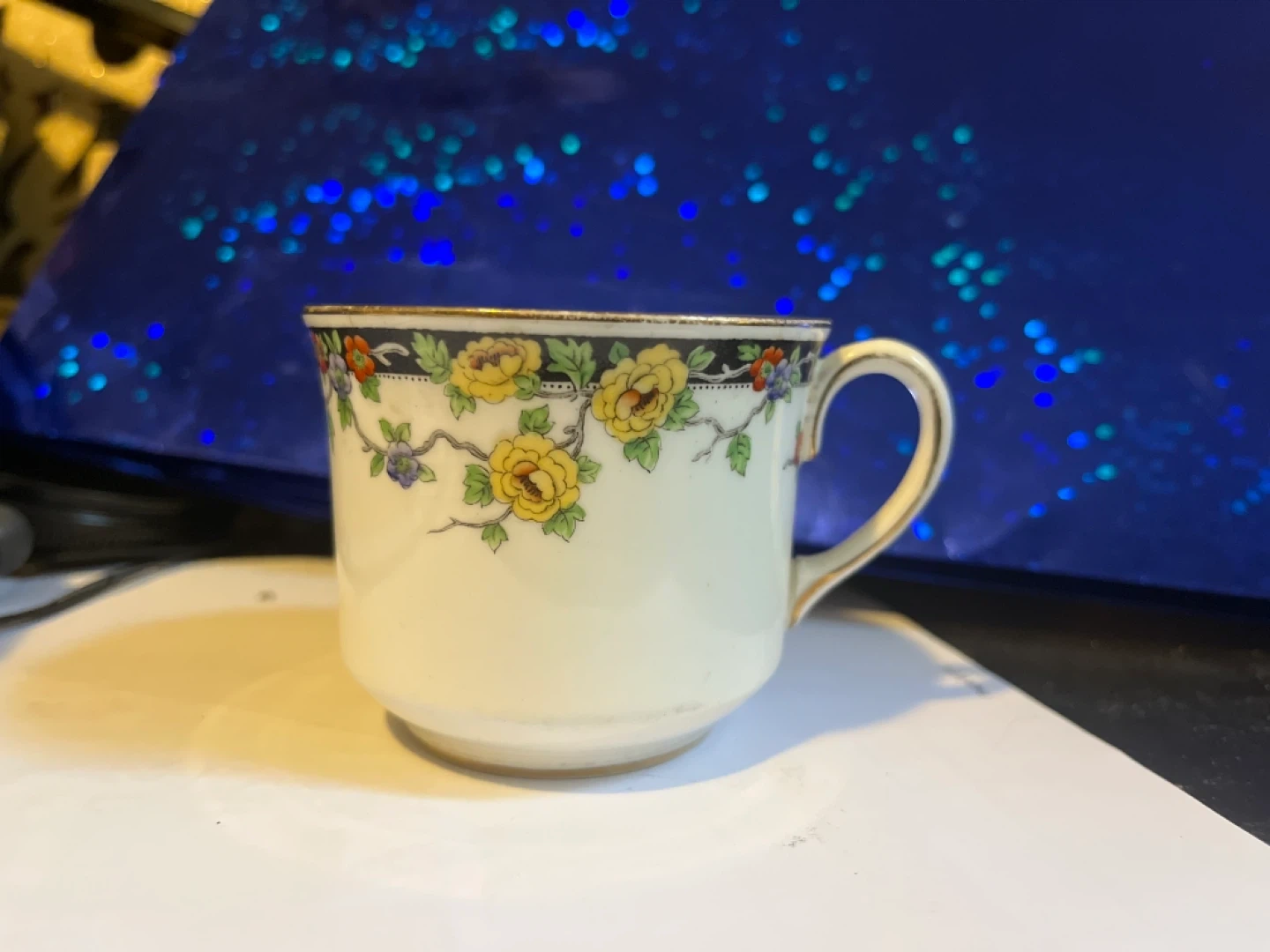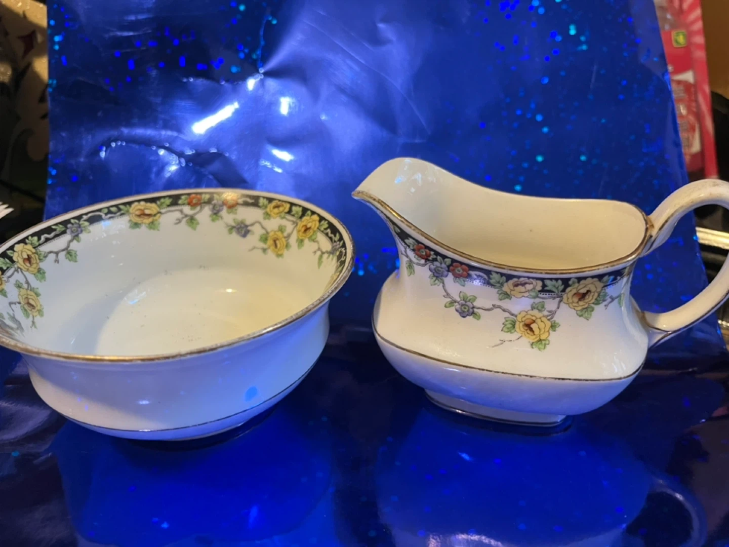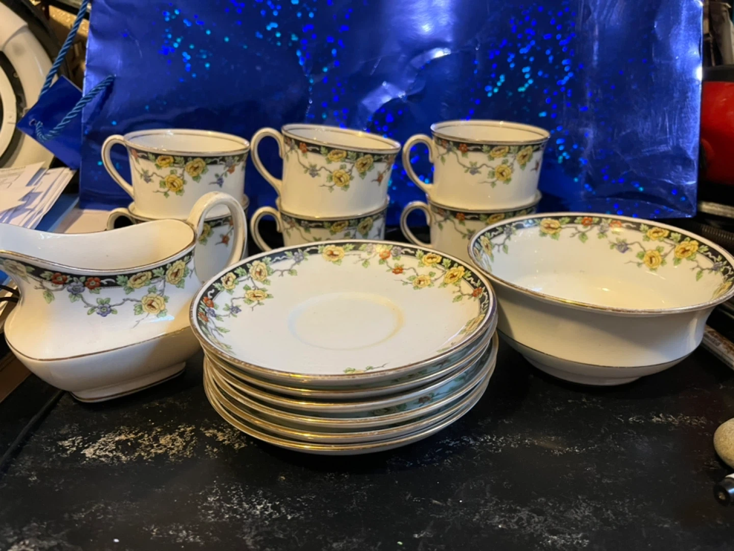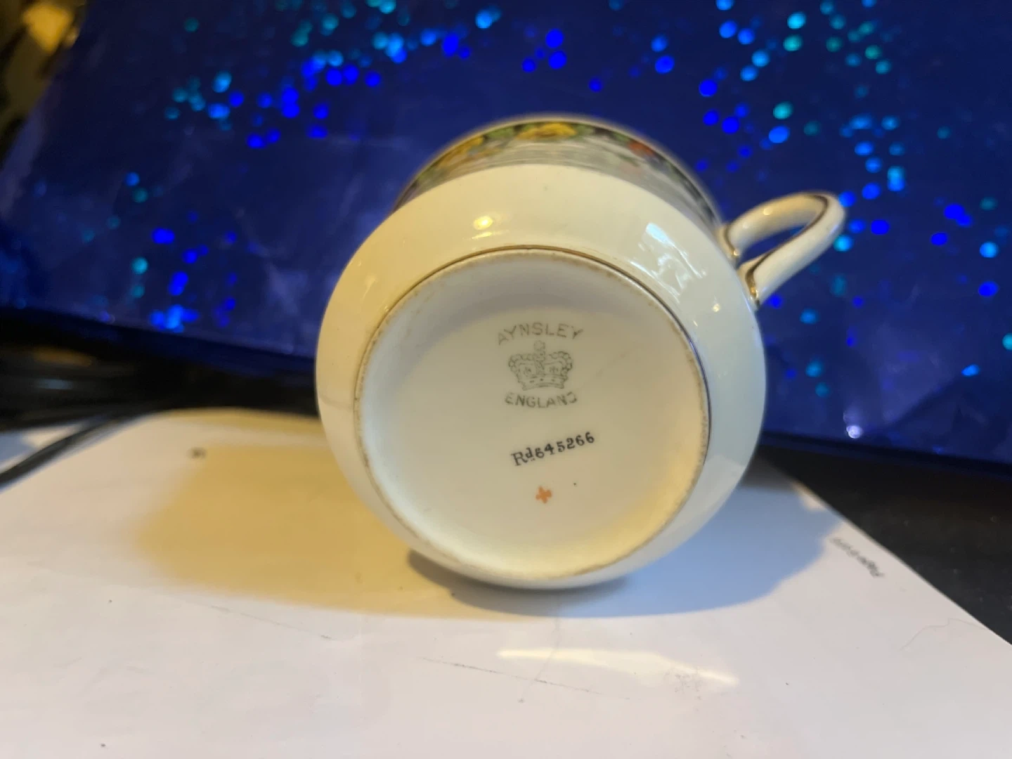 Selling a lovely Aynsley England tea set! It features a delicate floral design with a gold trim. Includes cups, saucers, a creamer, and a sugar bowl. Perfect for afternoon tea or adding a touch of elegance to your collection