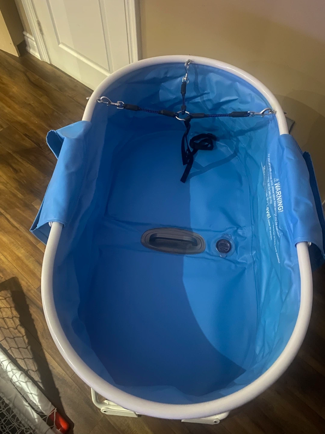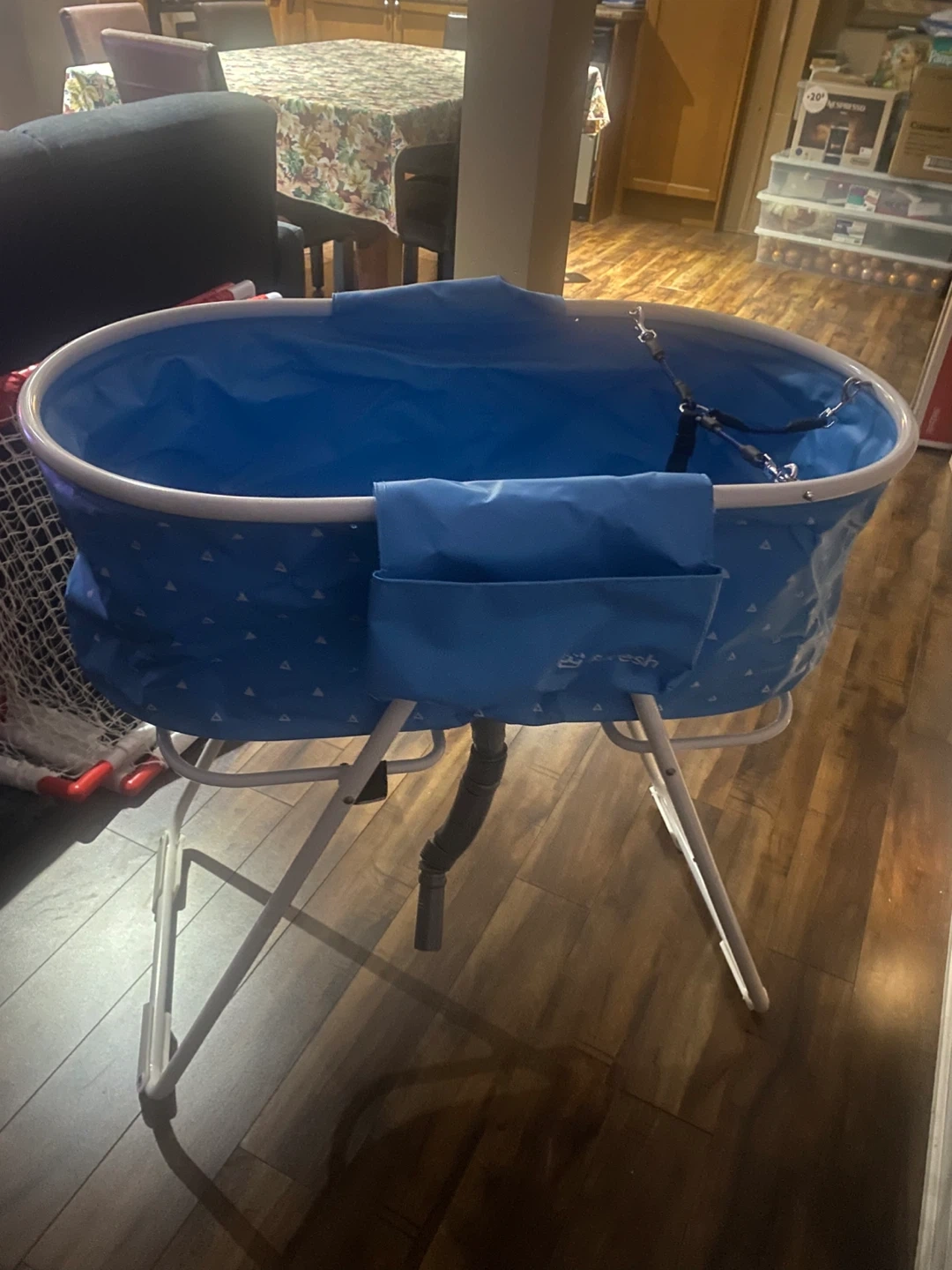 Selling a B-Fresh dog washing tub! It's in great condition and perfect for giving your furry friend a bath at home. The tub is blue and features a convenient design with a stand and a drain. It also has a little pocket on the side!