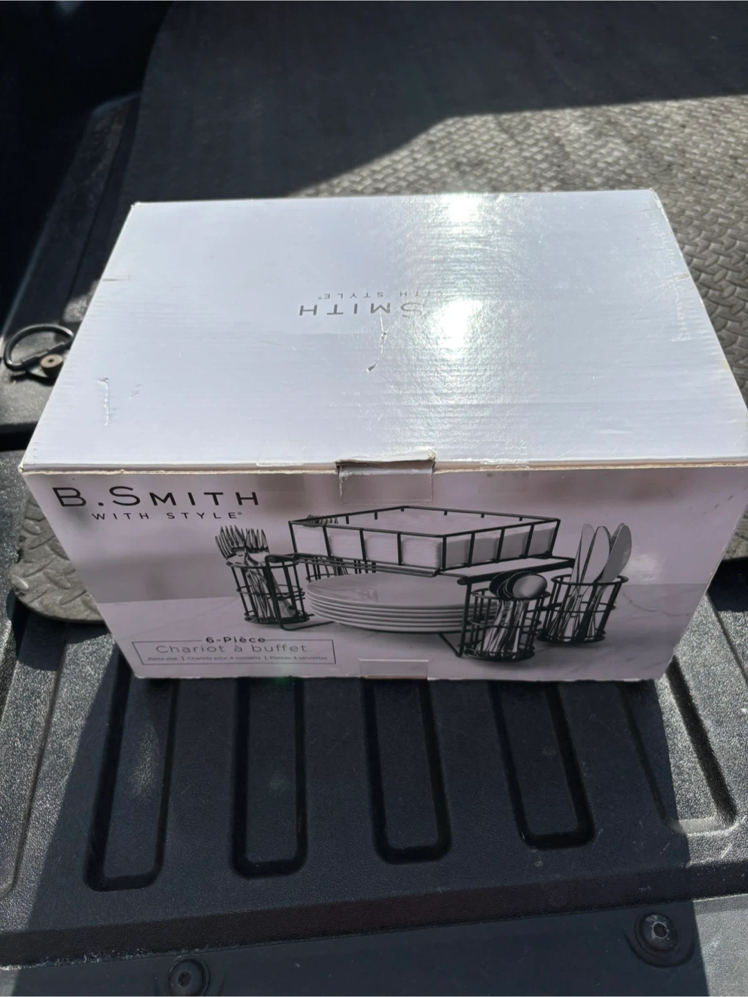 Selling a brand new B. Smith 6-piece Chariot buffet caddy! It includes a plate holder, 5 plate caddies, and a kitchen tray. Perfect for entertaining and keeping your buffet organized. The box is included