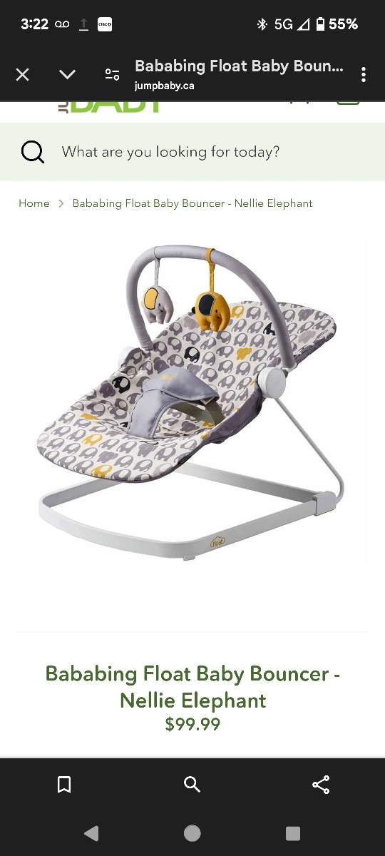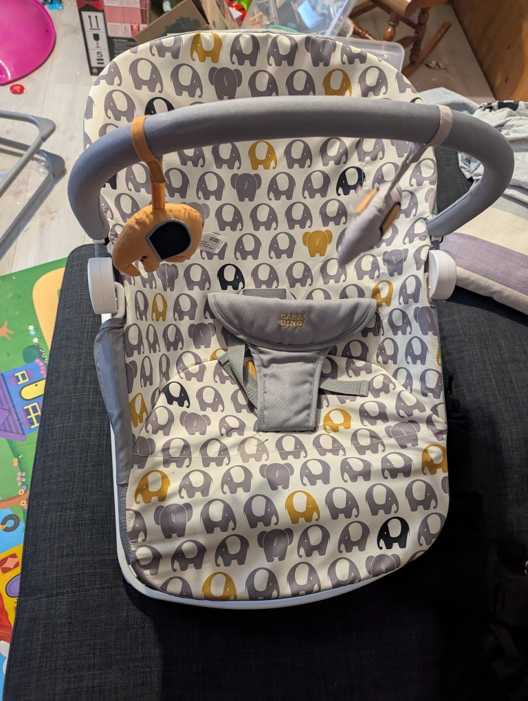 Adorable baby bouncer, grey and white elephant print. Features a removable toy bar. Gently used, excellent condition.