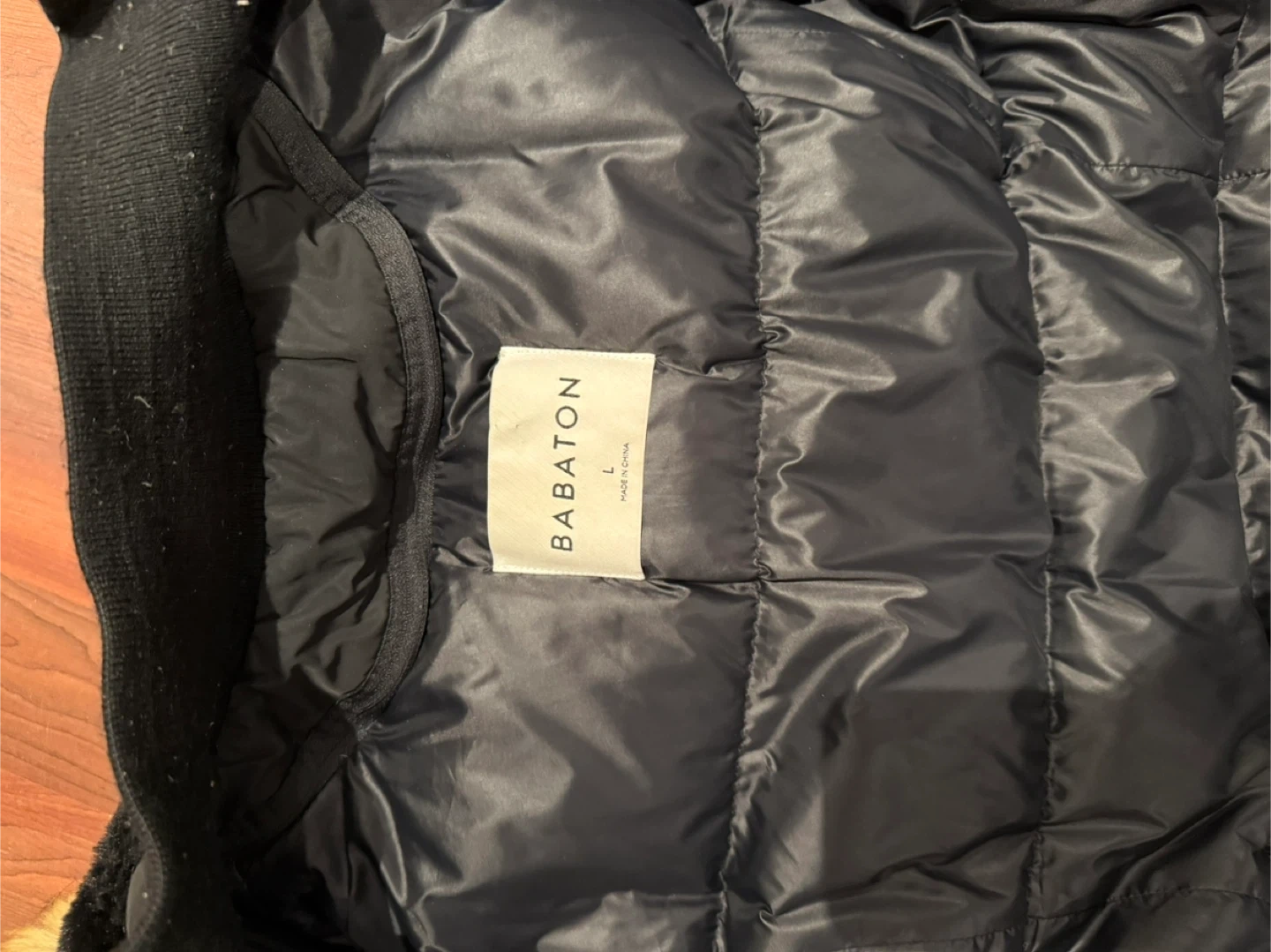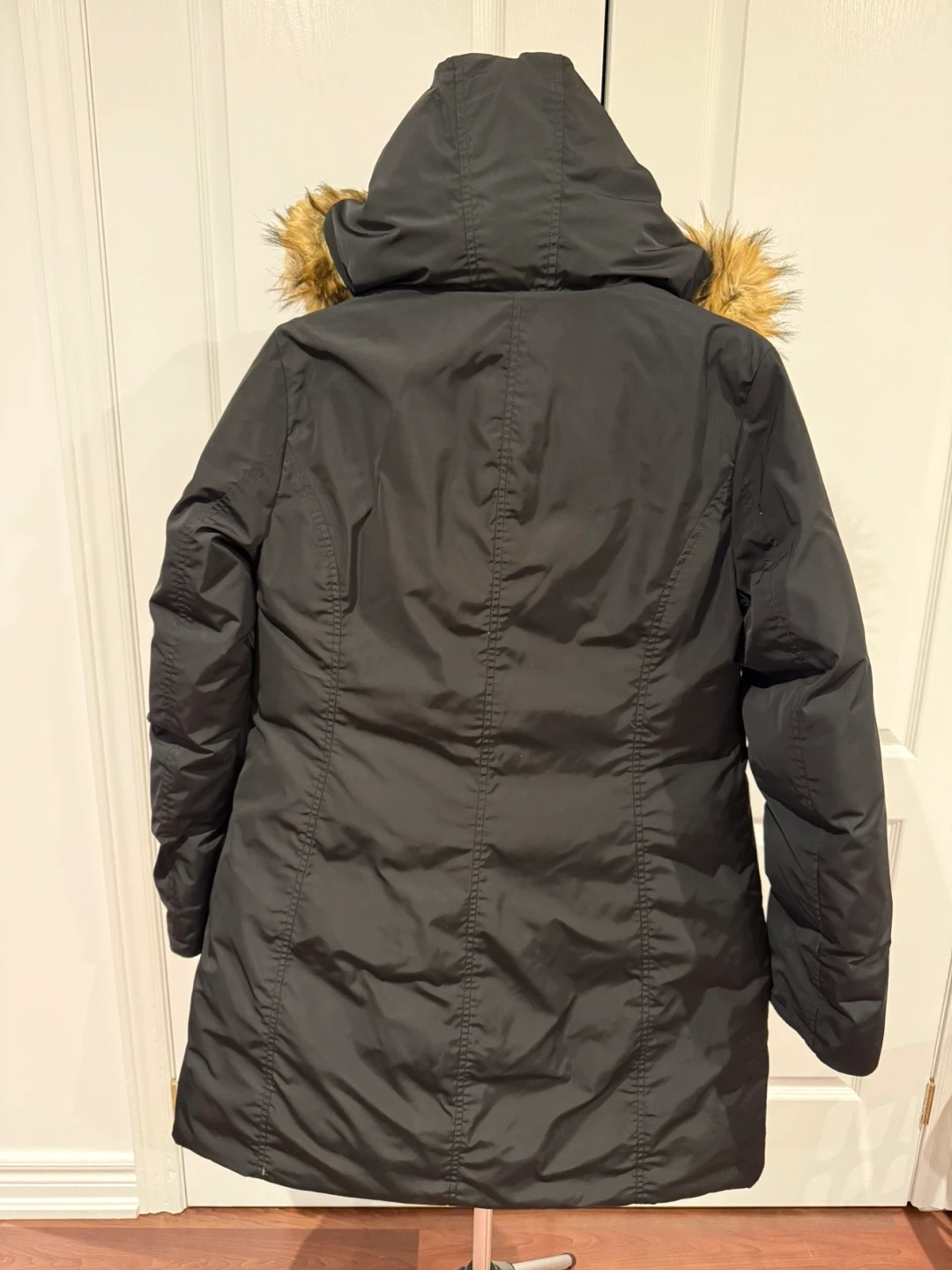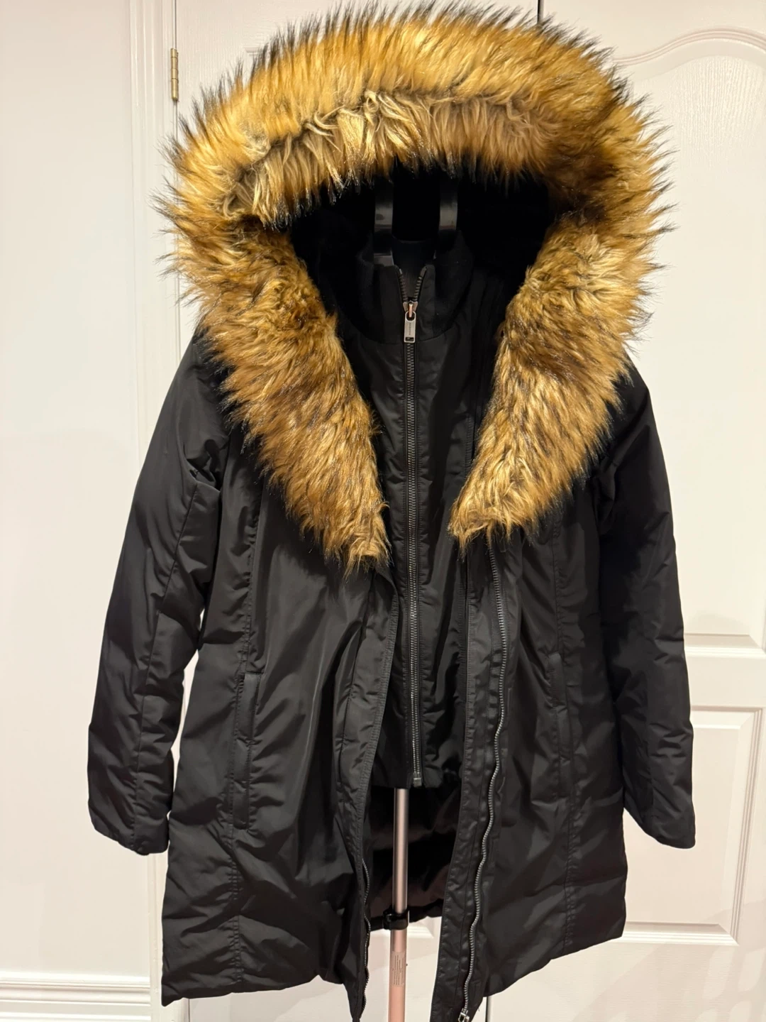 Selling a gently used black winter coat from Babaton. It's a size large and has a faux fur trim on the hood.