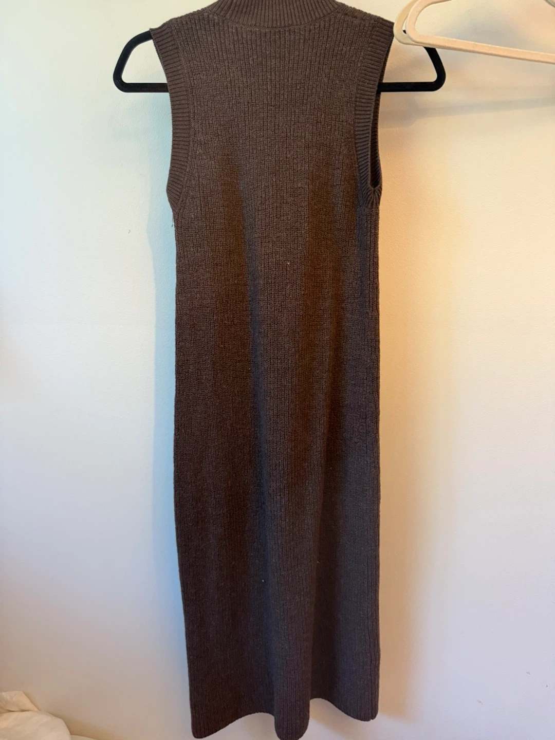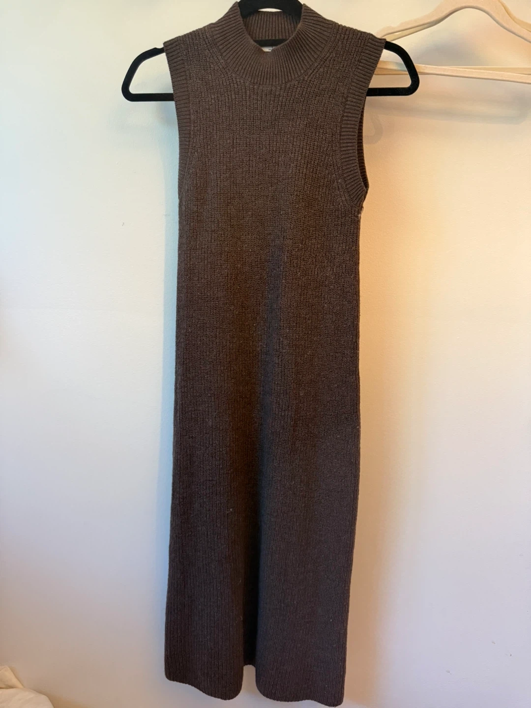 Cozy and stylish Babaton sleeveless knit dress in a lovely brown colour. It's a size small and in great condition. Perfect for layering or wearing on its own. Hits at knee for 5’4” / 163cm frame. Really good condition, worn a few times only.