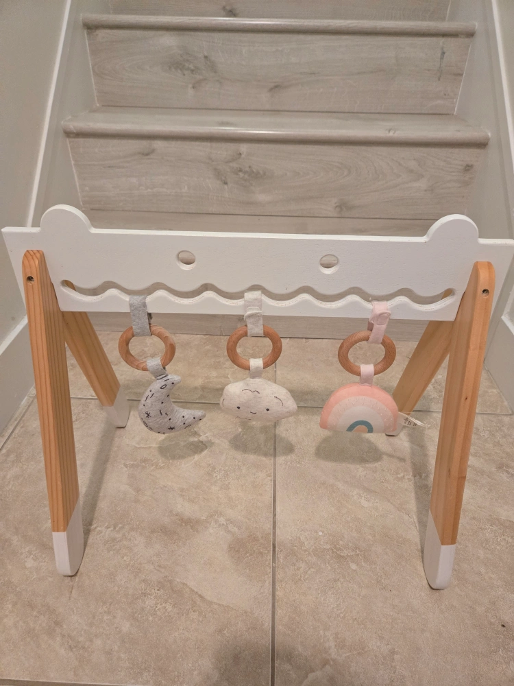 Selling a cute baby activity gym! It features a wooden frame and three adorable hanging toys: a moon, a cloud, and a rainbow. Perfect for keeping your little one entertained and developing their motor skills