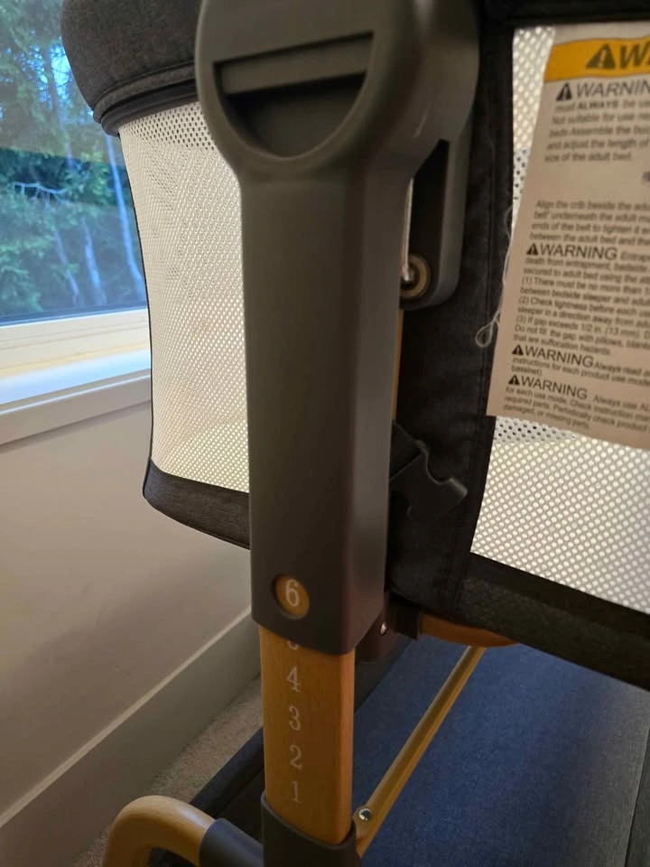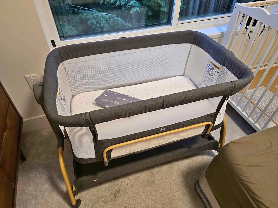 Barely used in the last year. Nearly brand new. The front opens up and it attaches to the bed so you can safely co-sleep with baby. Great option to a baby crib especially if space is a factor. Height is adjustable (6 different options). And it can swing from side to side or lock. Storage underneath. Machine washable. Will include a few sheets I have for it as I will no longer need them. Straps to attach it to bed included. My baby has outgrown it.