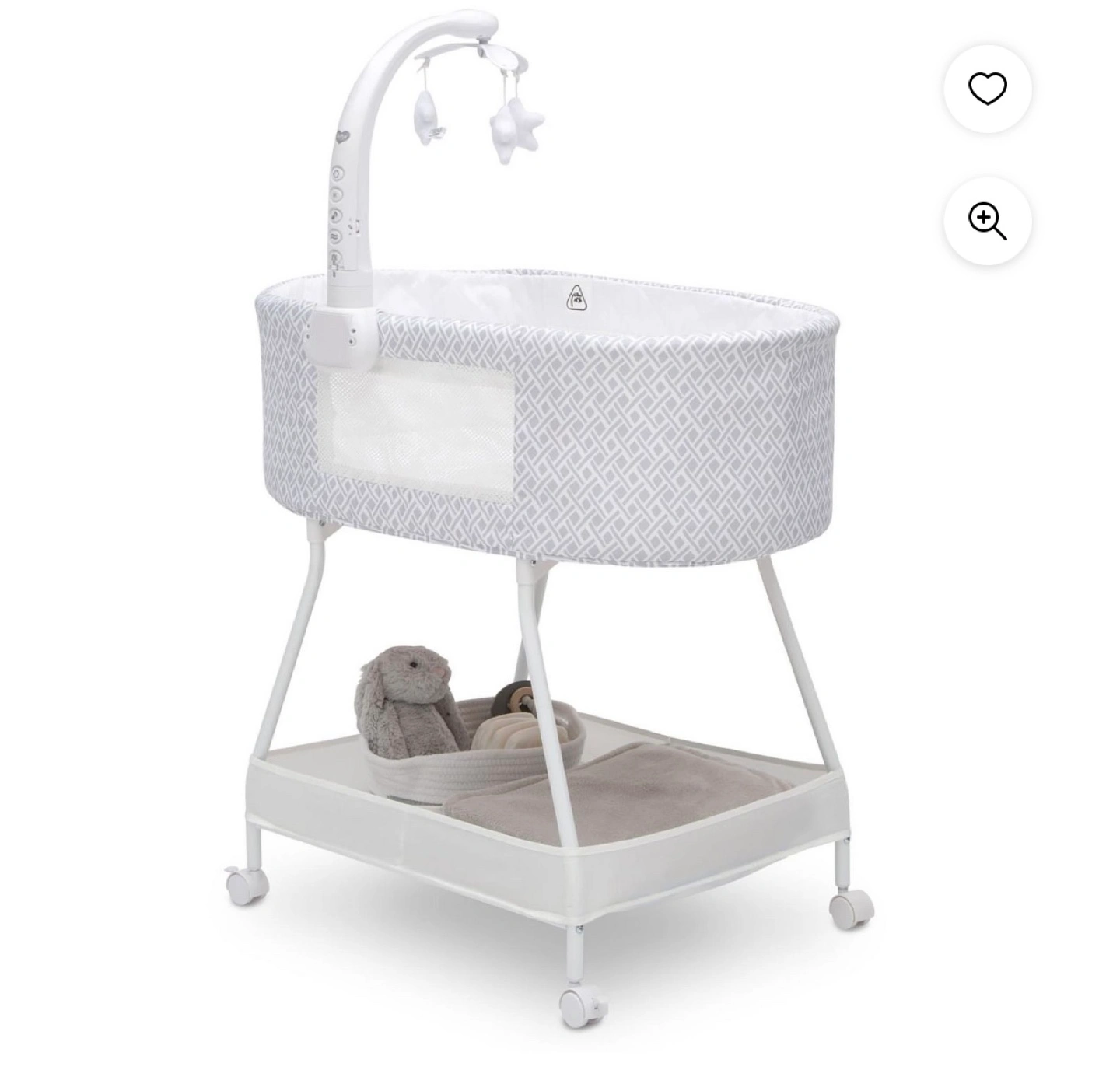 Grey and white bassinet, includes stand and mobile. Features wheels for easy movement. Bottom shelf for storage.