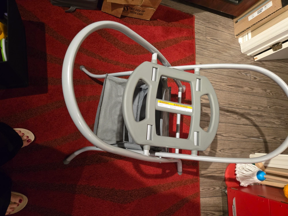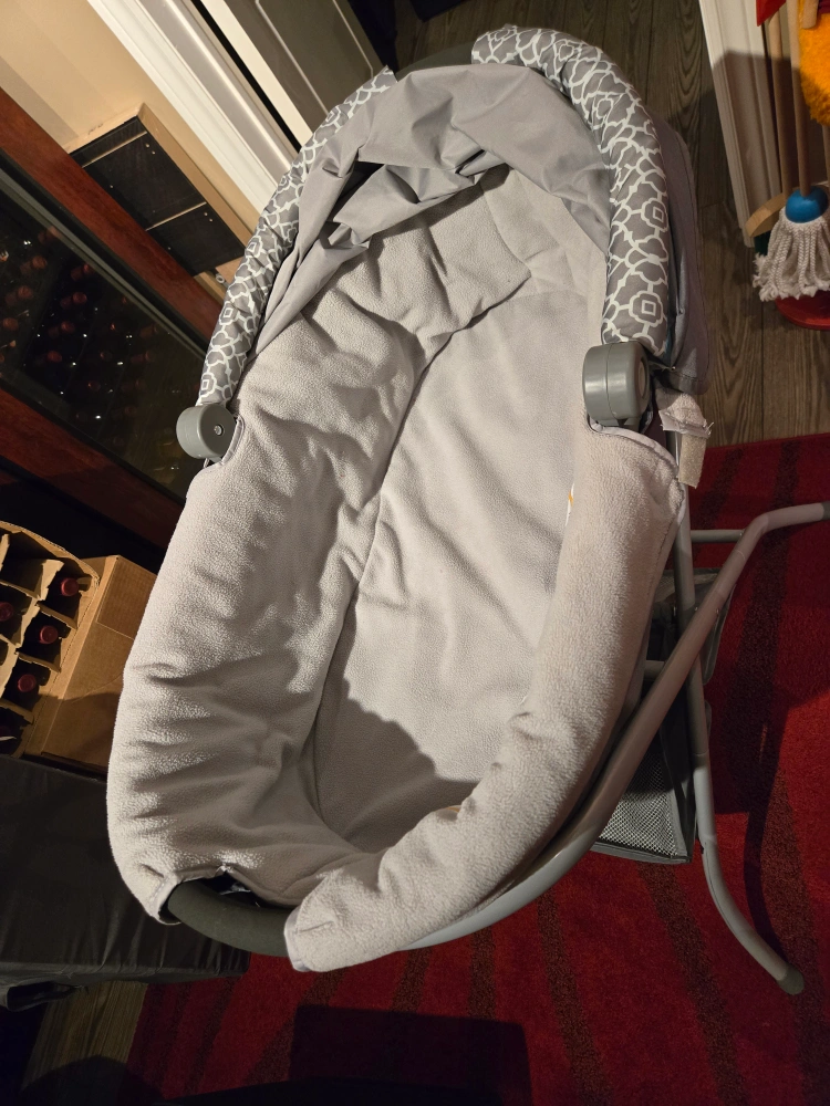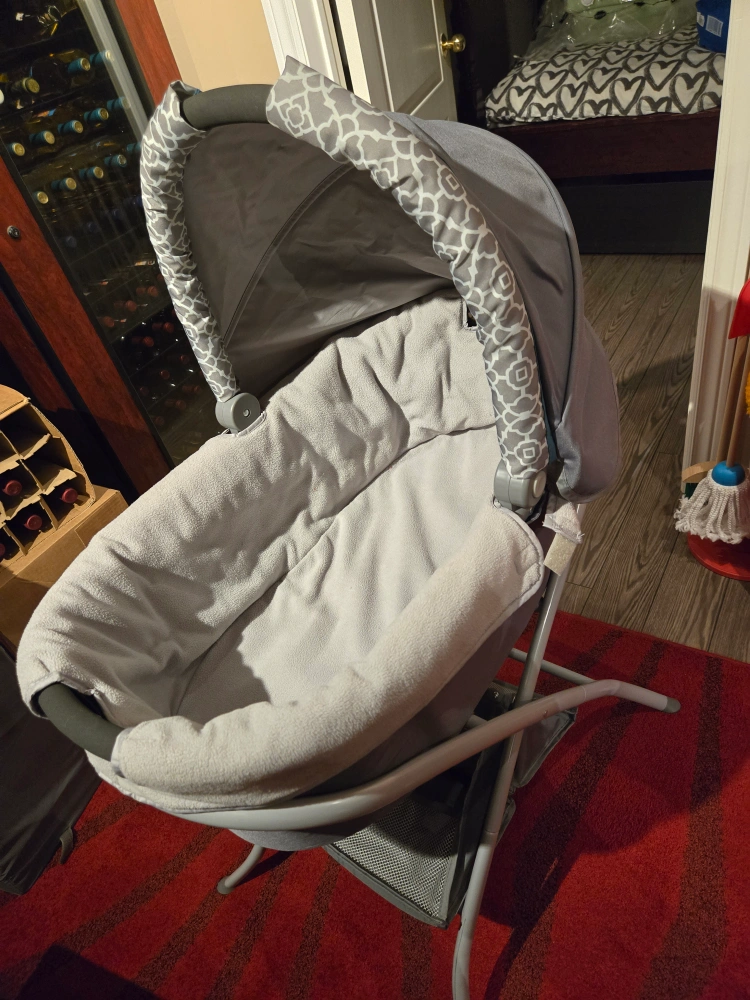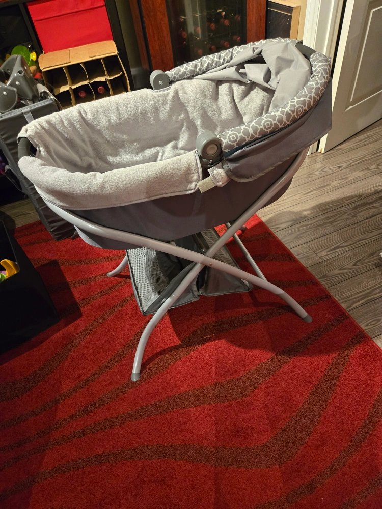 Grey baby bassinet with stand. Features a soft, padded interior. Folds for storage. Suitable for newborns.