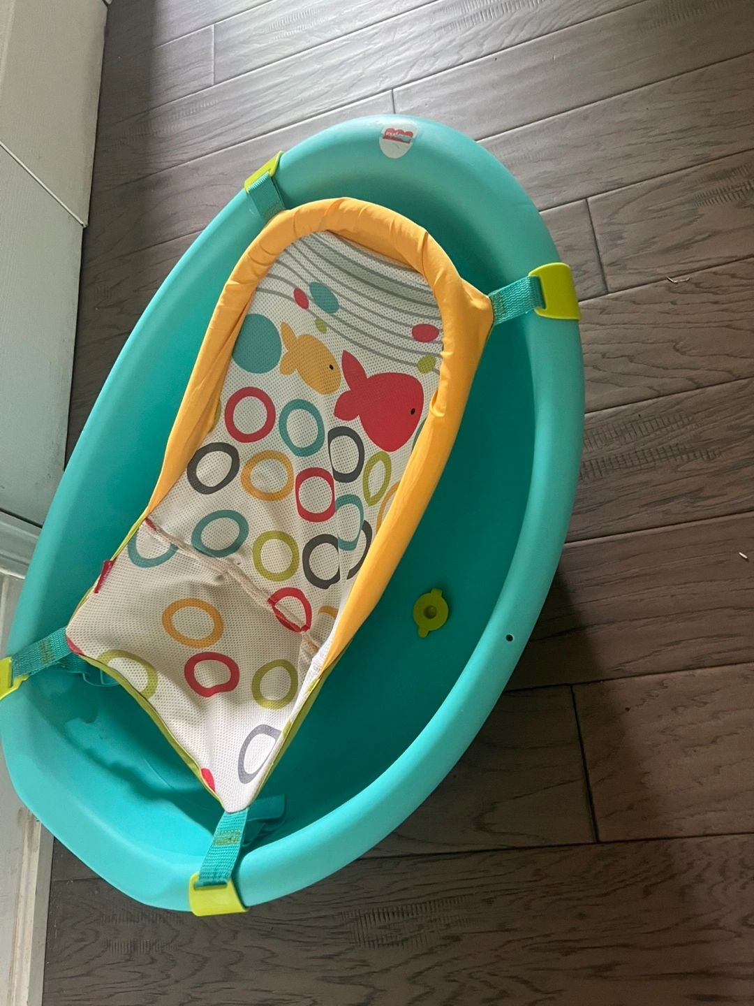 I'm selling this baby bath tub. Includes a supportive sling for baby's comfort. Features a vibrant design. Perfect for giving your little one a peaceful bath.