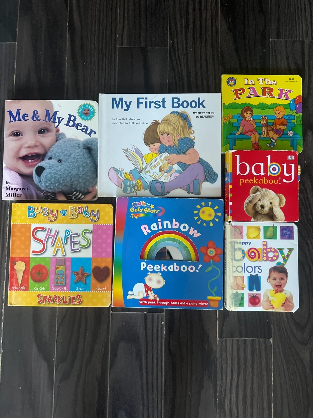 Selling a collection of baby board books! Includes titles like 'Me & My Bear,' 'My First Book,' 'In The Park,' 'Baby Peekaboo!,' 'Busy Baby Shapes,' 'Rainbow Peekaboo!,' and 'Happy Baby Colors' These books are great for introducing little ones to reading and exploring different concepts