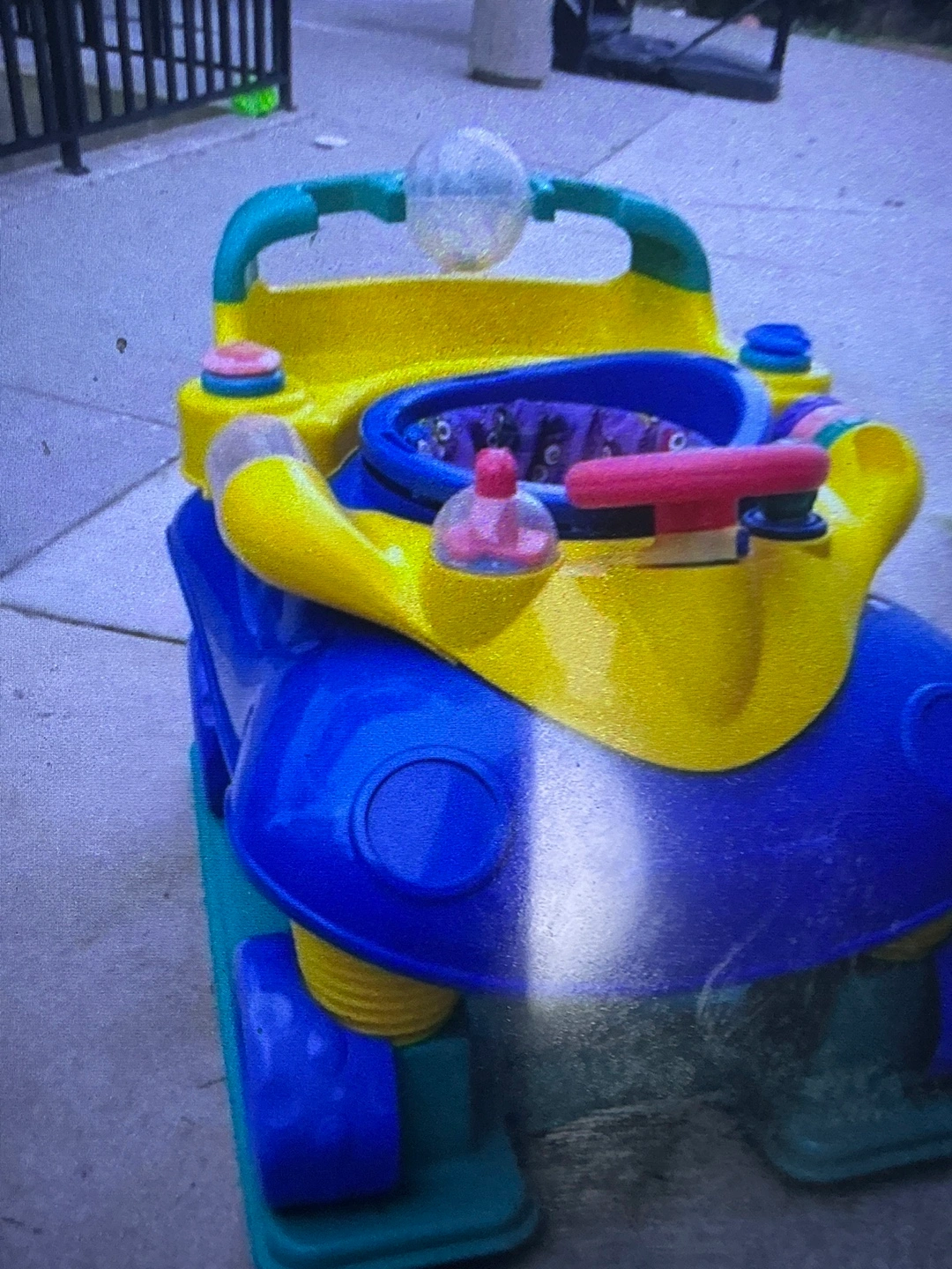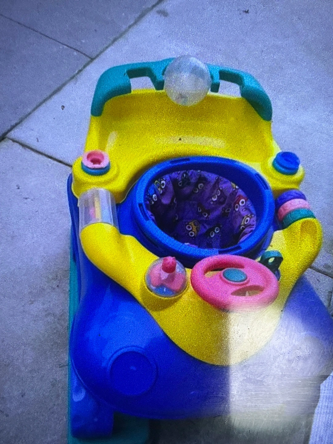 Baby bouncer car.Features a steering wheel and other accessories. Offers a place for the child to sit and safely play. This walker could be a wonderful way for your little one to explore and enjoy their time .