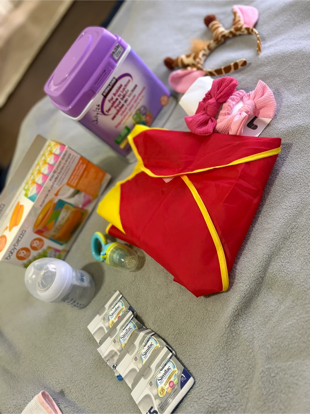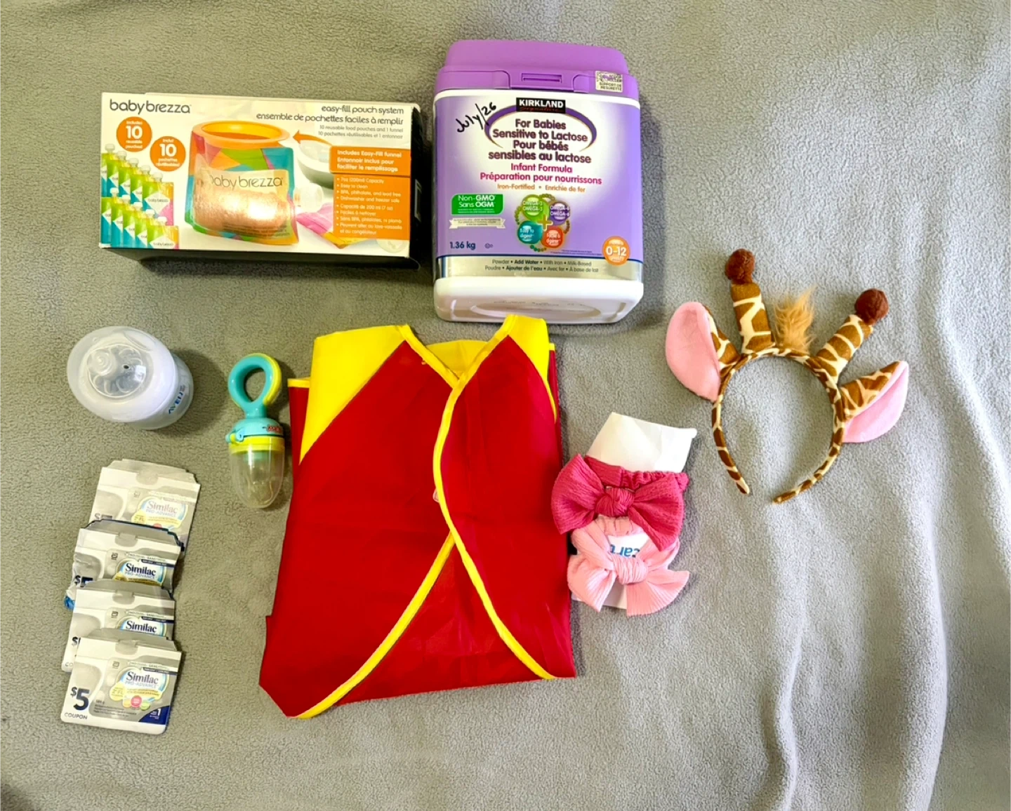 Selling a bundle of baby items including Baby Brezza refill pouches (10 count), Kirkland baby formula for sensitive tummies, Similac formula samples, a baby bottle, a fruit feeder, a baby bib, and cute giraffe headband and baby hair accessories! Perfect starter kit for your little one
