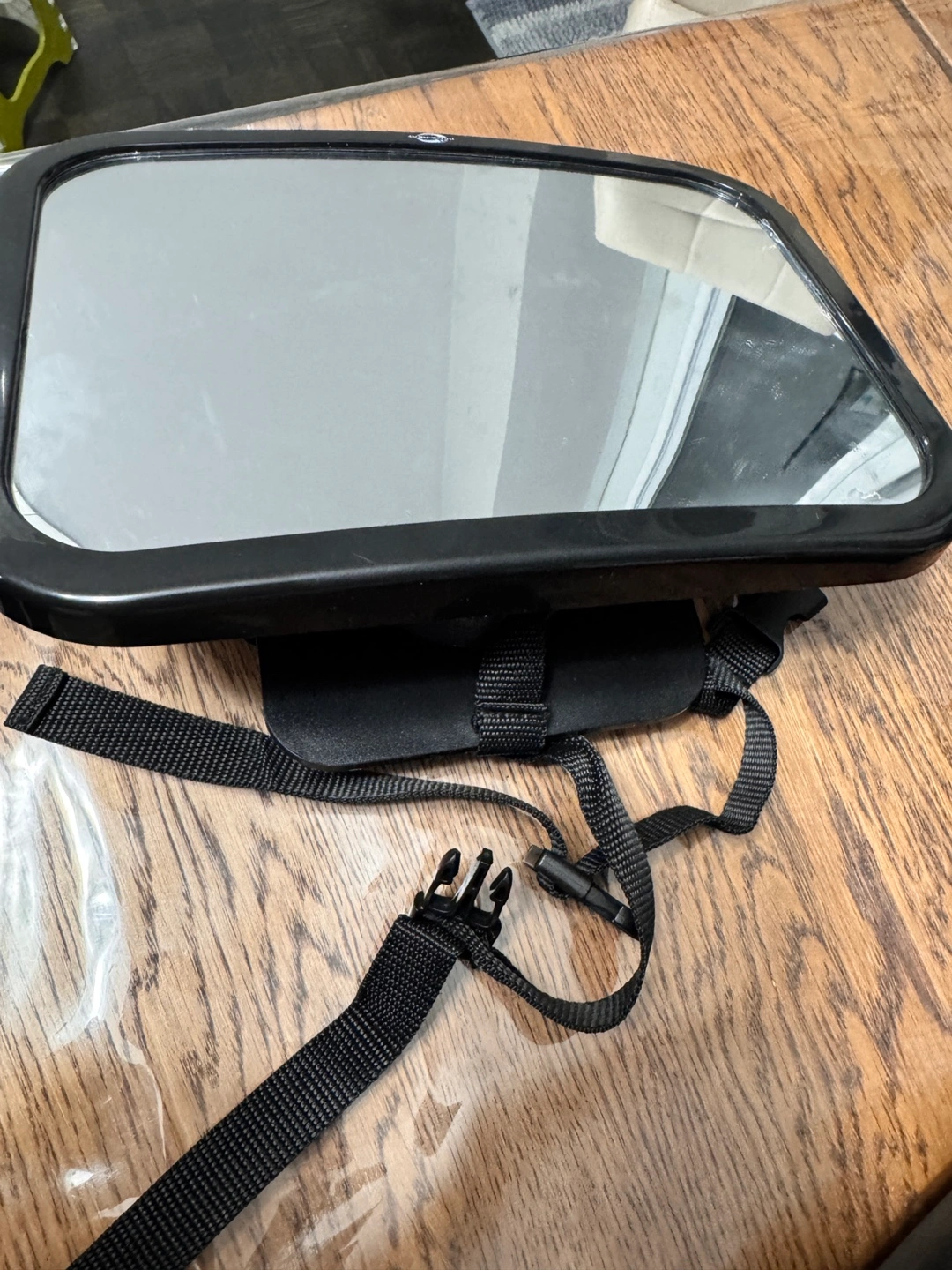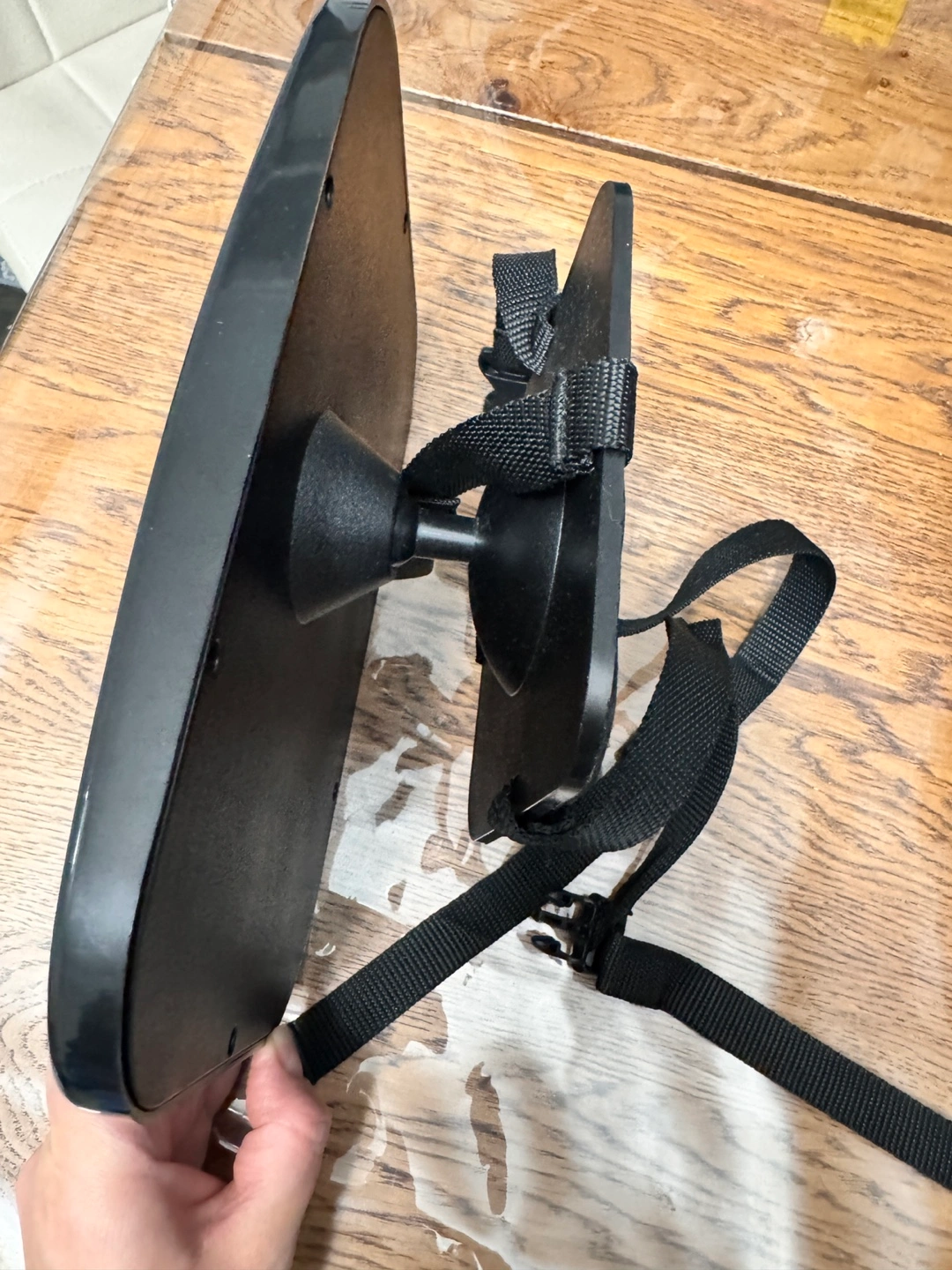 Black plastic frame. Adjustable straps for secure attachment. Large viewing area. Used, good condition.