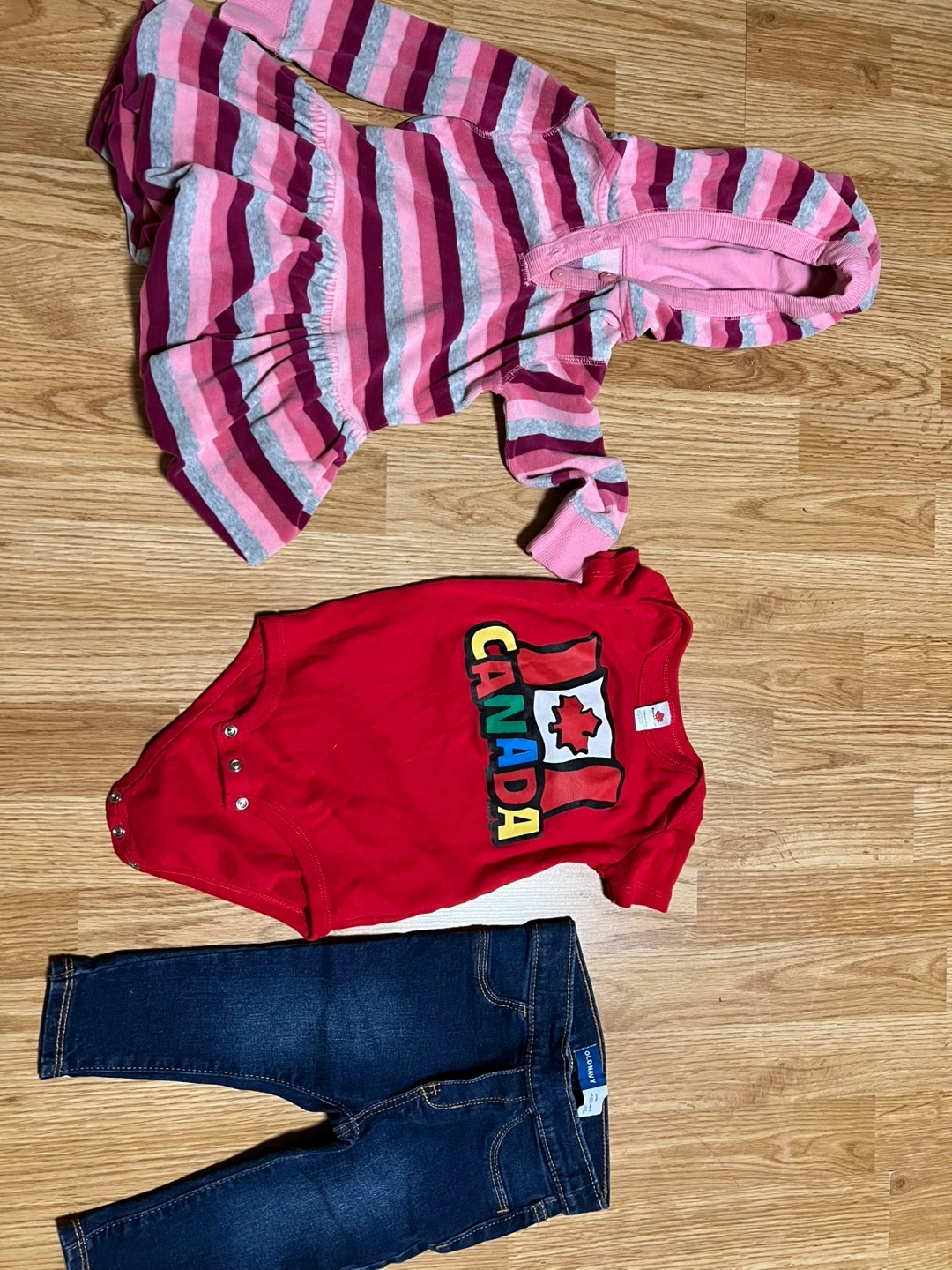 Free a bundle of baby clothes, including: - A striped pink and grey hooded sweater - A red onesie with a Canada flag design - A pair of Old Navy dark wash jeans