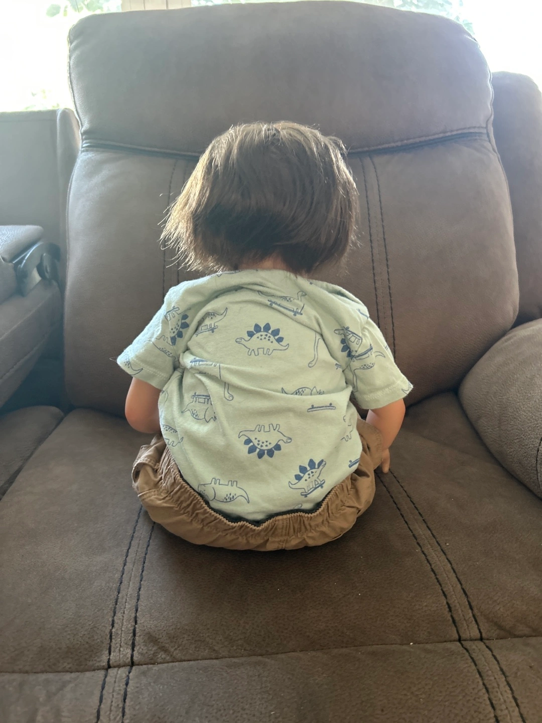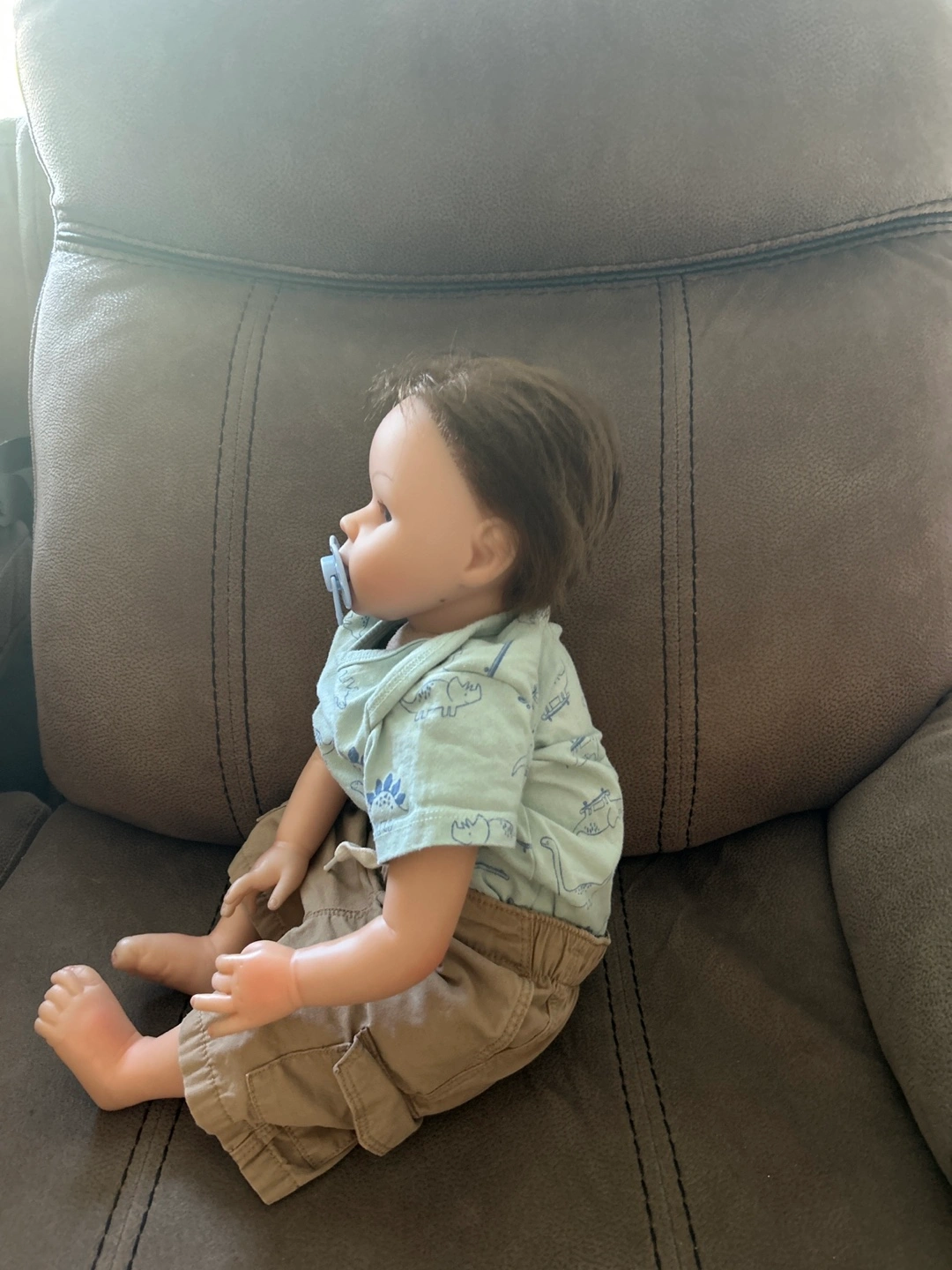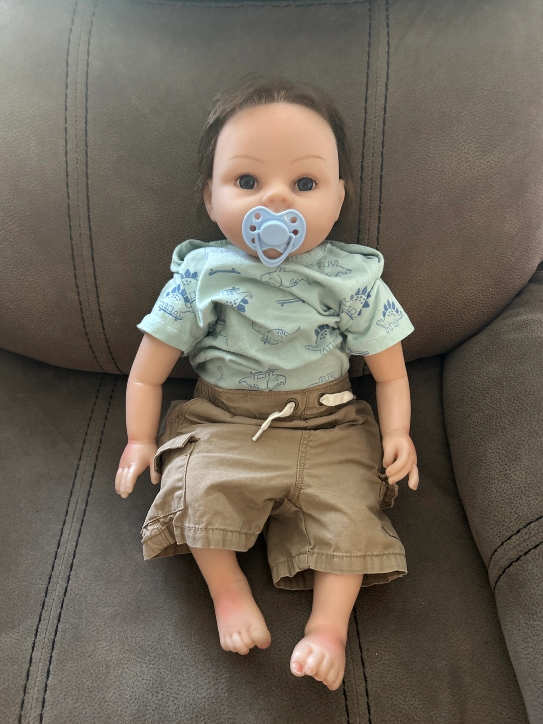 A cute baby doll with a pacifier, ready for a new home! The doll is wearing a light blue shirt with a dinosaur print and khaki shorts. It's in good condition and would be a great addition to any child's toy collection