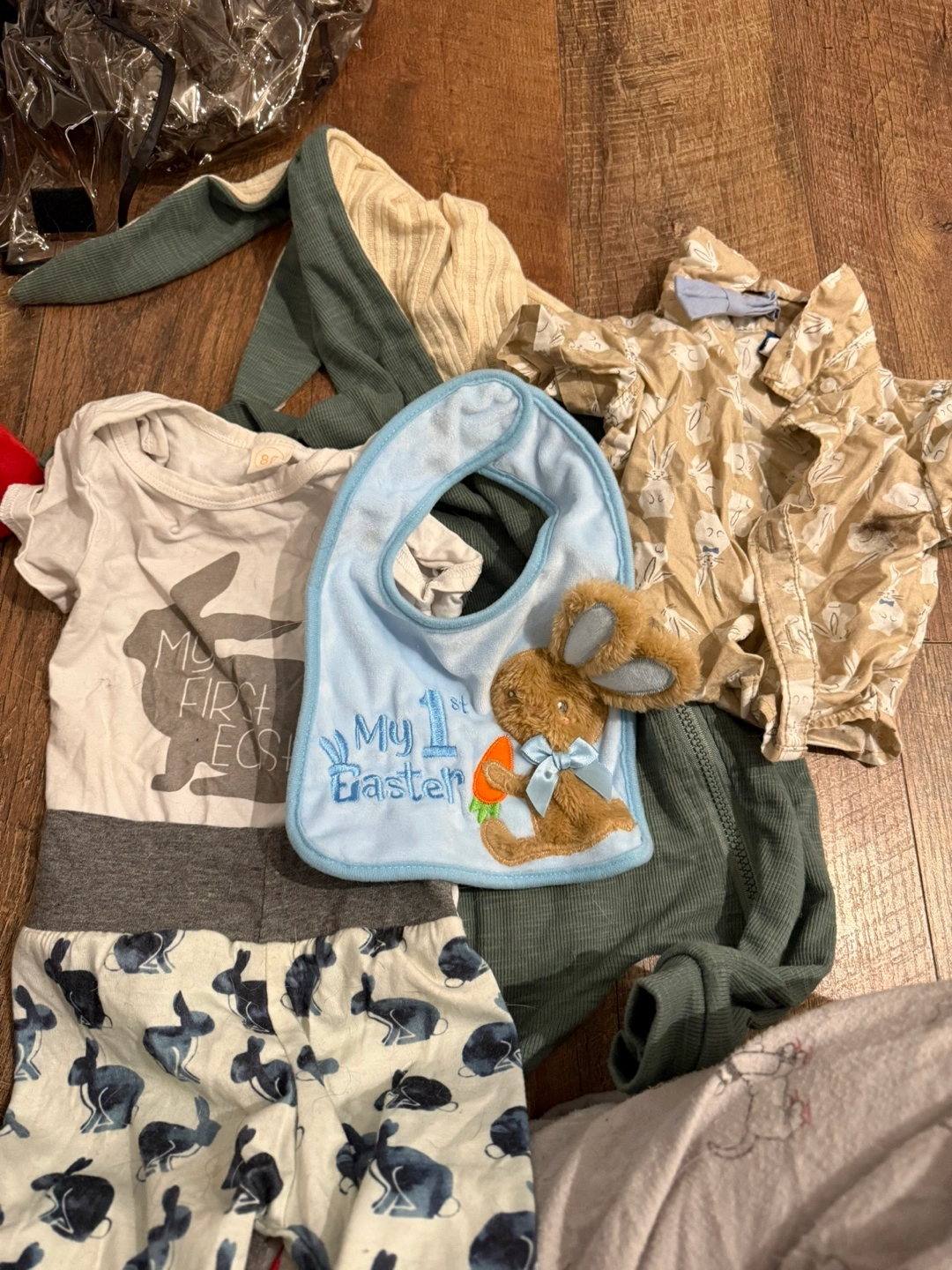 Selling a cute bundle of baby clothes perfect for Easter! Includes a onesie, pants, a bib, and a bunny-ear hat. All in great condition and ready for your little one's spring celebrations