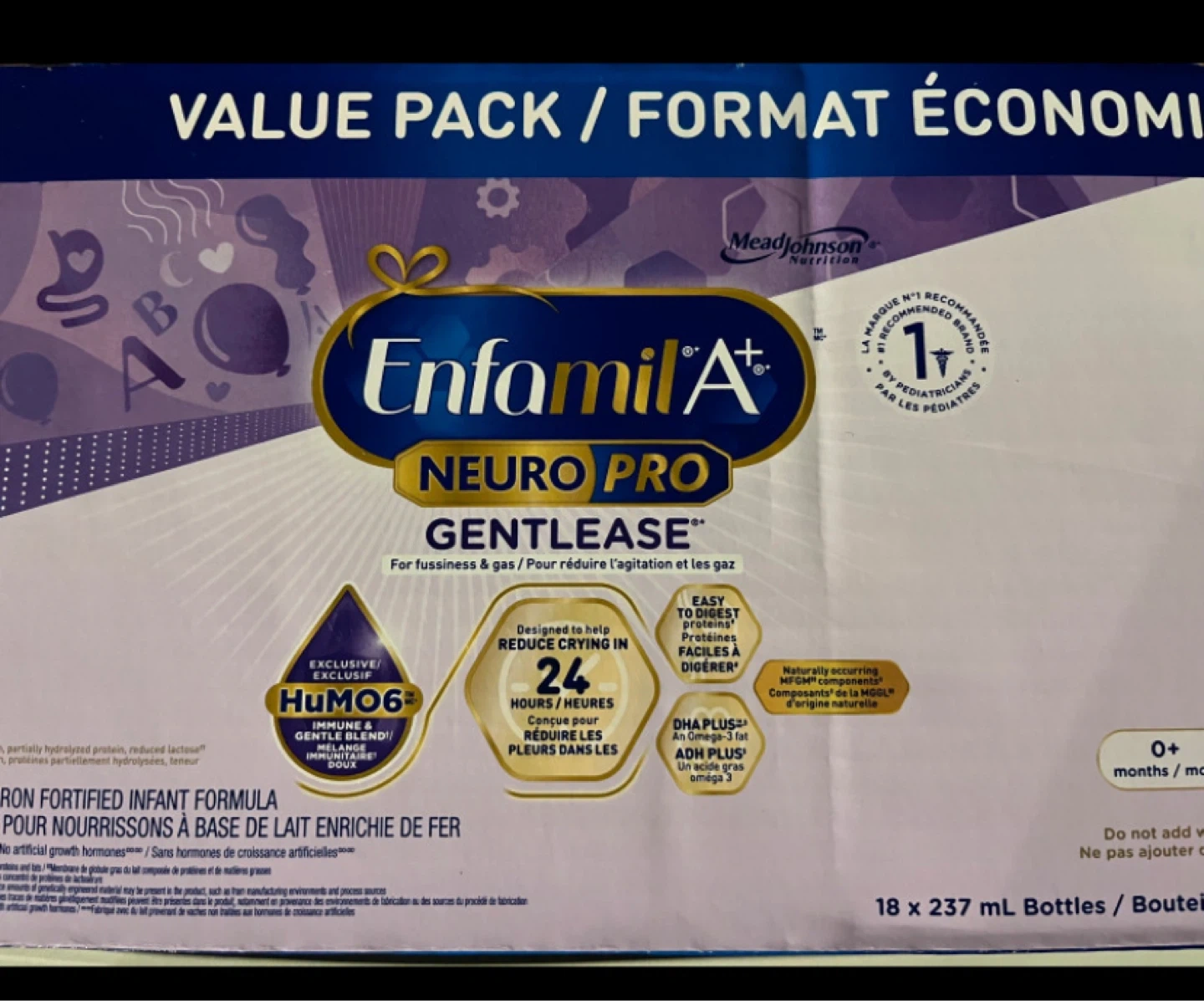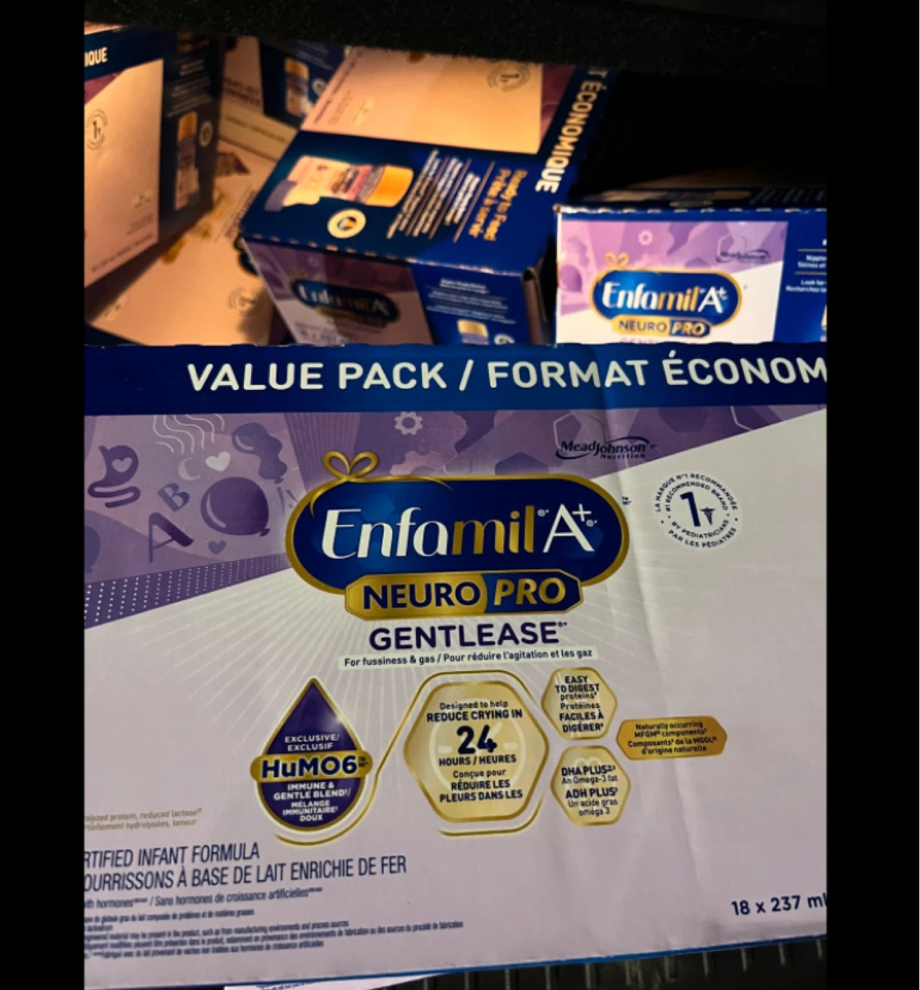 Selling a value pack of Enfamil A+ NeuroPro Gentlease formula. This formula is designed to help reduce crying in 24 hours and is easy to digest. It contains naturally occurring MFGM components, DHA, and ADH. Perfect for little ones with fussiness and gas! Ready to feed Delivery available