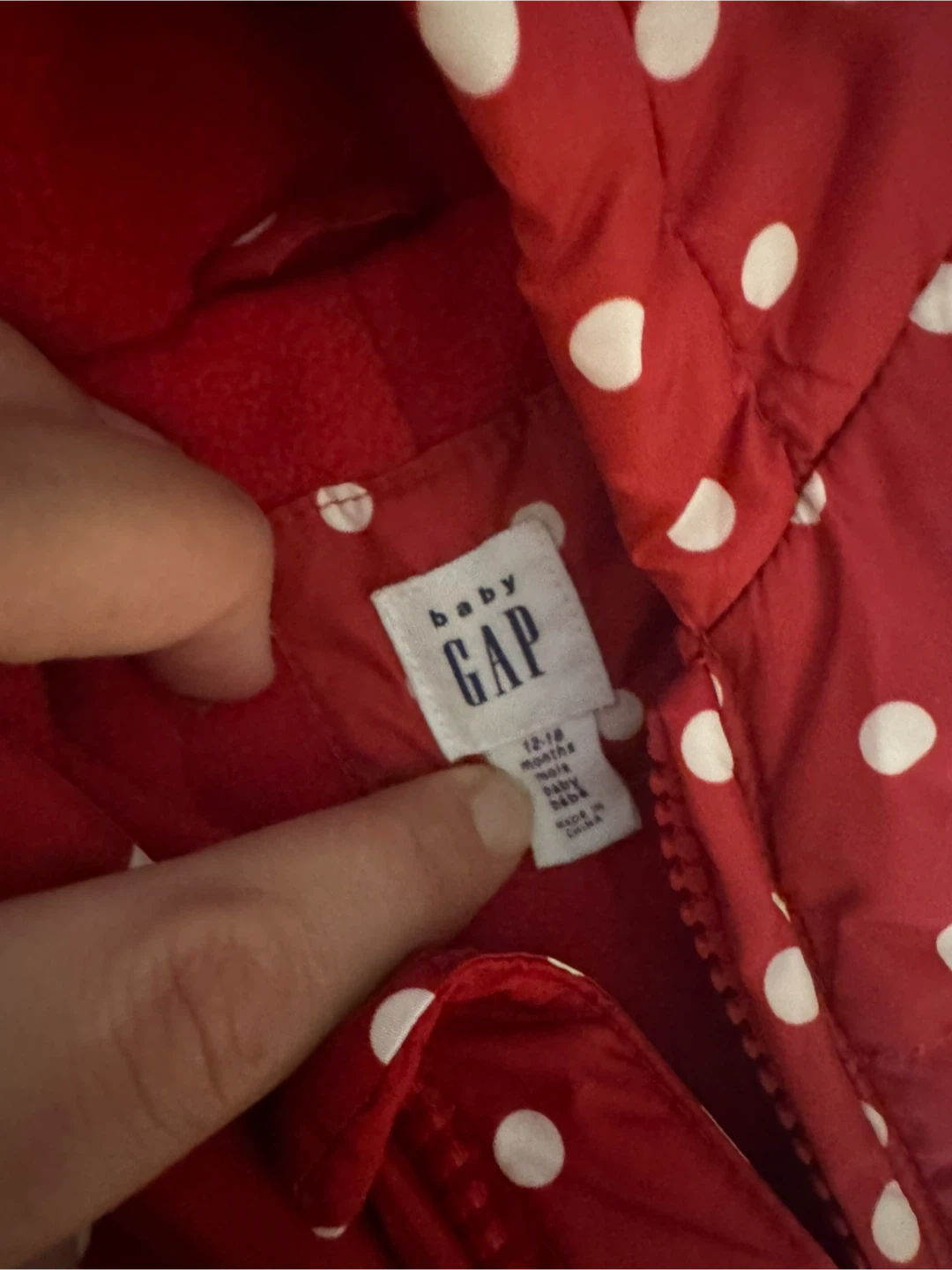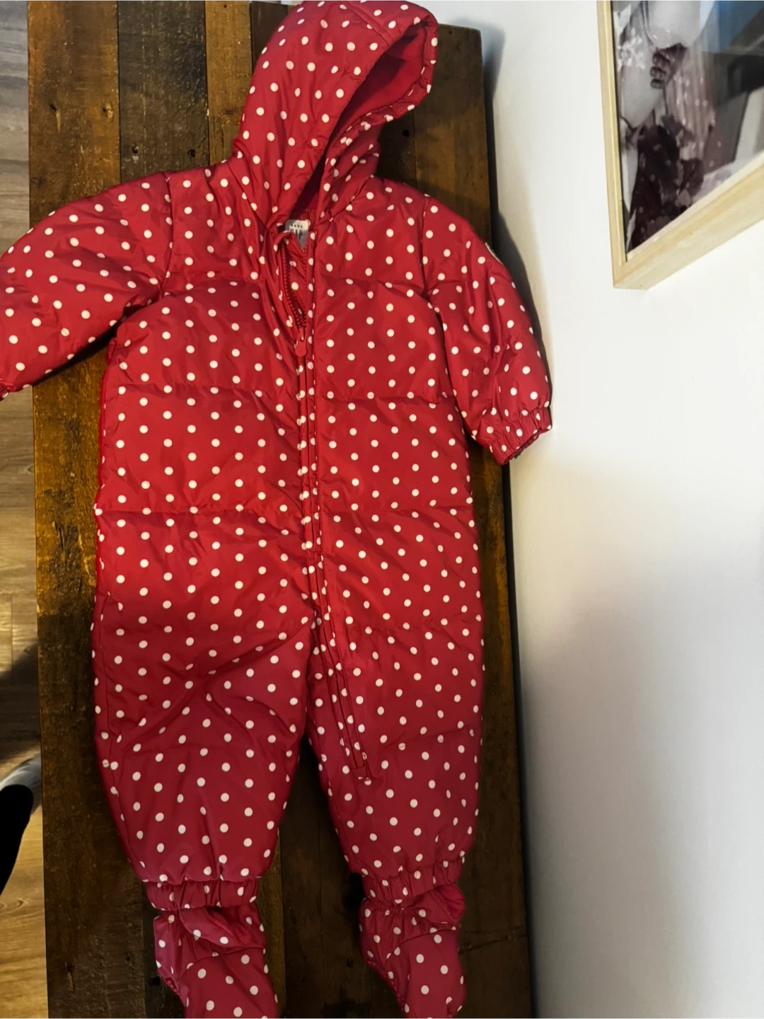 A cute red polka dot snowsuit from Baby Gap. It's sized for 12-18 months and perfect for keeping your little one warm and cozy this winter