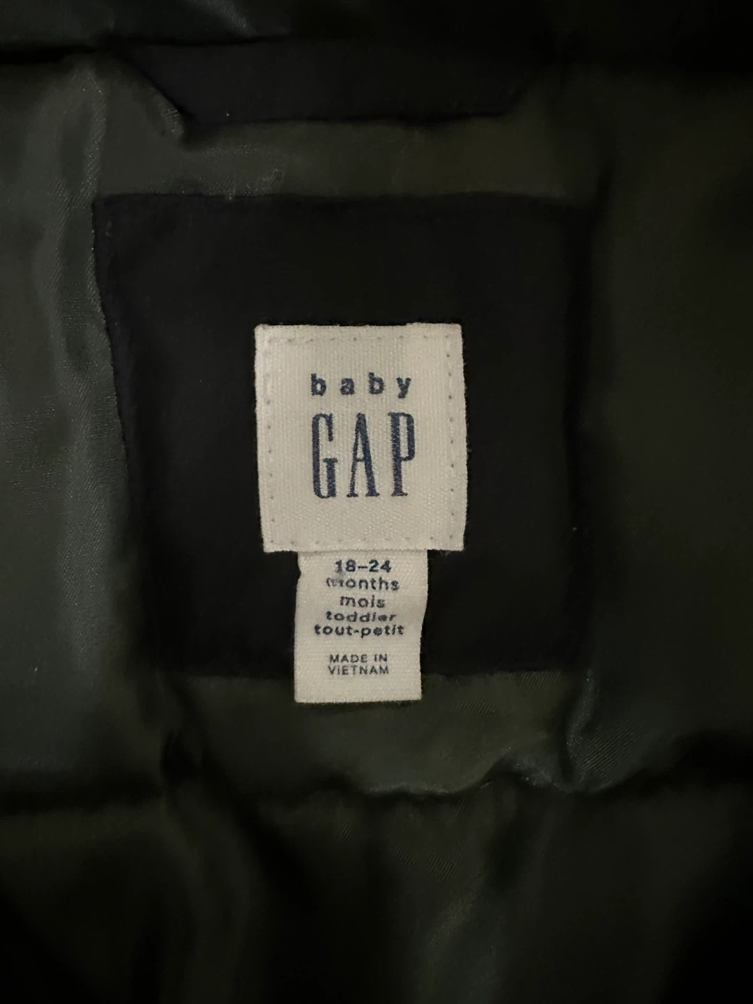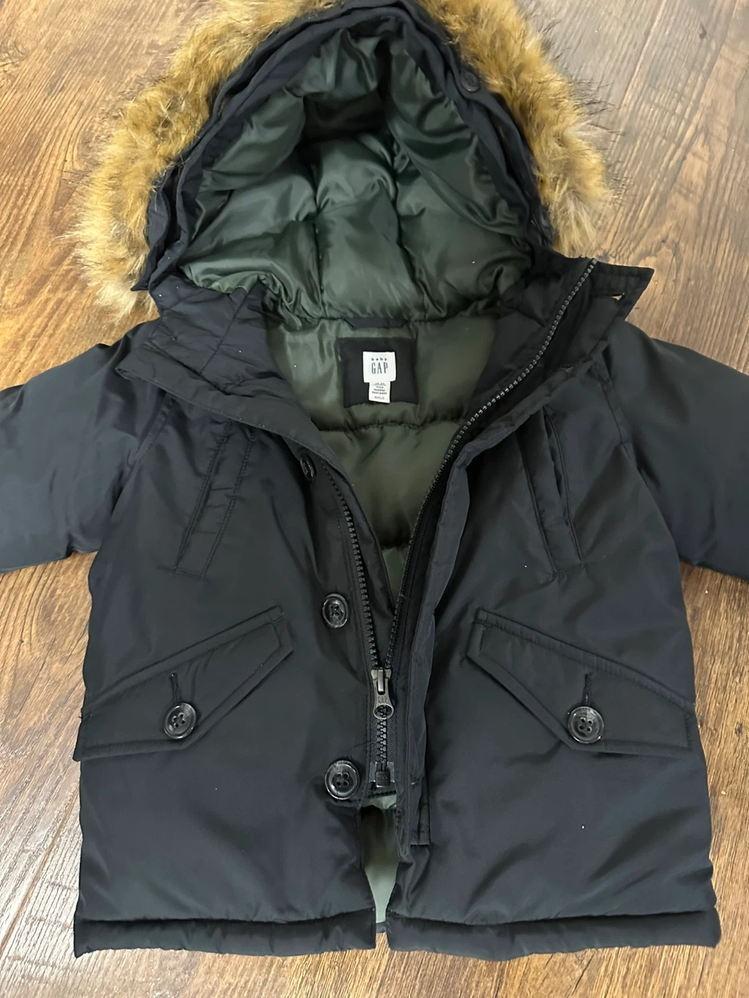 Selling a Baby GAP winter jacket, perfect for keeping your little one warm! The size is 18-24 months. It features a hood with faux fur trim and a button-up front. Great for the cold weather!