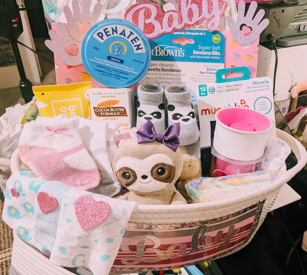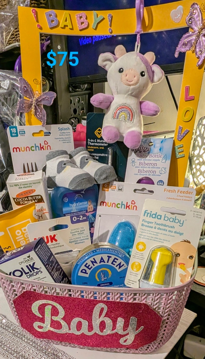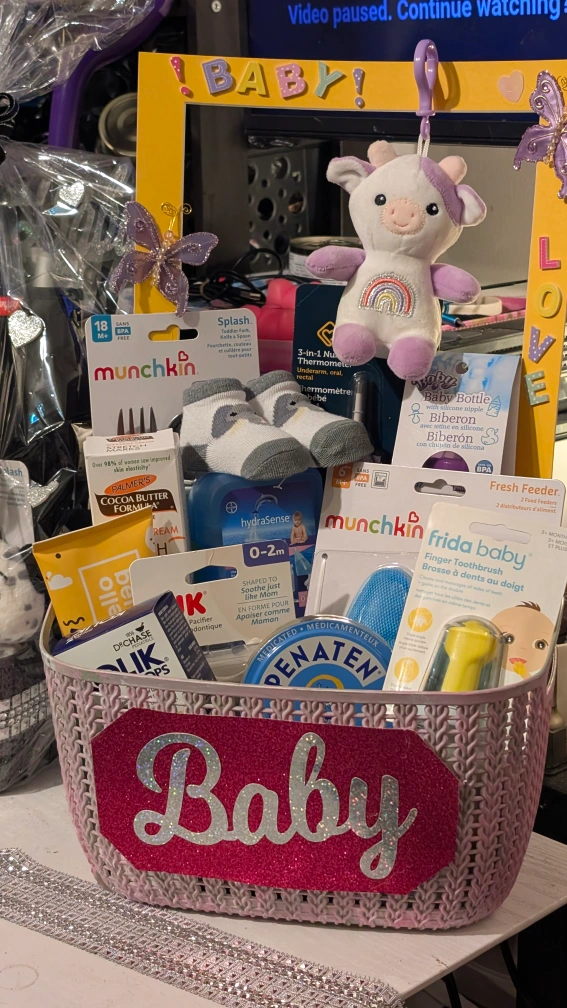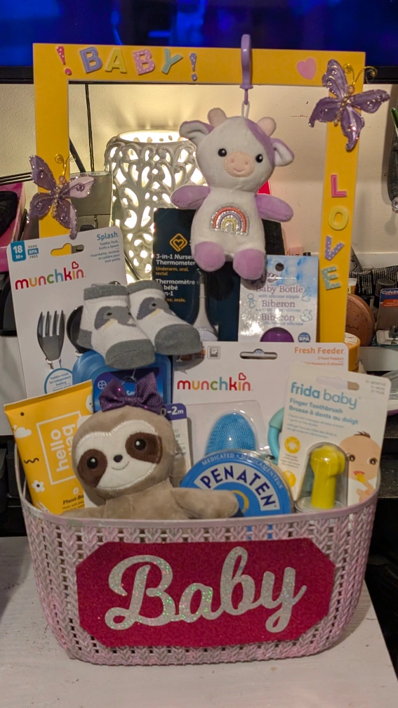 This adorable baby gift basket is filled with a variety of useful items for a new baby! It includes products from brands like Munchkin and Frida Baby, plus cute socks and a soft plush toy. Perfect as a thoughtful gift for a baby shower or newborn.