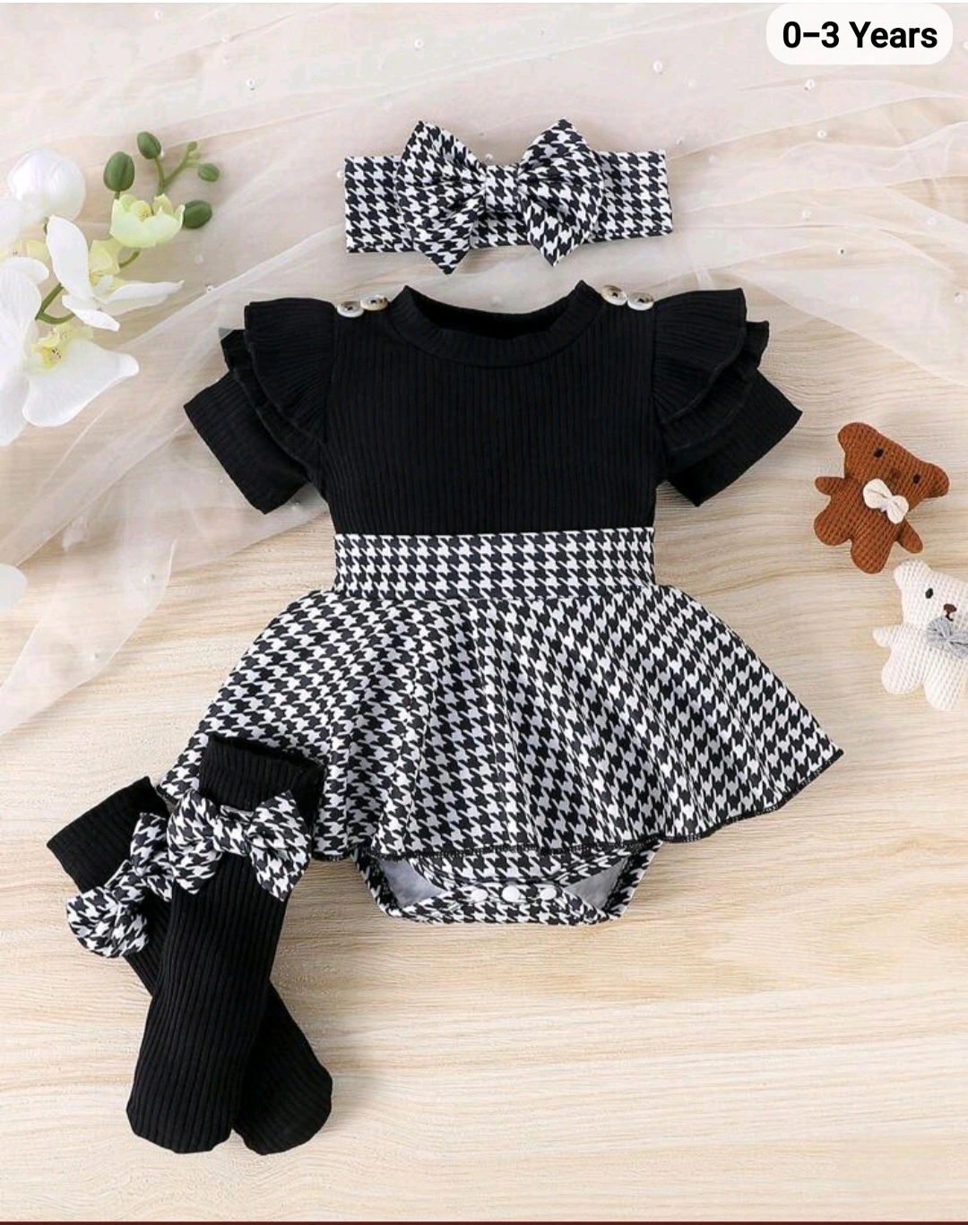 Adorable baby girl outfit in black and white houndstooth pattern! This cute set includes a bodysuit with a skirt, matching socks, and a headband. Recommended for ages 0-3 years. Perfect for your little one!