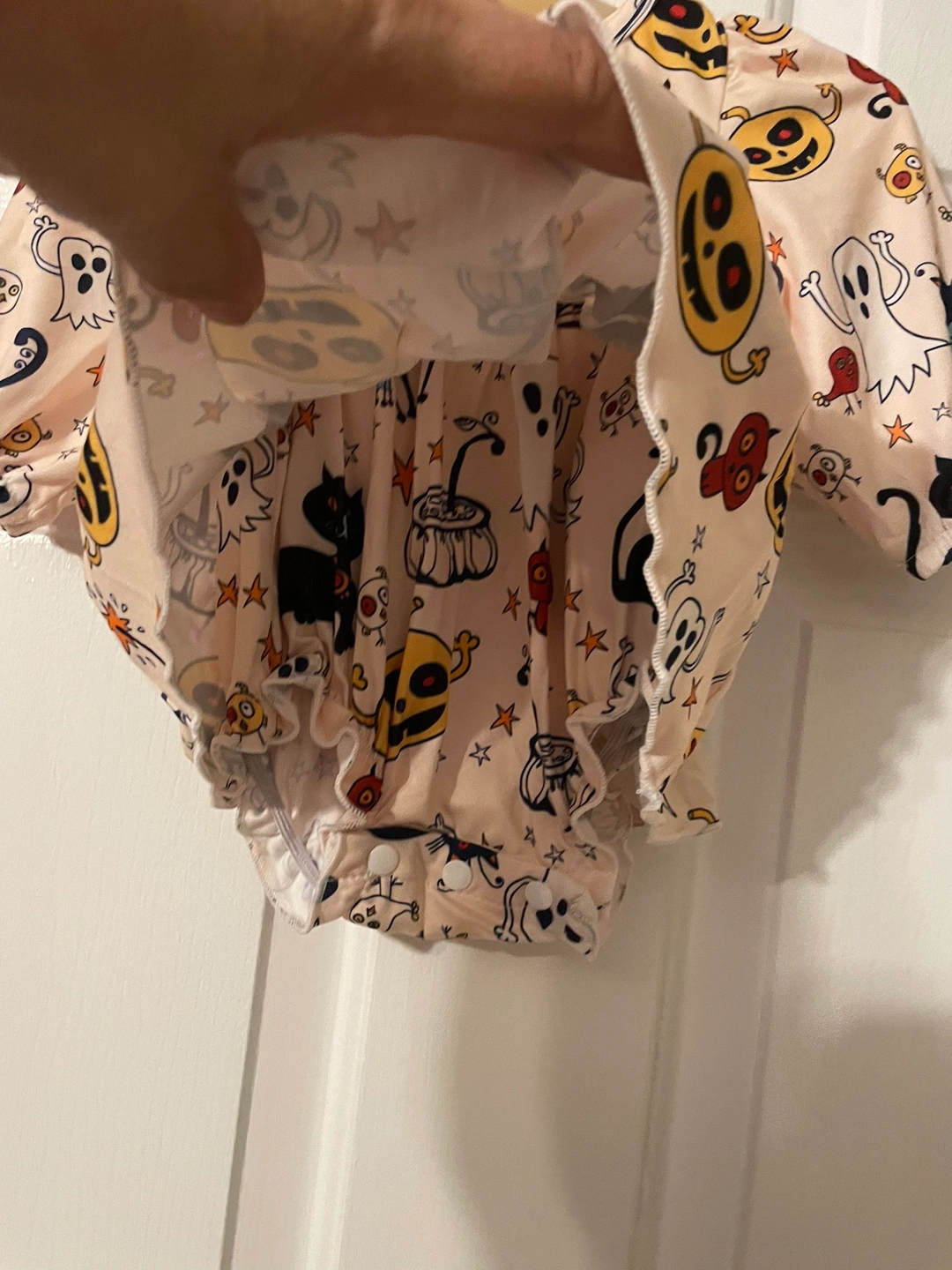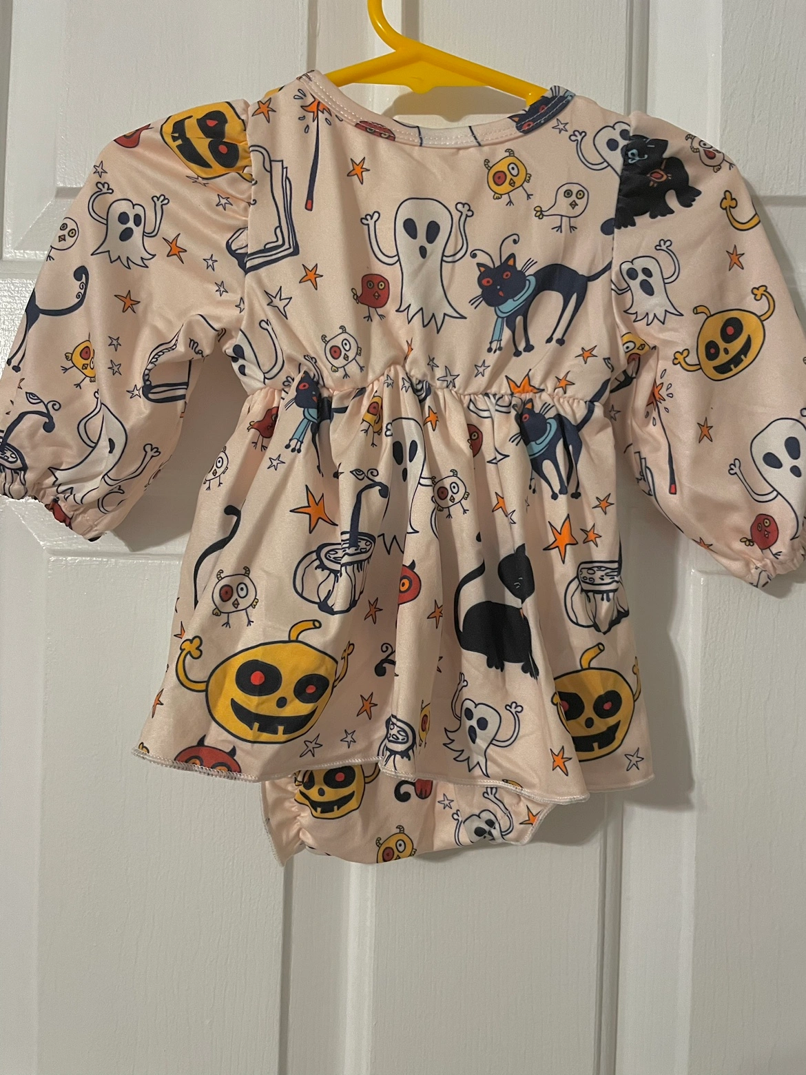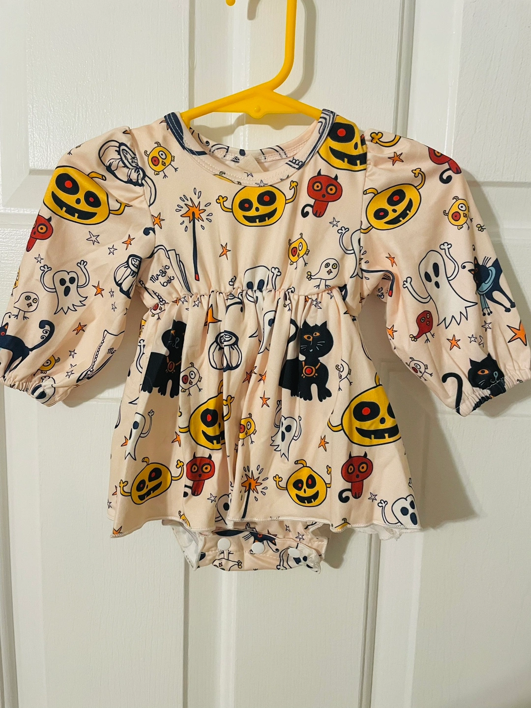 Adorable Hallelujah baby dress with onesie attached. Featuring pumpkins, ghosts, cats, and stars. It has long sleeves and a gathered skirt. The dress is made from a soft and comfortable material. Size 1-6months.